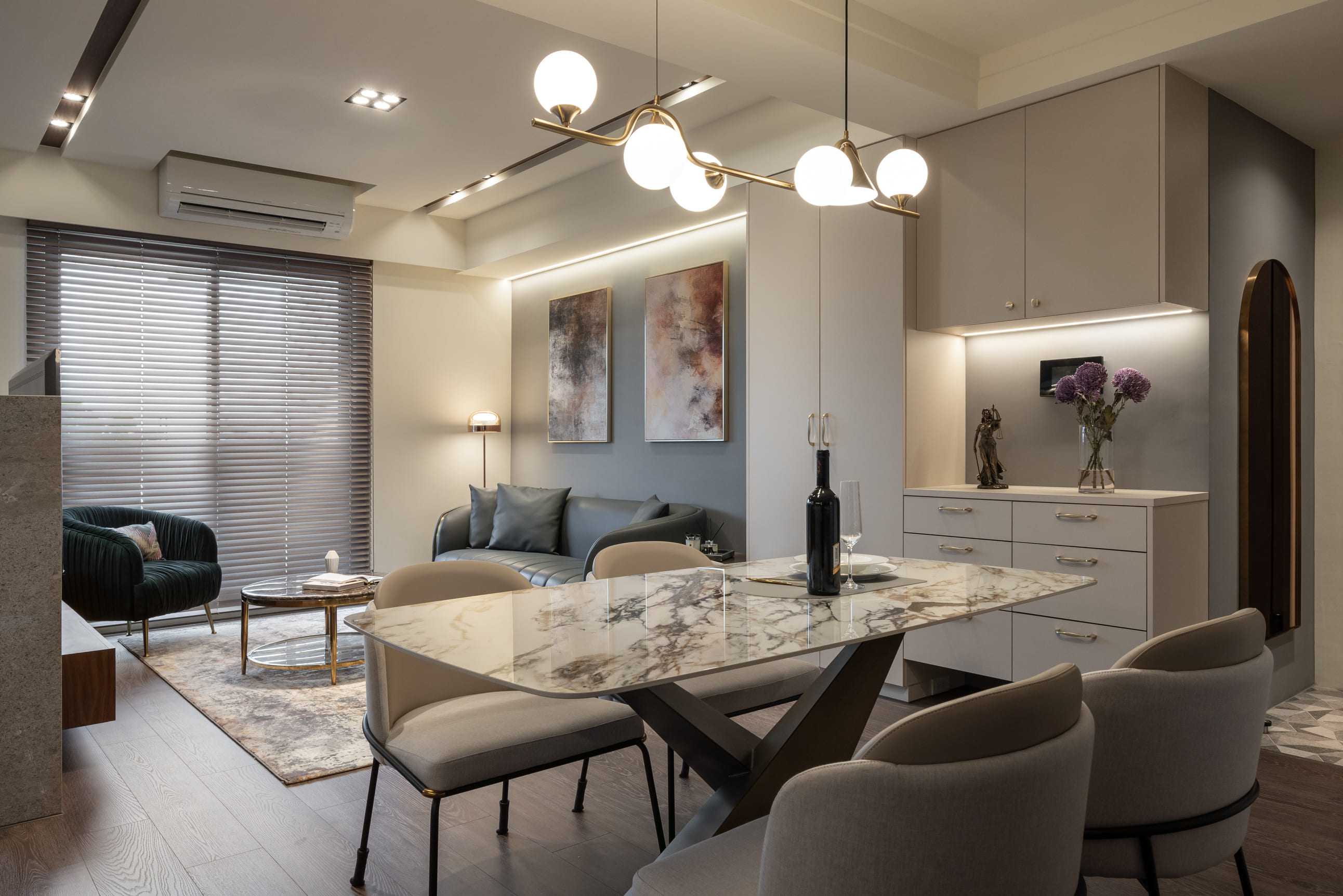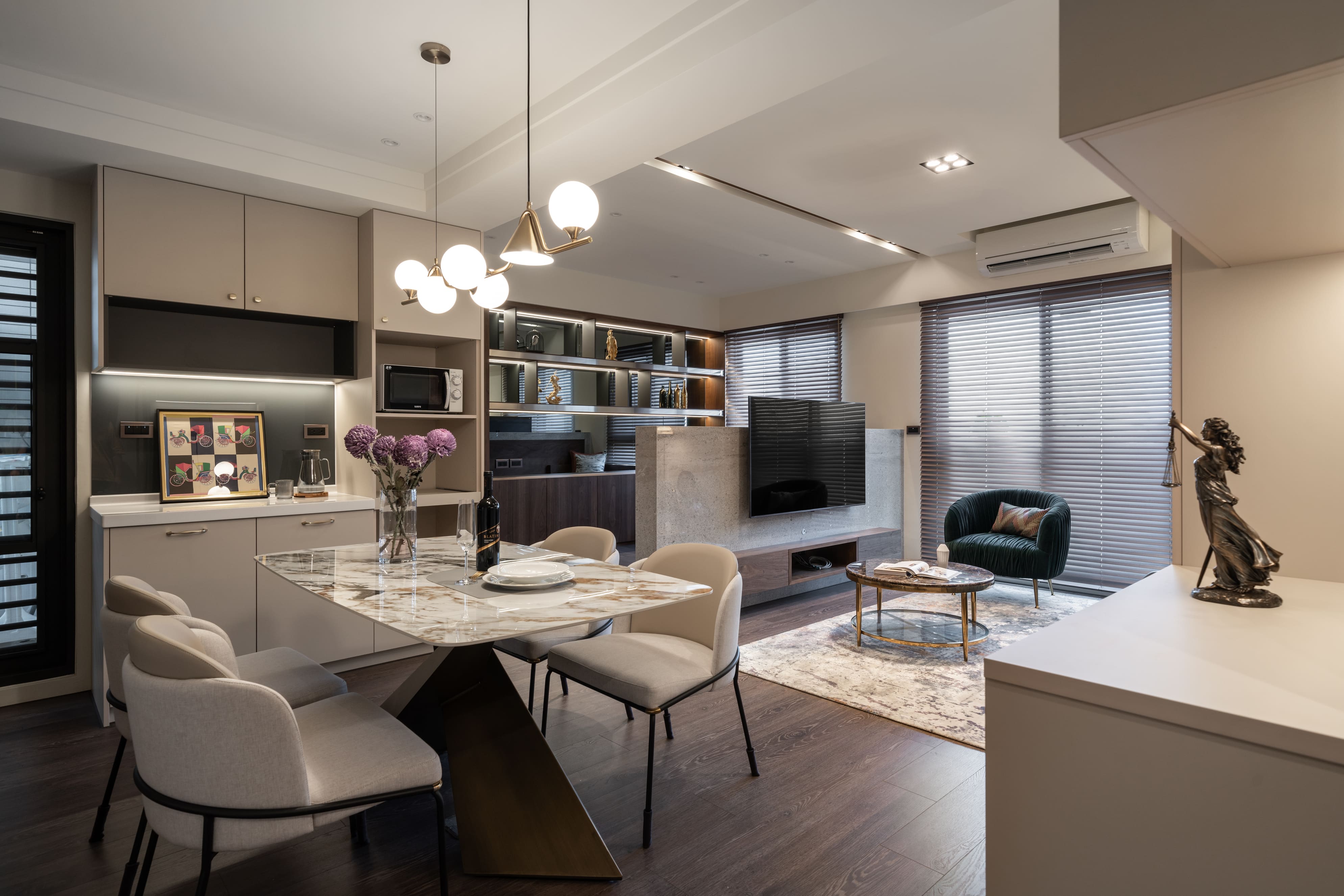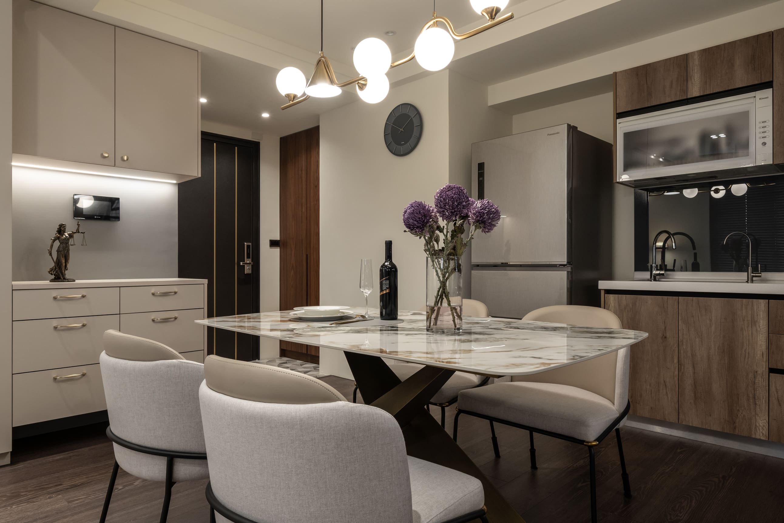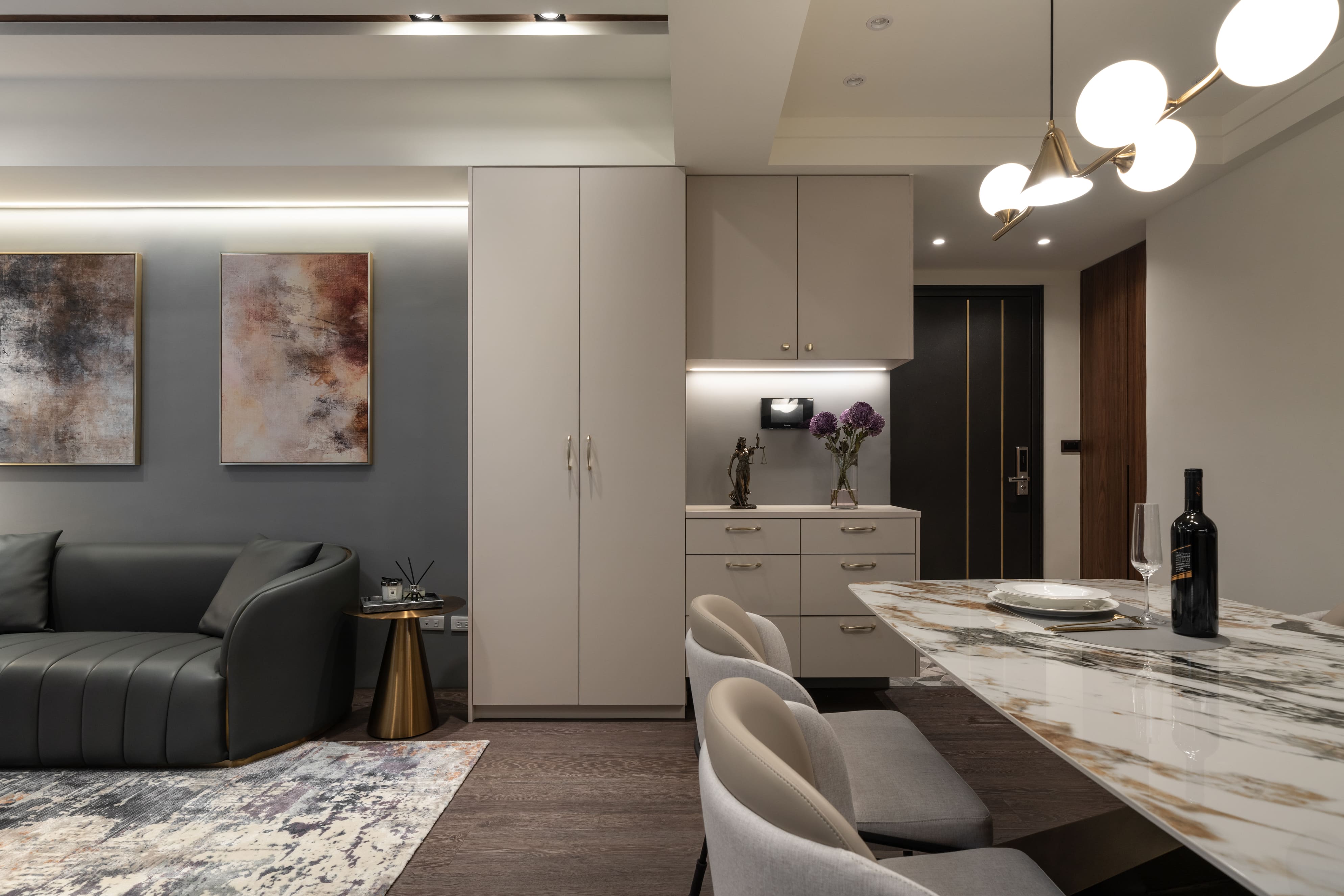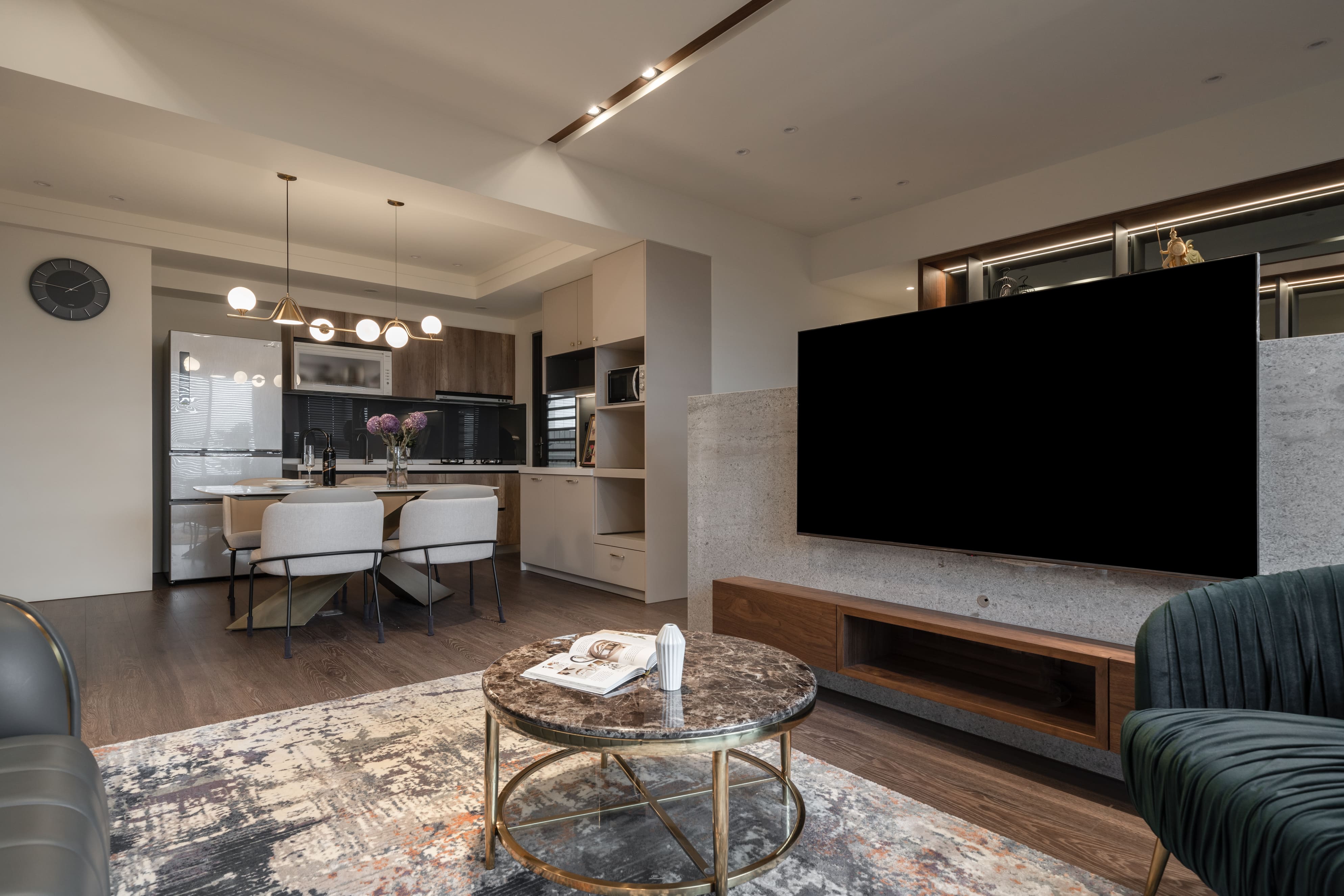 主要材料|大理石、系統櫃體、木皮、不鏽鋼板、黑鏡、超耐磨木地板
