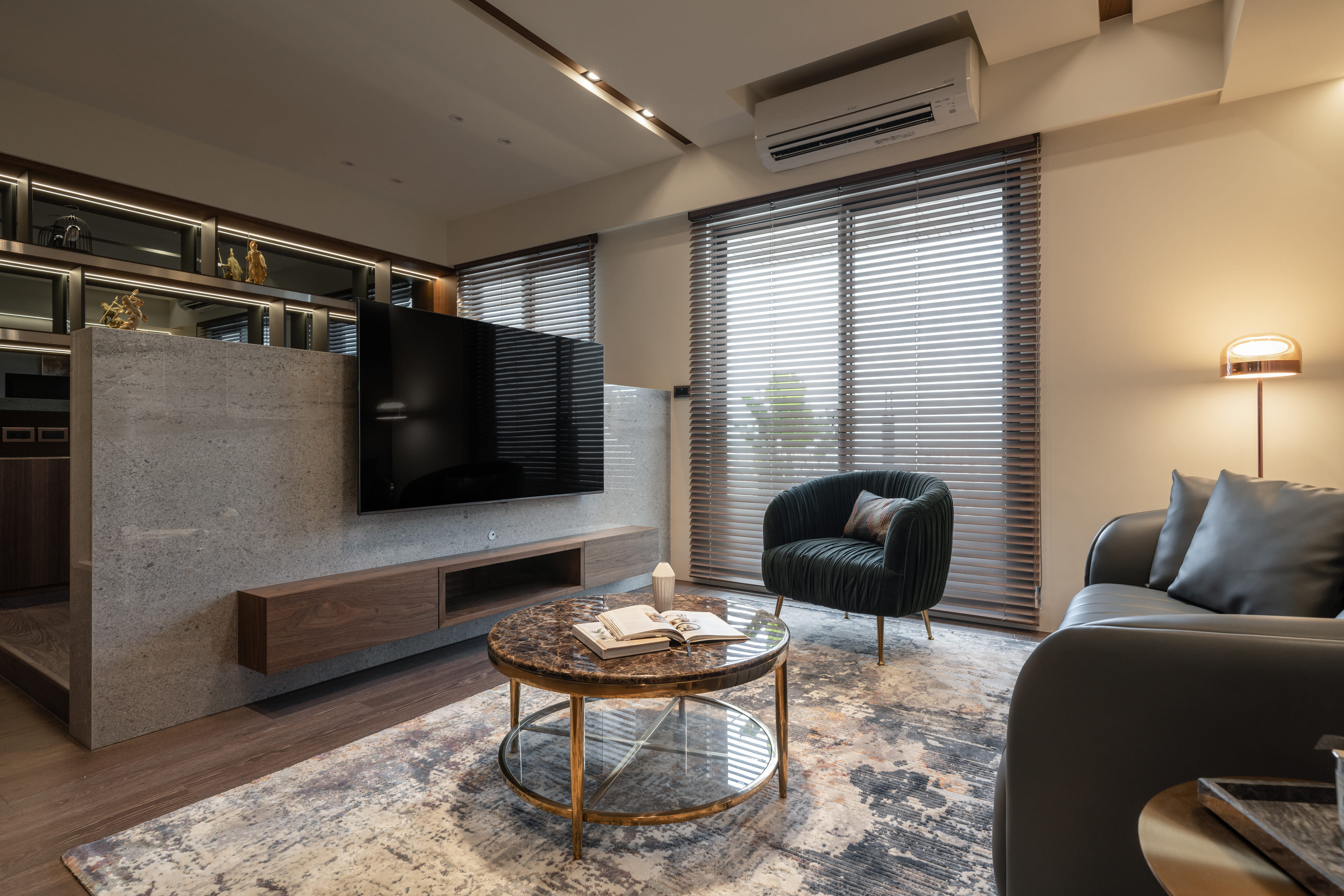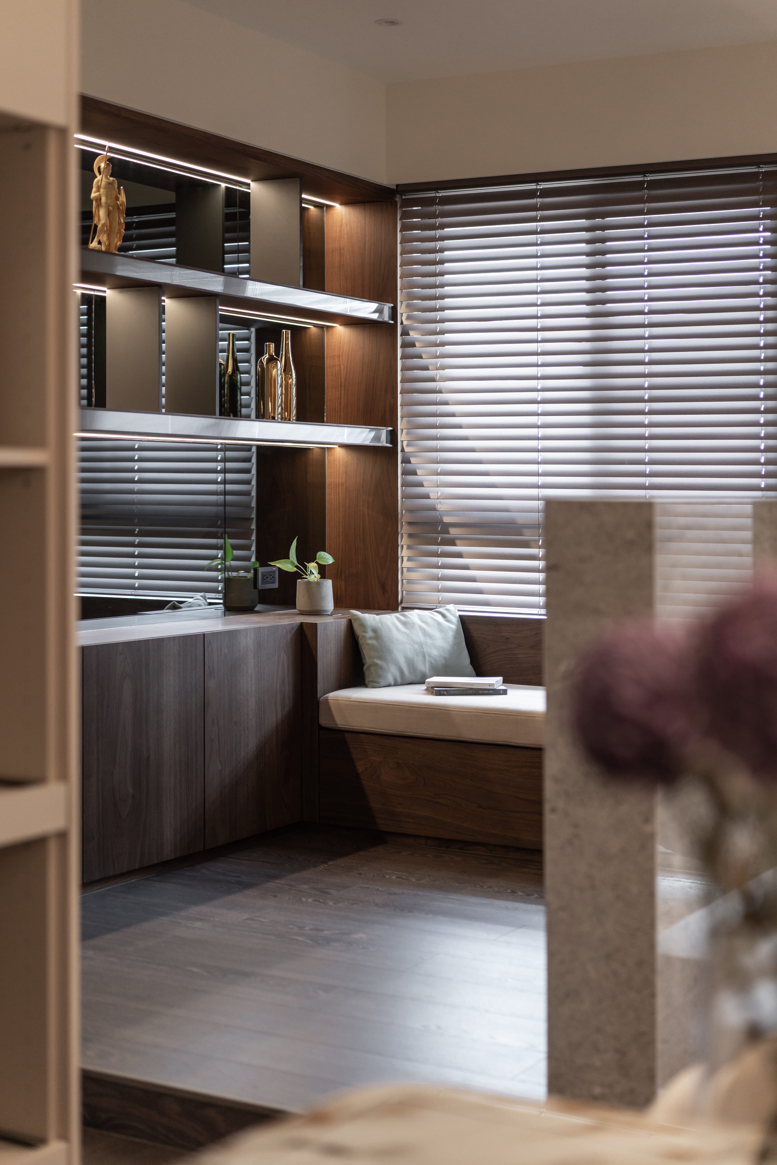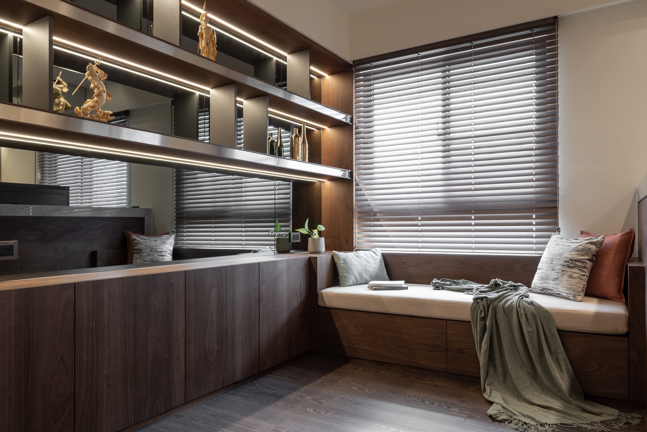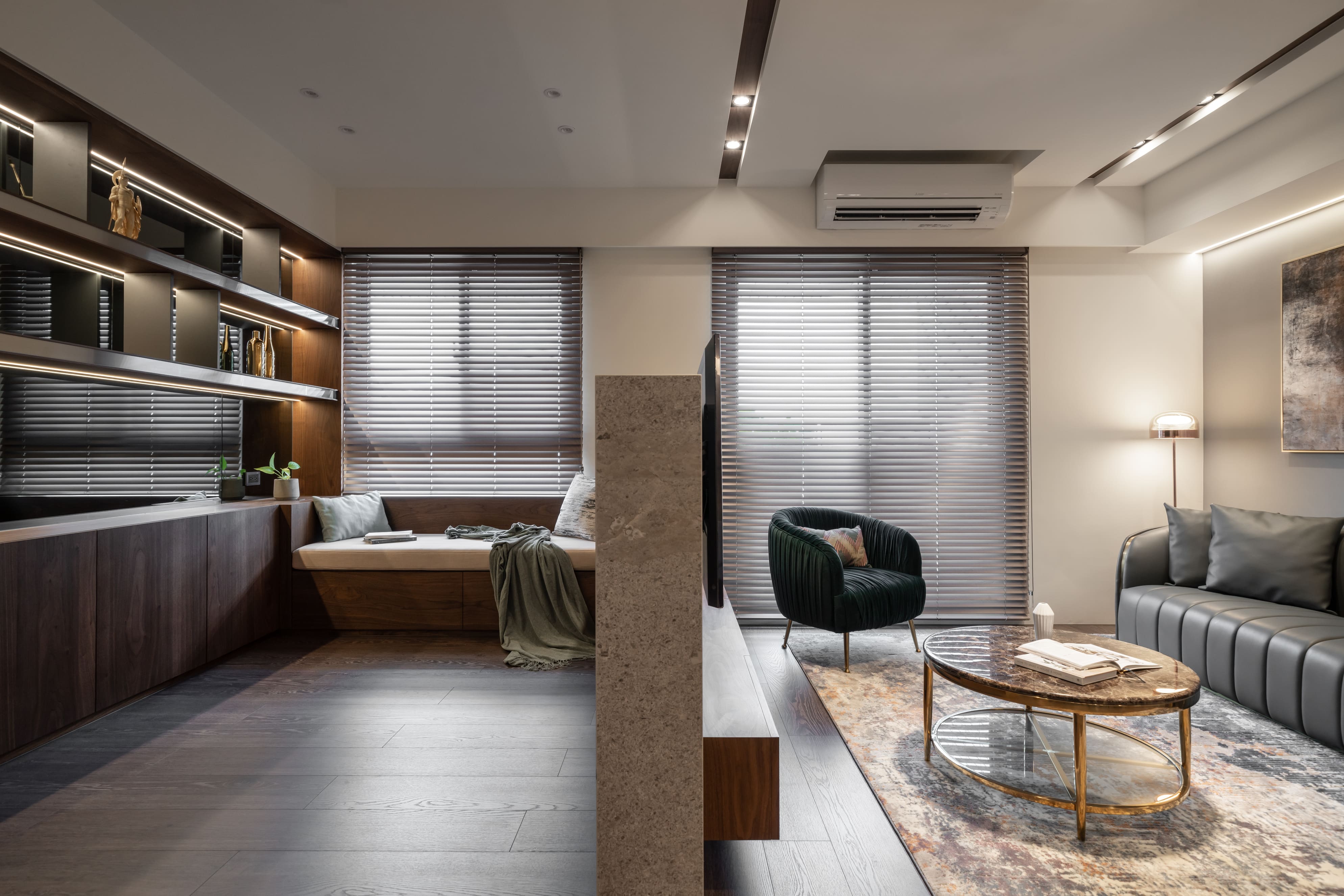 深胡桃木與半高灰石牆成就了空間的沉著高雅,木色相襯了鏡面映照與反射,光照下的層架處處是藝術氣息,配上一本書一杯茶,坐臥在窗邊上享受平靜午後時光,如雕塑品彼此各據一角又和平共處;燈光引著金屬邊框散發出漫射,石材質感呈現油光晶亮,是否已帶你回到曾經下榻某間旅店的怡然自得,而這是我們對待生活的儀式感。