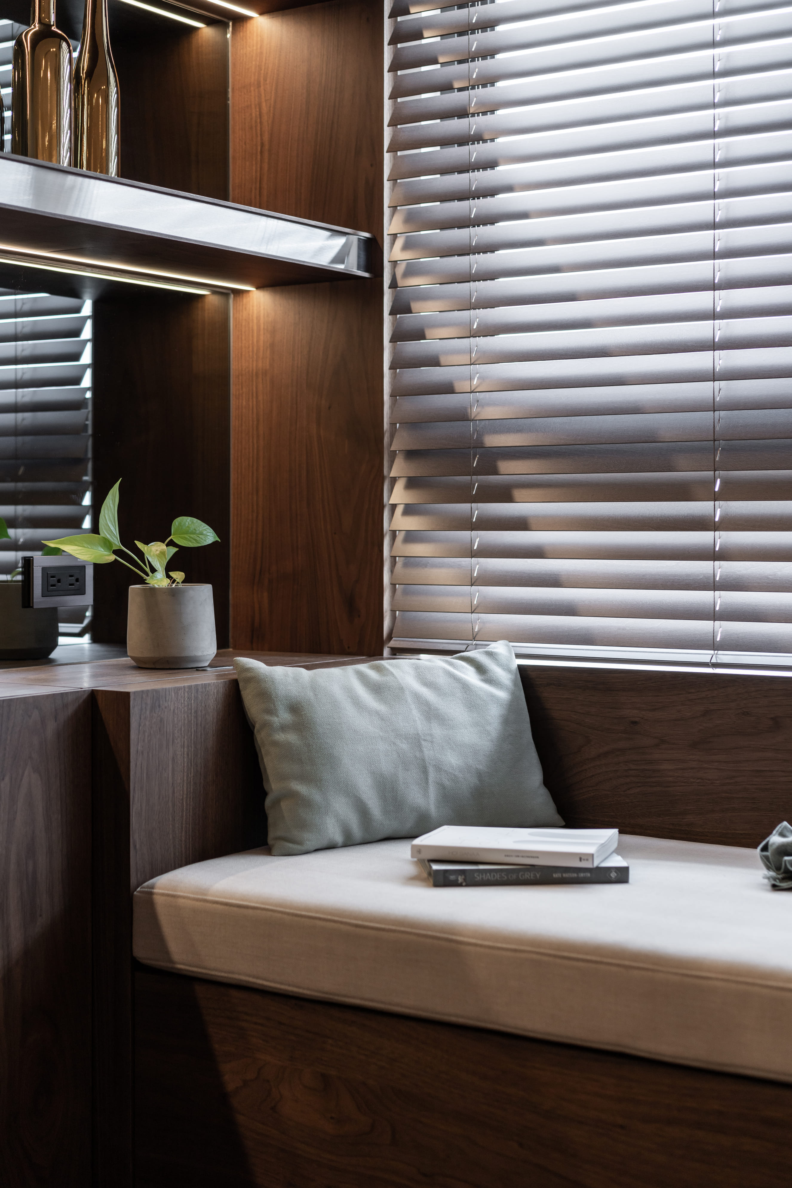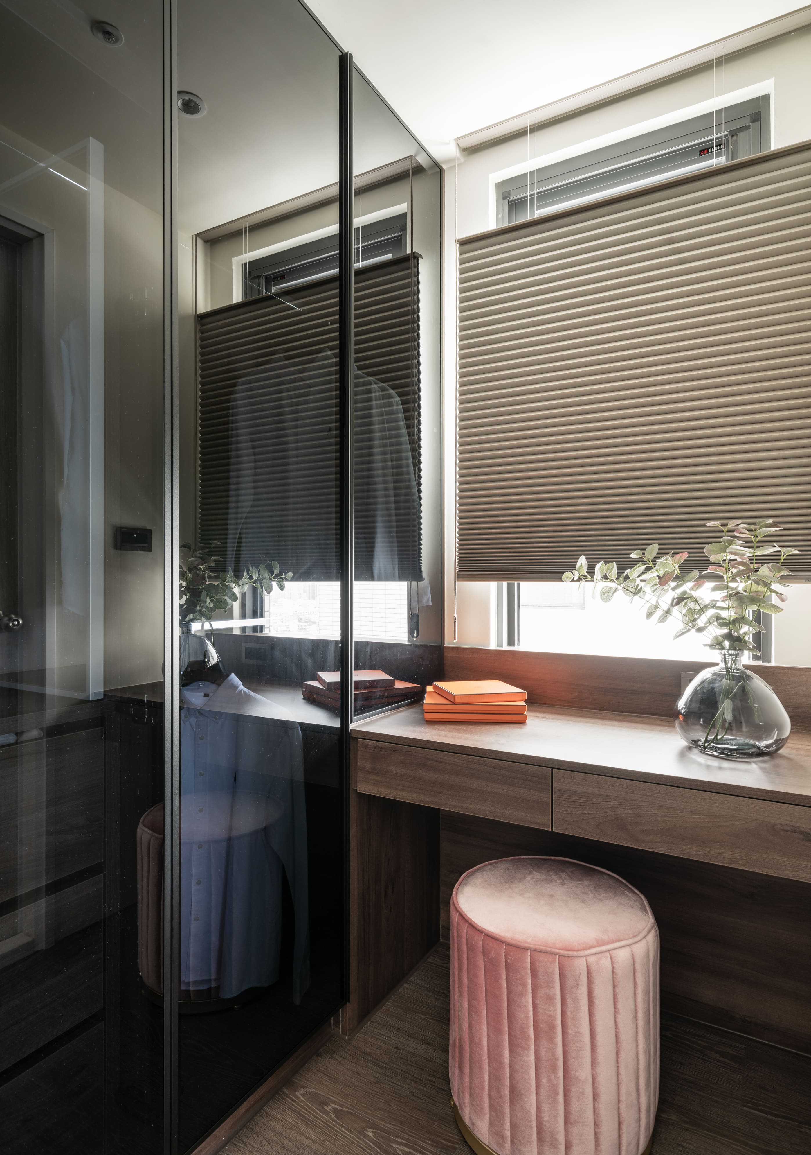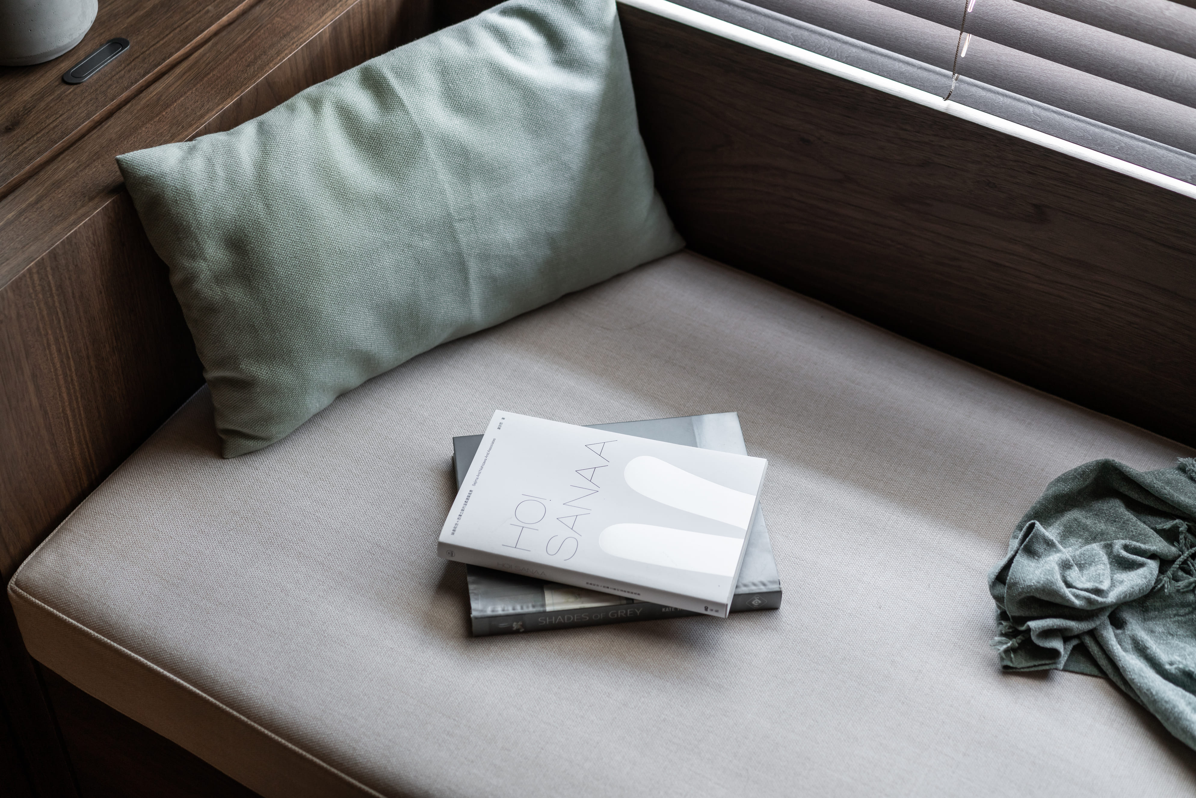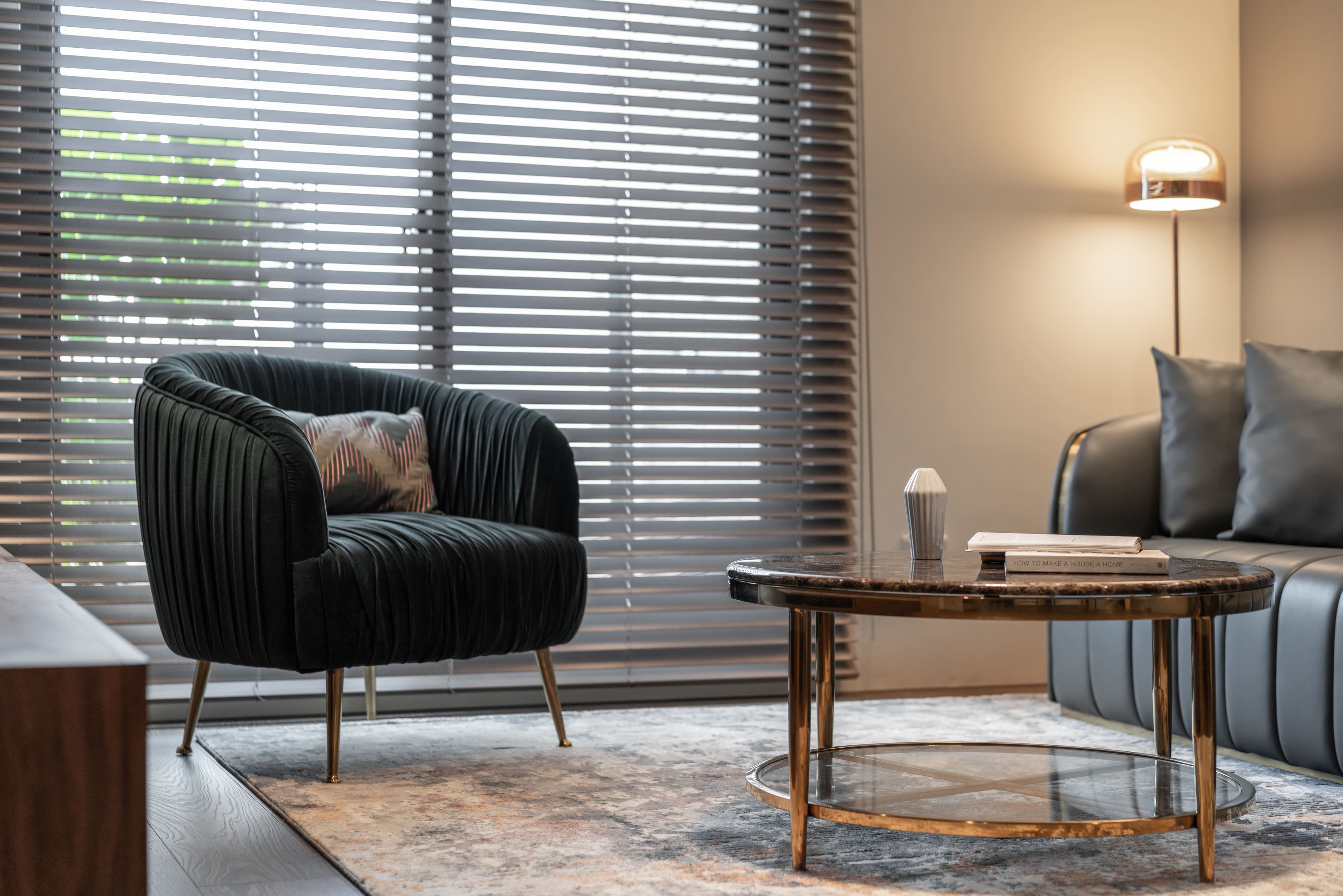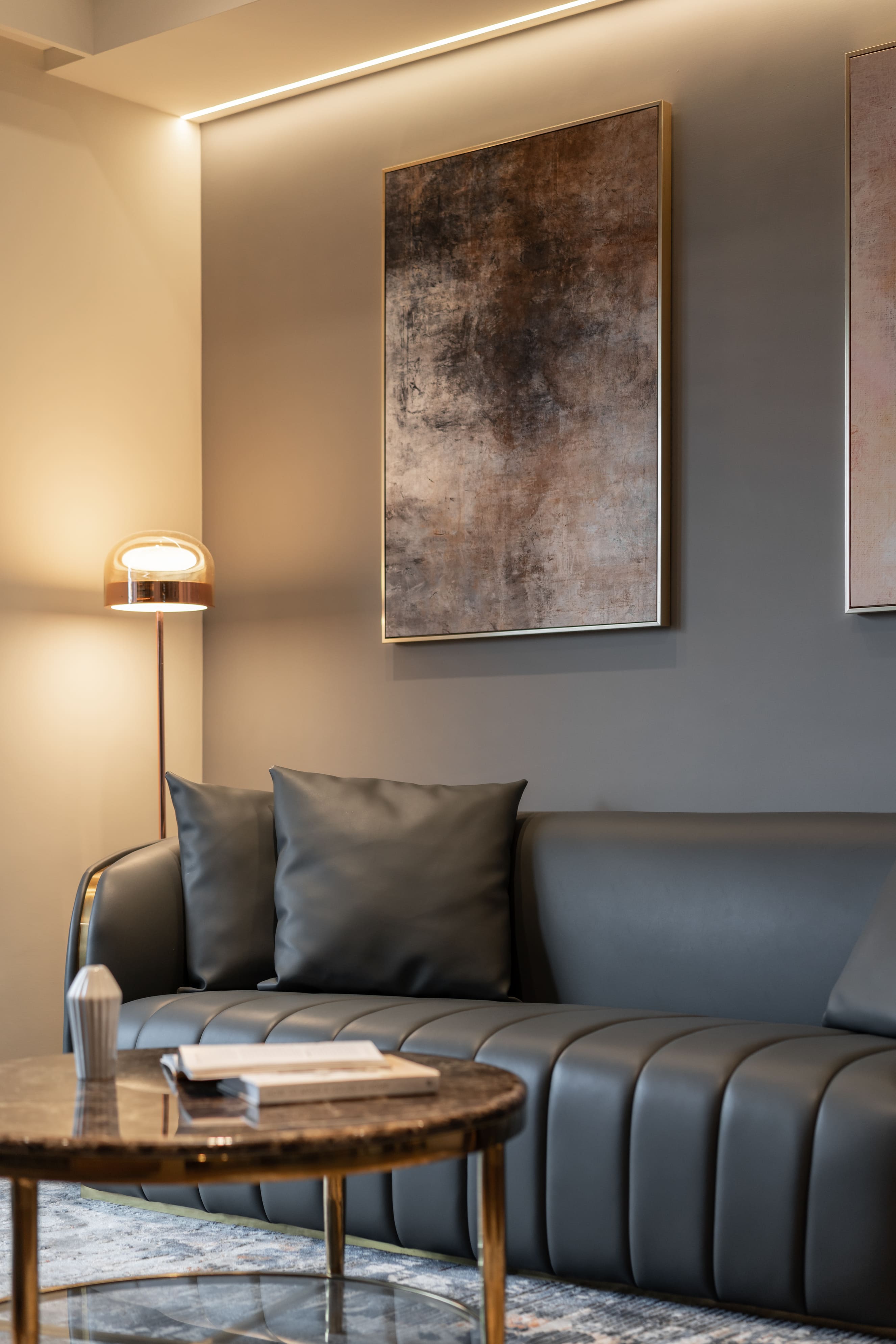 深胡桃木與半高灰石牆成就了空間的沉著高雅,木色相襯了鏡面映照與反射,光照下的層架處處是藝術氣息,配上一本書一杯茶,坐臥在窗邊上享受平靜午後時光,如雕塑品彼此各據一角又和平共處;燈光引著金屬邊框散發出漫射,石材質感呈現油光晶亮,是否已帶你回到曾經下榻某間旅店的怡然自得,而這是我們對待生活的儀式感。