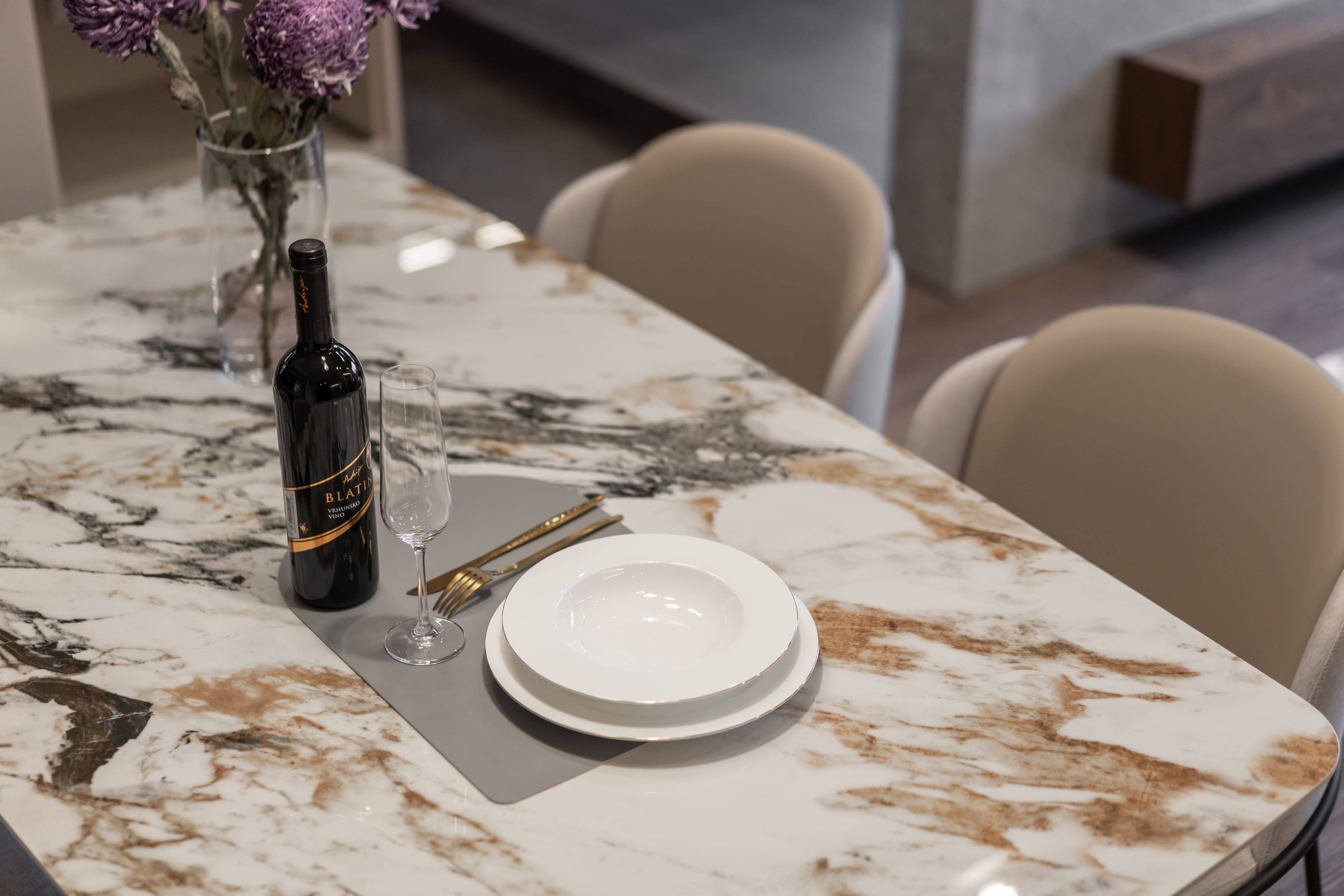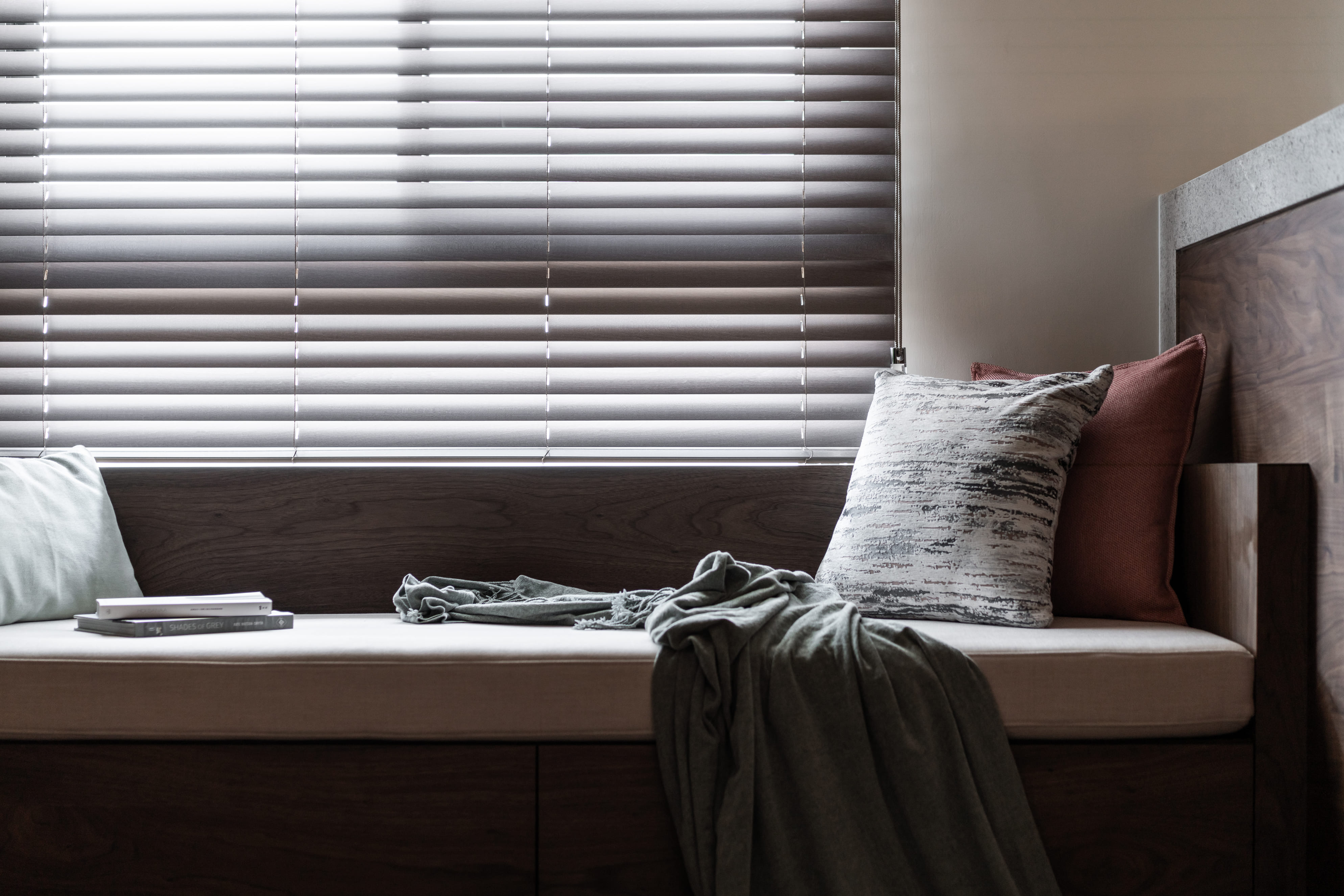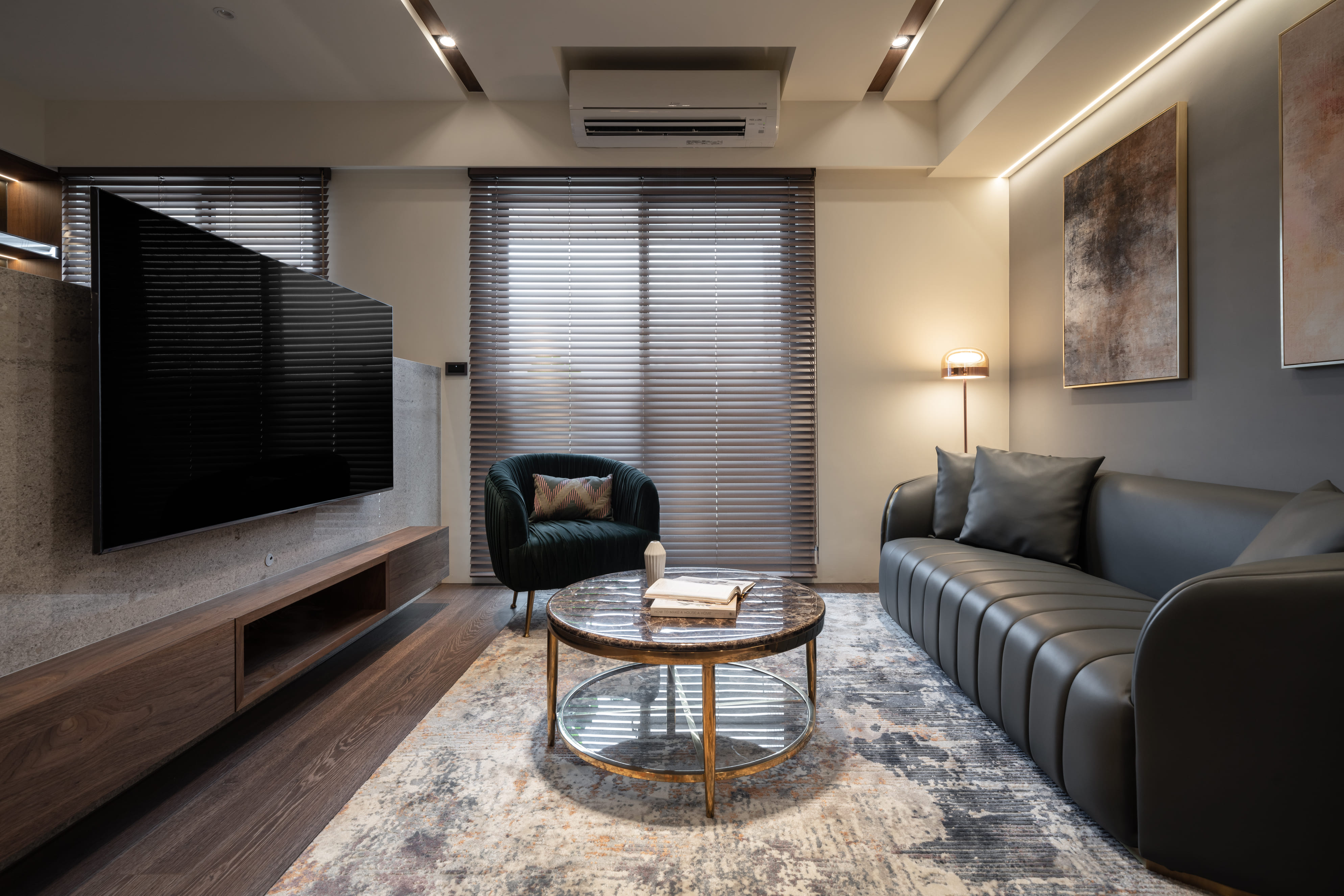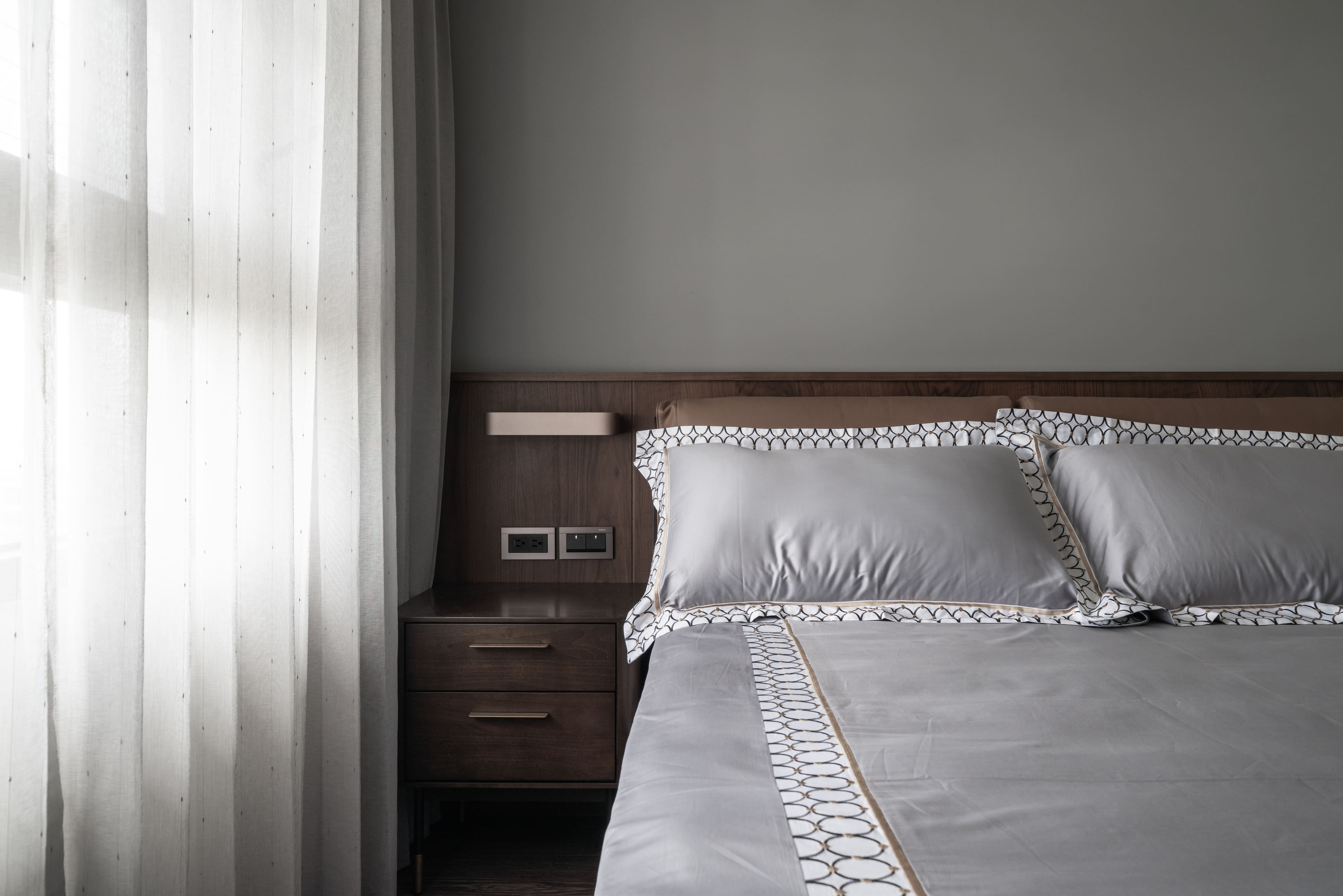深胡桃木與半高灰石牆成就了空間的沉著高雅,木色相襯了鏡面映照與反射,光照下的層架處處是藝術氣息,配上一本書一杯茶,坐臥在窗邊上享受平靜午後時光,如雕塑品彼此各據一角又和平共處;燈光引著金屬邊框散發出漫射,石材質感呈現油光晶亮,是否已帶你回到曾經下榻某間旅店的怡然自得,而這是我們對待生活的儀式感。