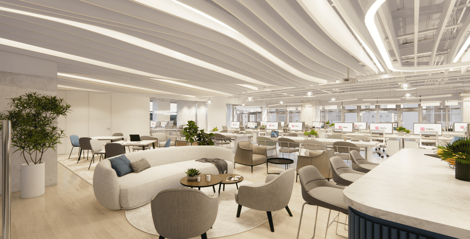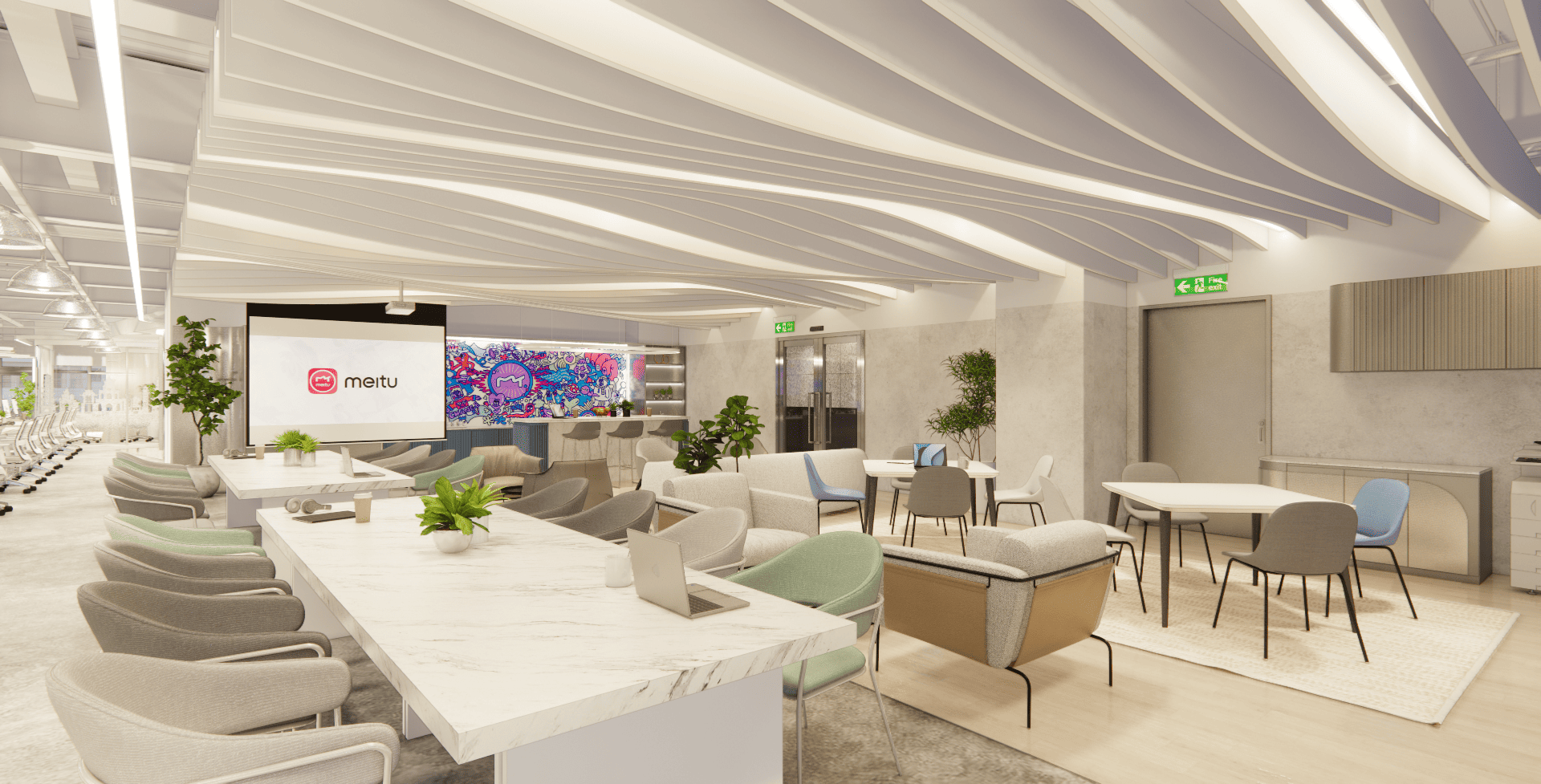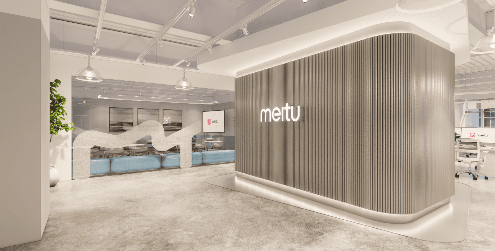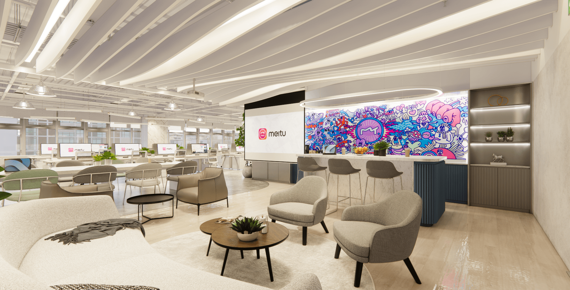 好的設計,從來不只是坐在螢幕前敲打鍵盤,而是源於對生活空間的細膩感知。走進美圖的辦公室,你會先被那如同雲朵般的流線型燈帶所吸引,光影在簡潔的白色空間中交織,彷彿思緒也在這裡得到了延展。