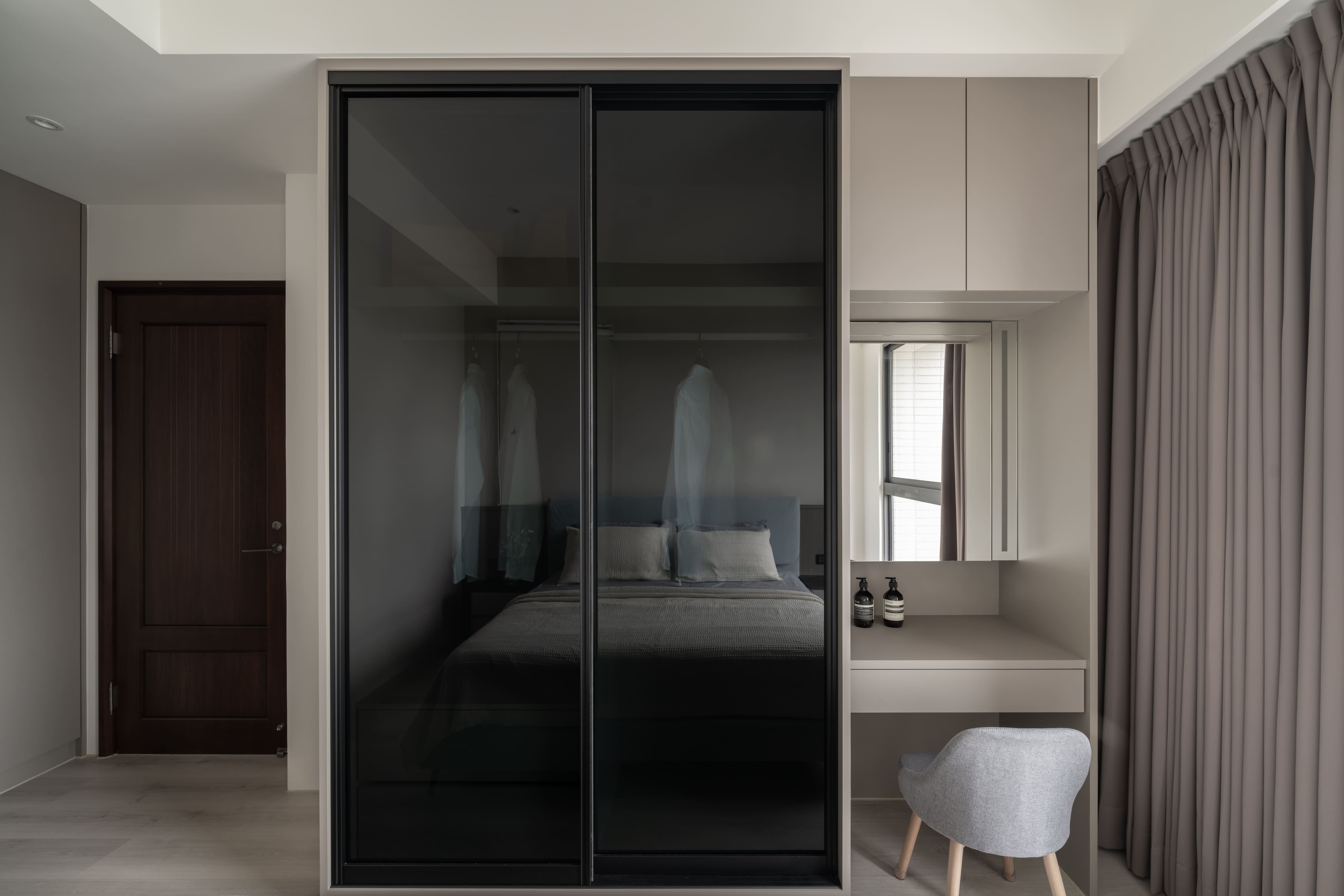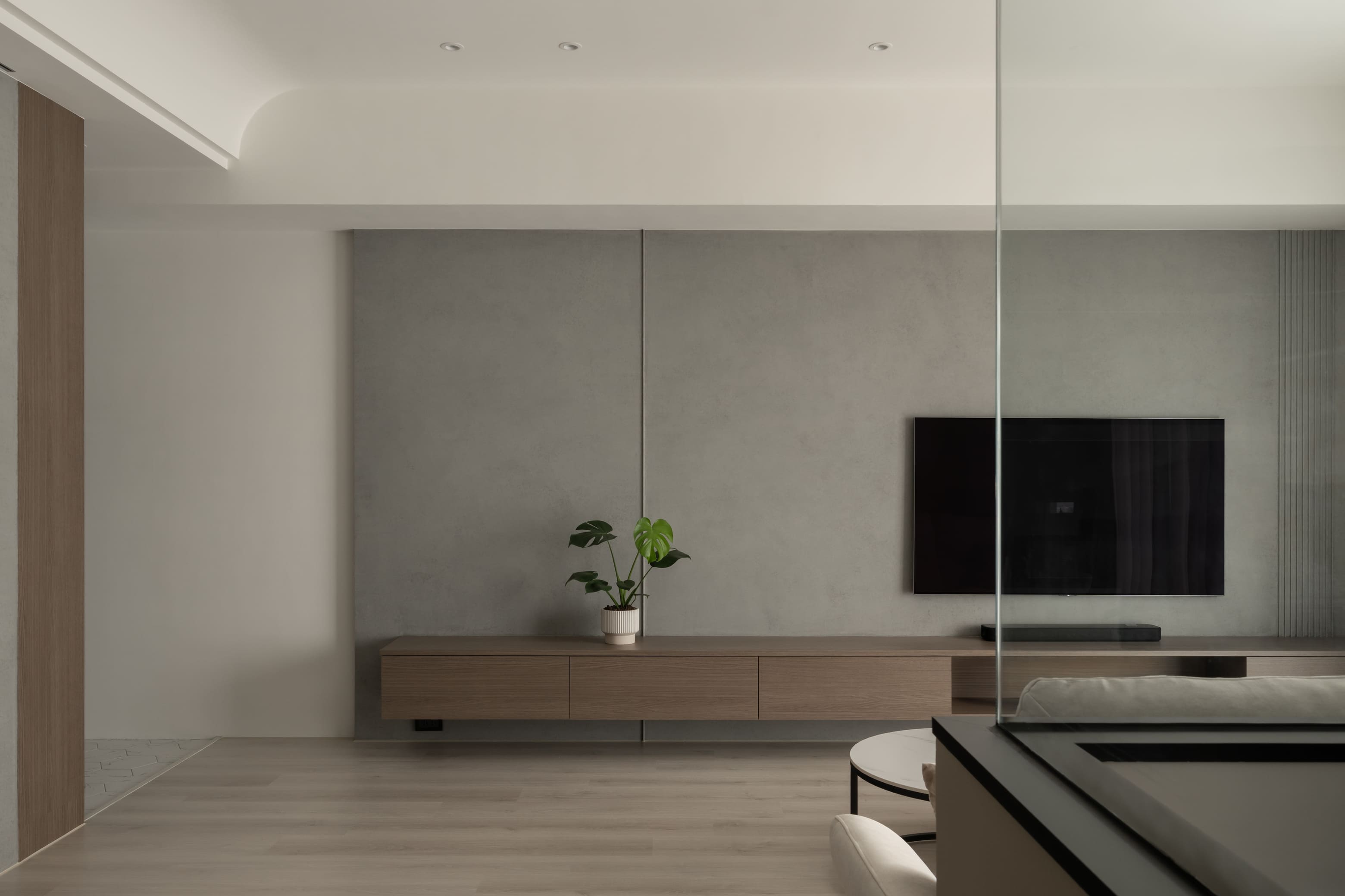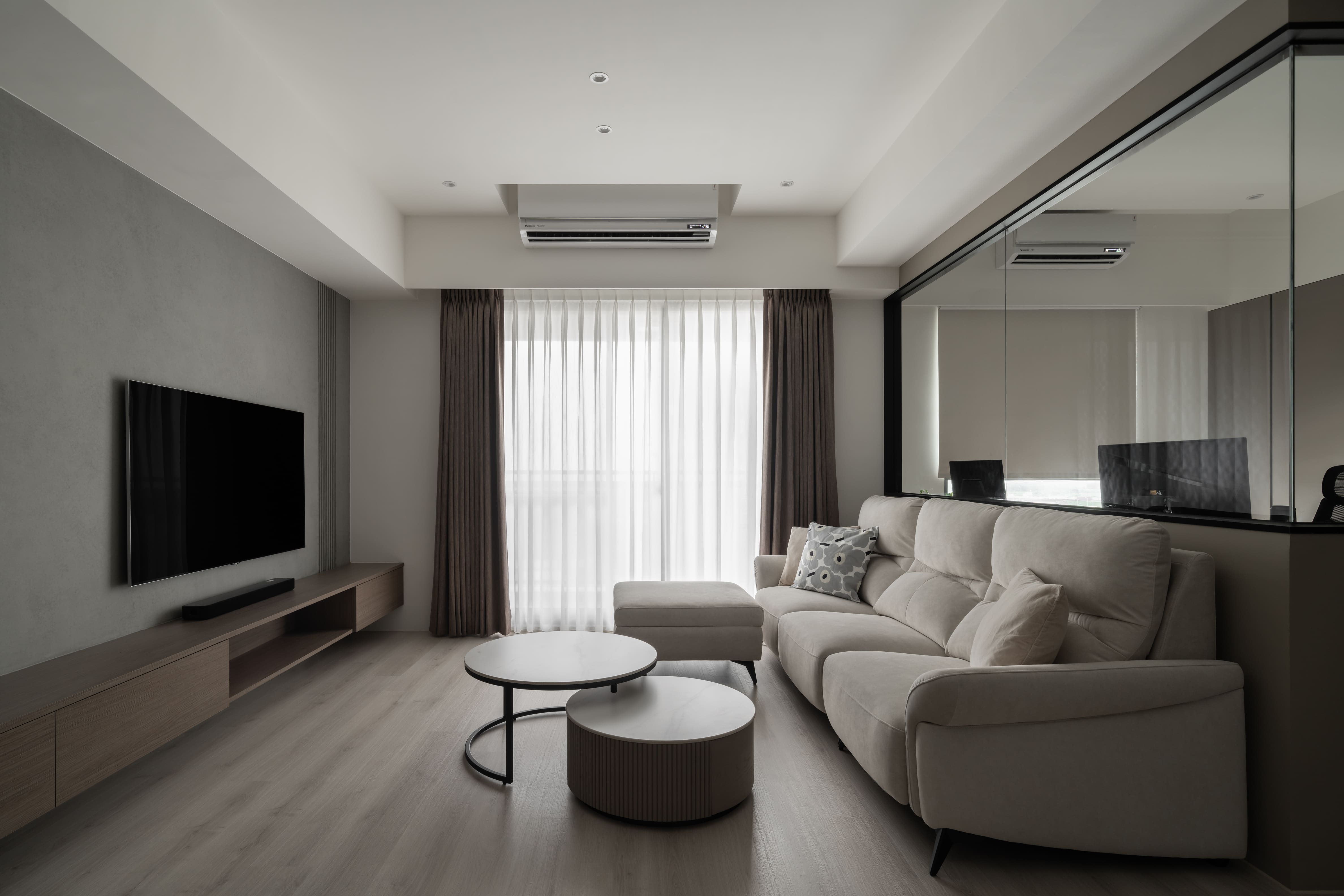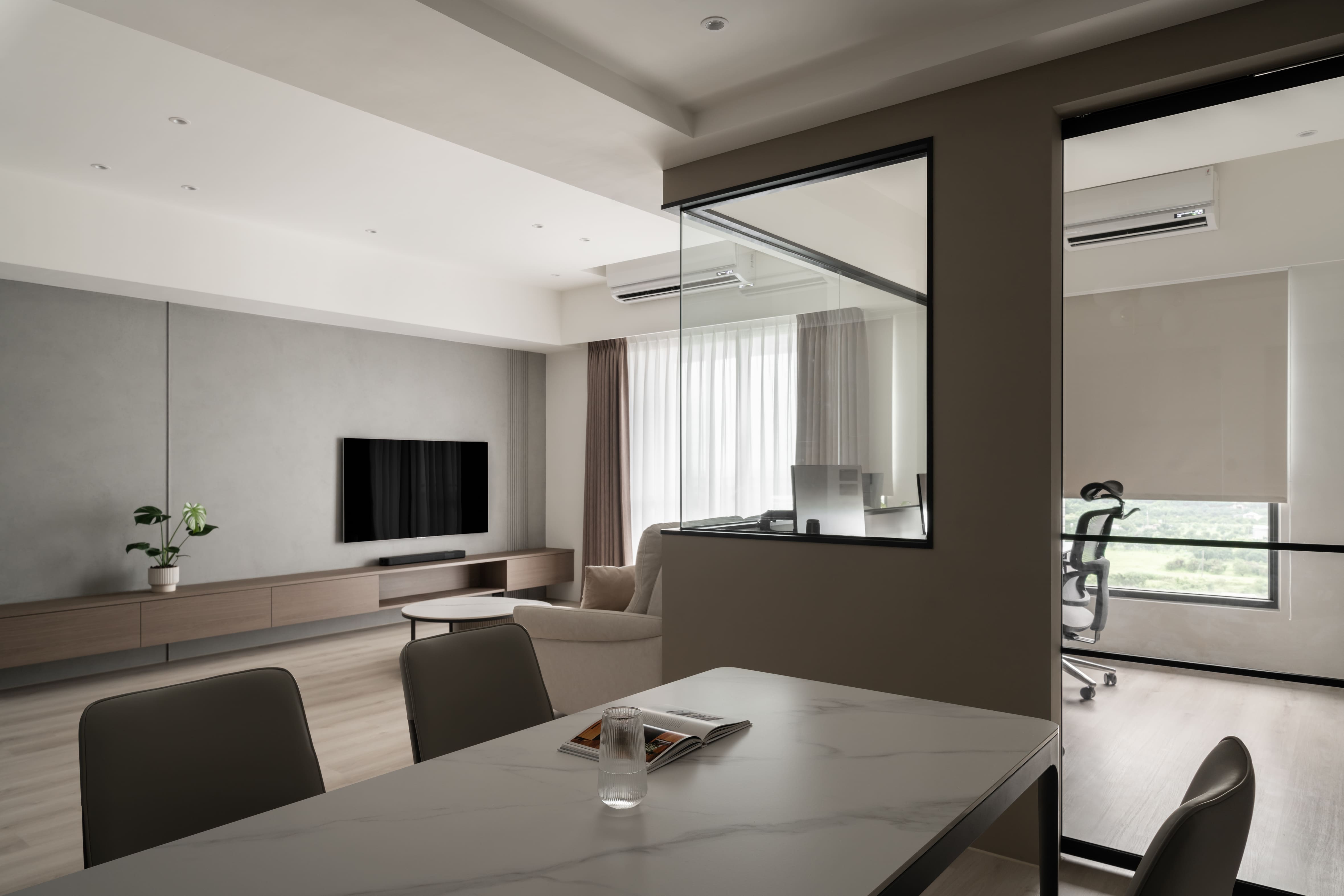 矮牆與玻璃穿透區隔空間,使客廳的視覺延展開闊。去除繁複和過多裝飾,搭配俐落的幾何線條,用泥灰、炭可可木紋共譜出寂靜內斂的生活居所,再注入奶茶色使空間更具有溫暖調性,與主色調的深淺不同,帶來的感受也會截然不同,也讓灰泥有了豐富肌理與質感。