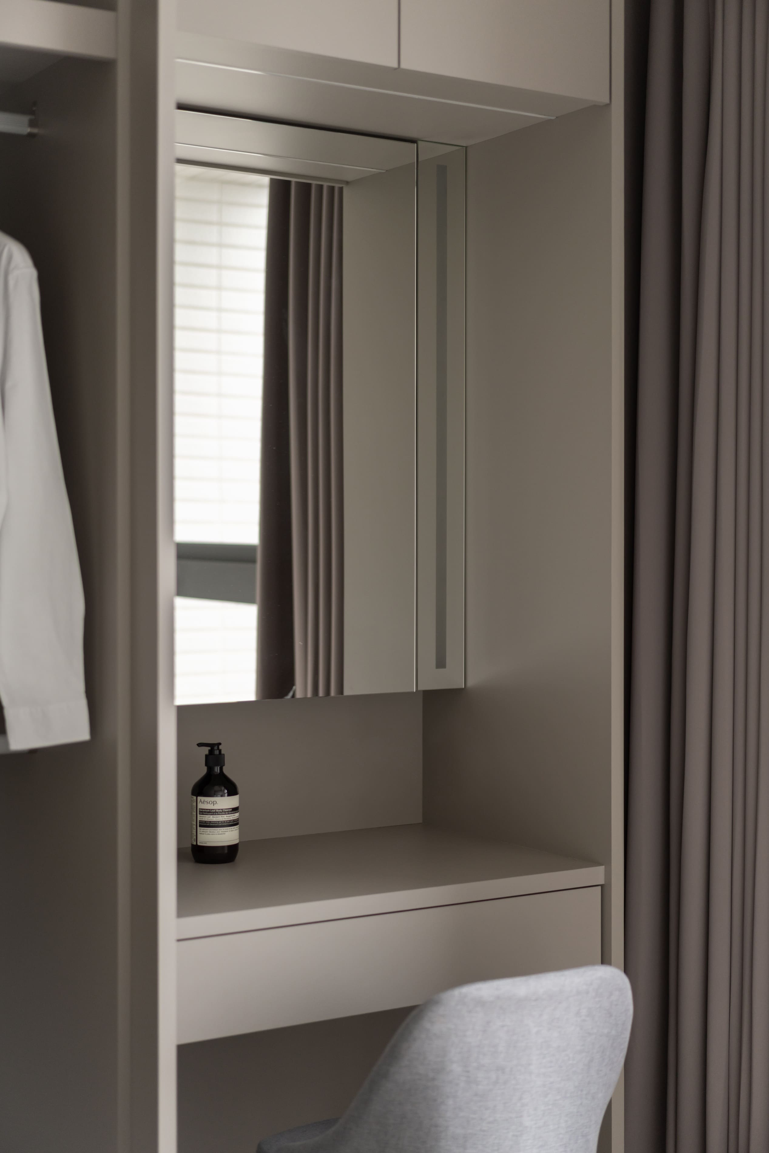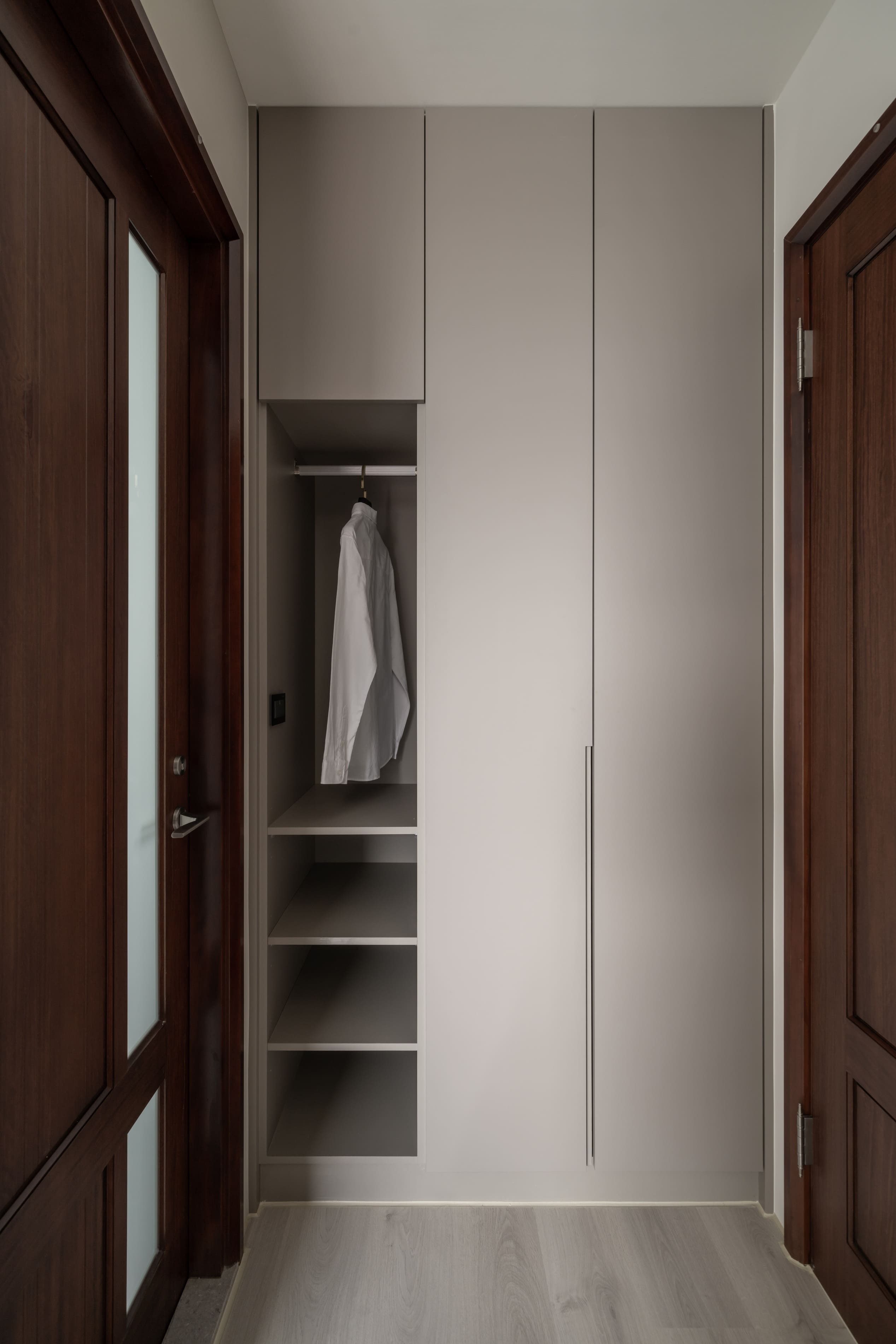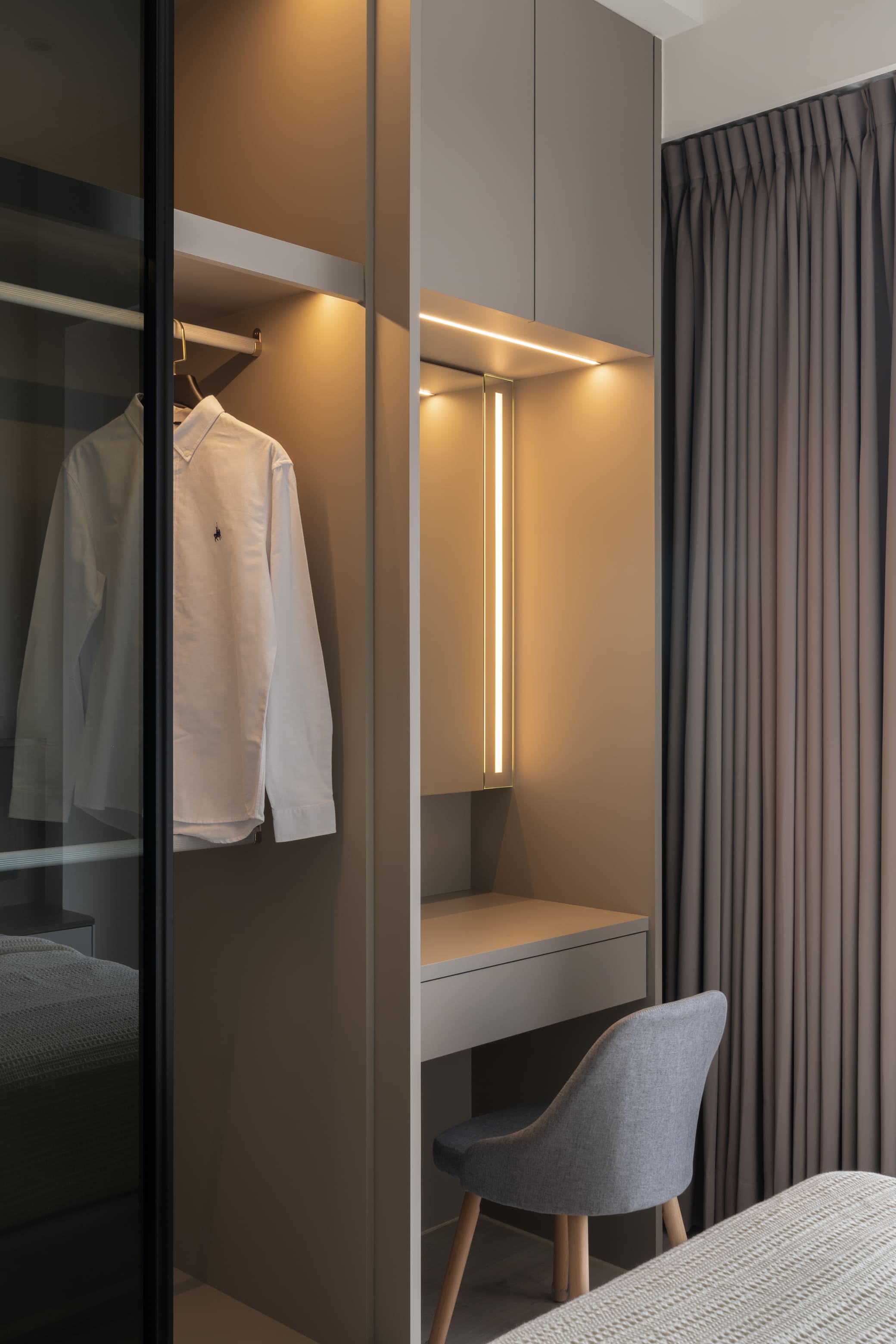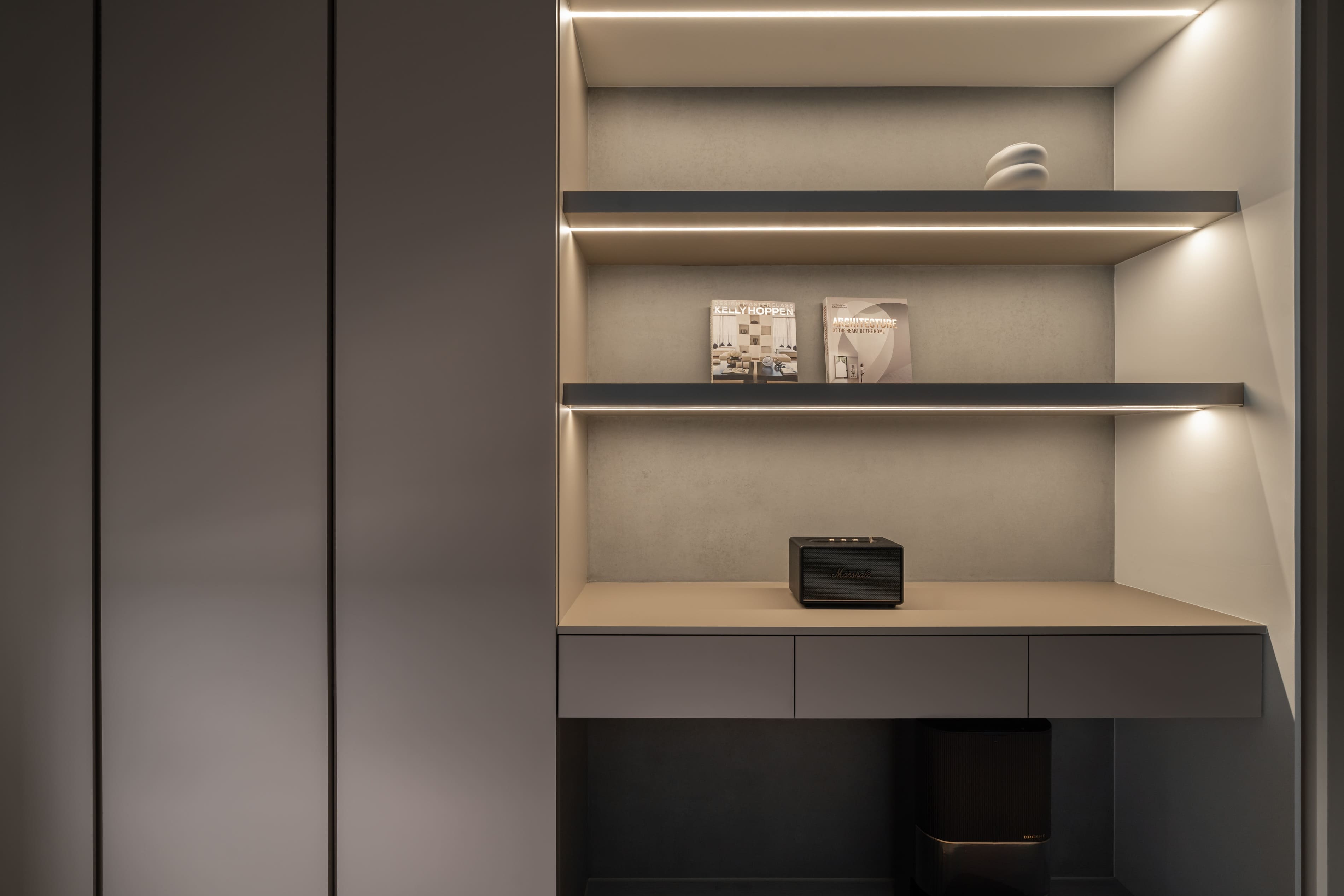 矮牆與玻璃穿透區隔空間,使客廳的視覺延展開闊。去除繁複和過多裝飾,搭配俐落的幾何線條,用泥灰、炭可可木紋共譜出寂靜內斂的生活居所,再注入奶茶色使空間更具有溫暖調性,與主色調的深淺不同,帶來的感受也會截然不同,也讓灰泥有了豐富肌理與質感。