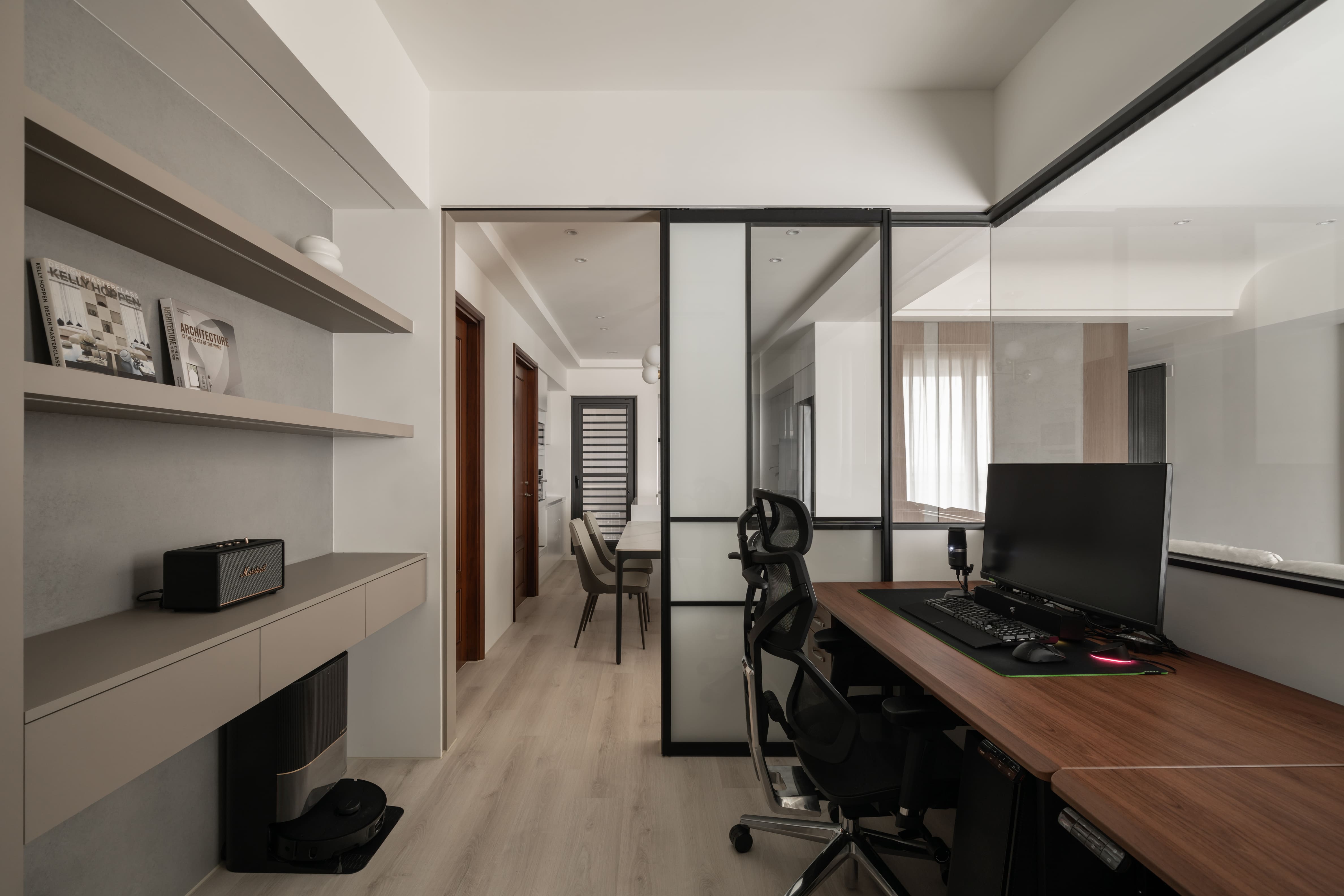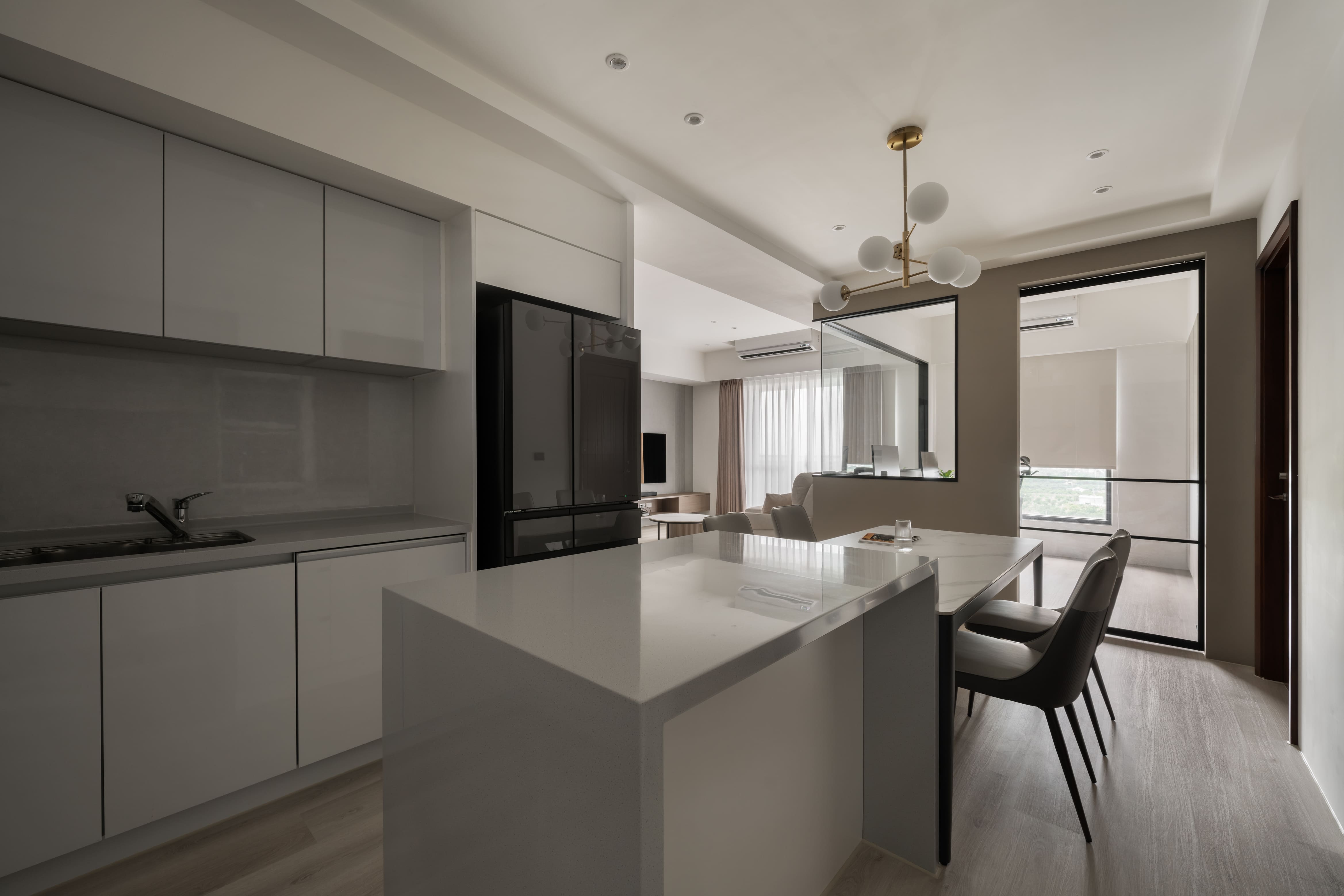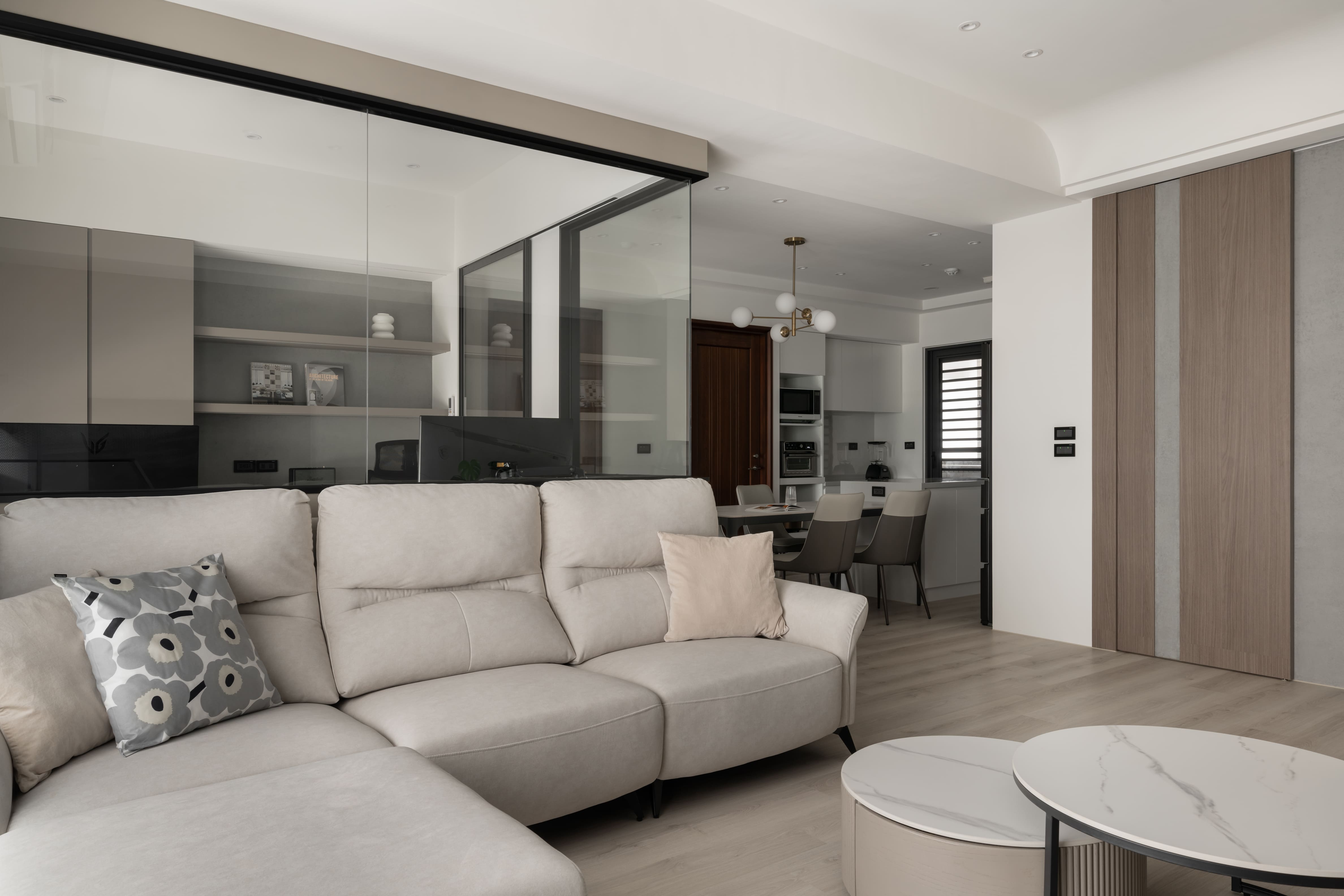窗外霽朗光感灑入室內,書房、客廳與廚房以黑框玻璃推拉門作為空間過渡,除了導引充沛採光,讓空間開放,也保有各自獨立性,打破了對家的格局的定義,隨時可以準備「回家」。