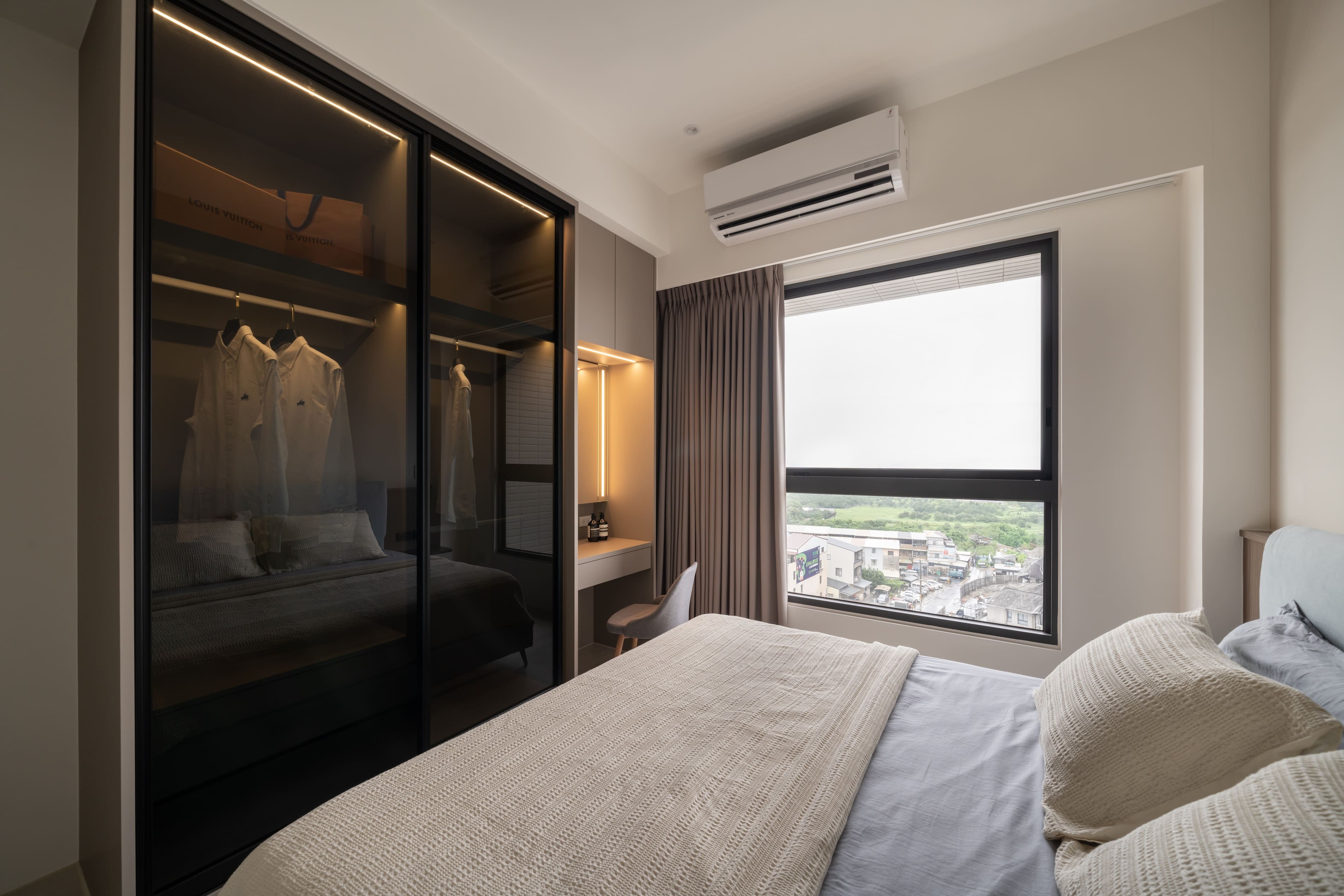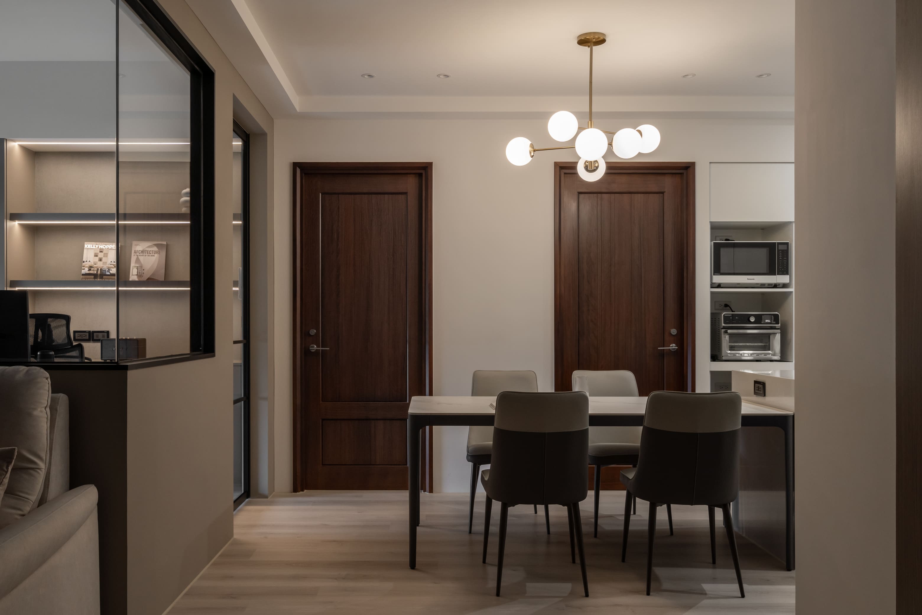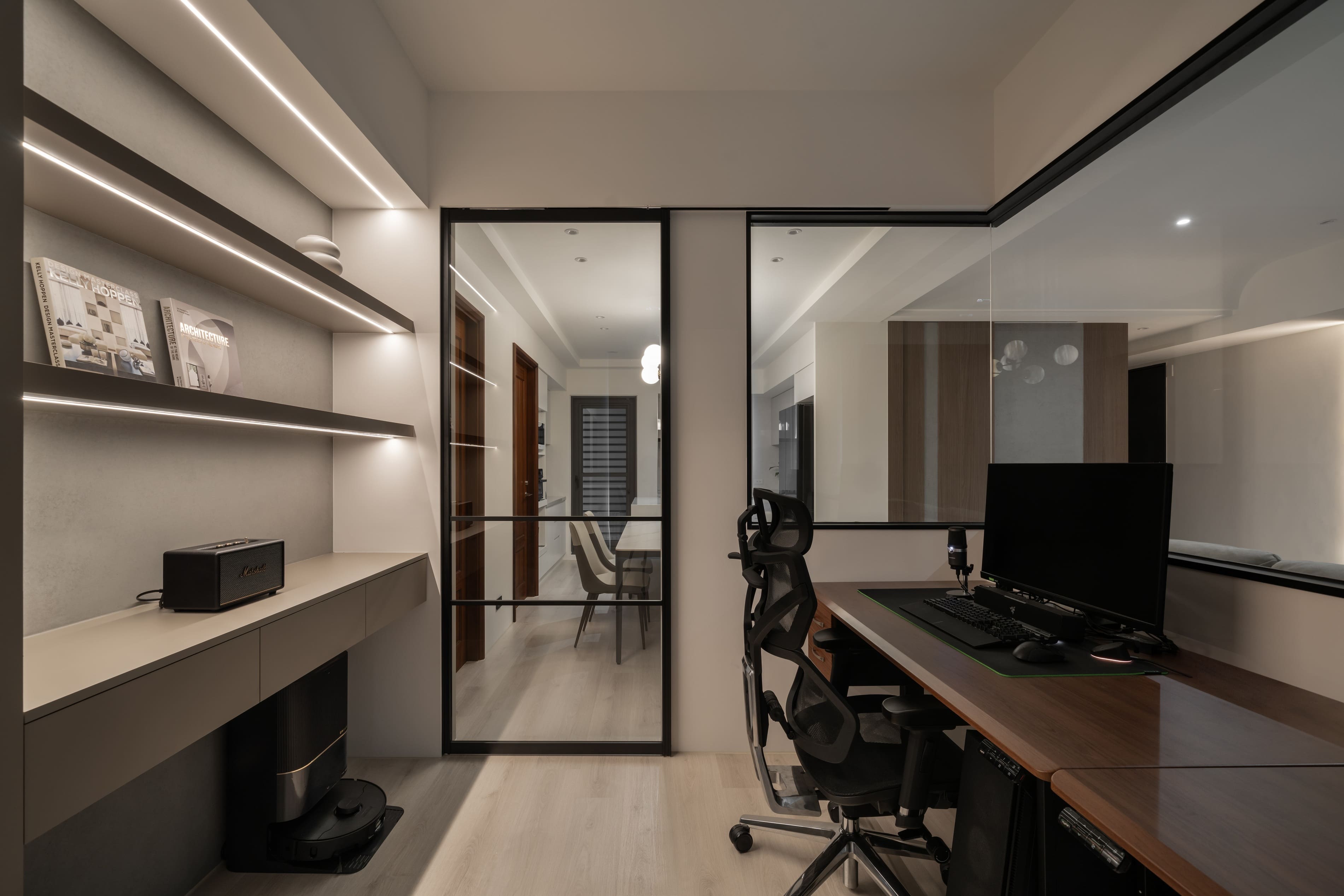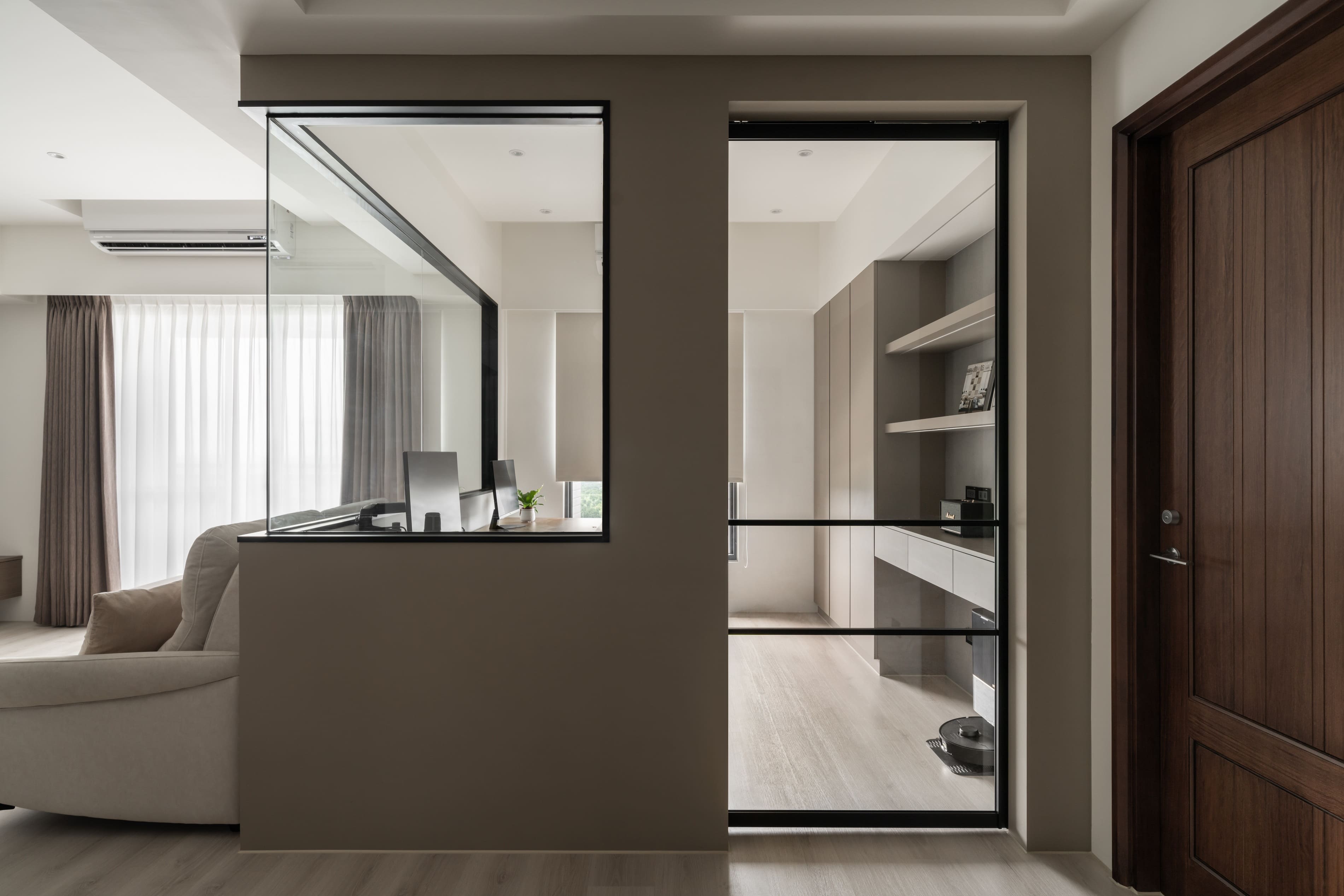 窗外霽朗光感灑入室內,書房、客廳與廚房以黑框玻璃推拉門作為空間過渡,除了導引充沛採光,讓空間開放,也保有各自獨立性,打破了對家的格局的定義,隨時可以準備「回家」。