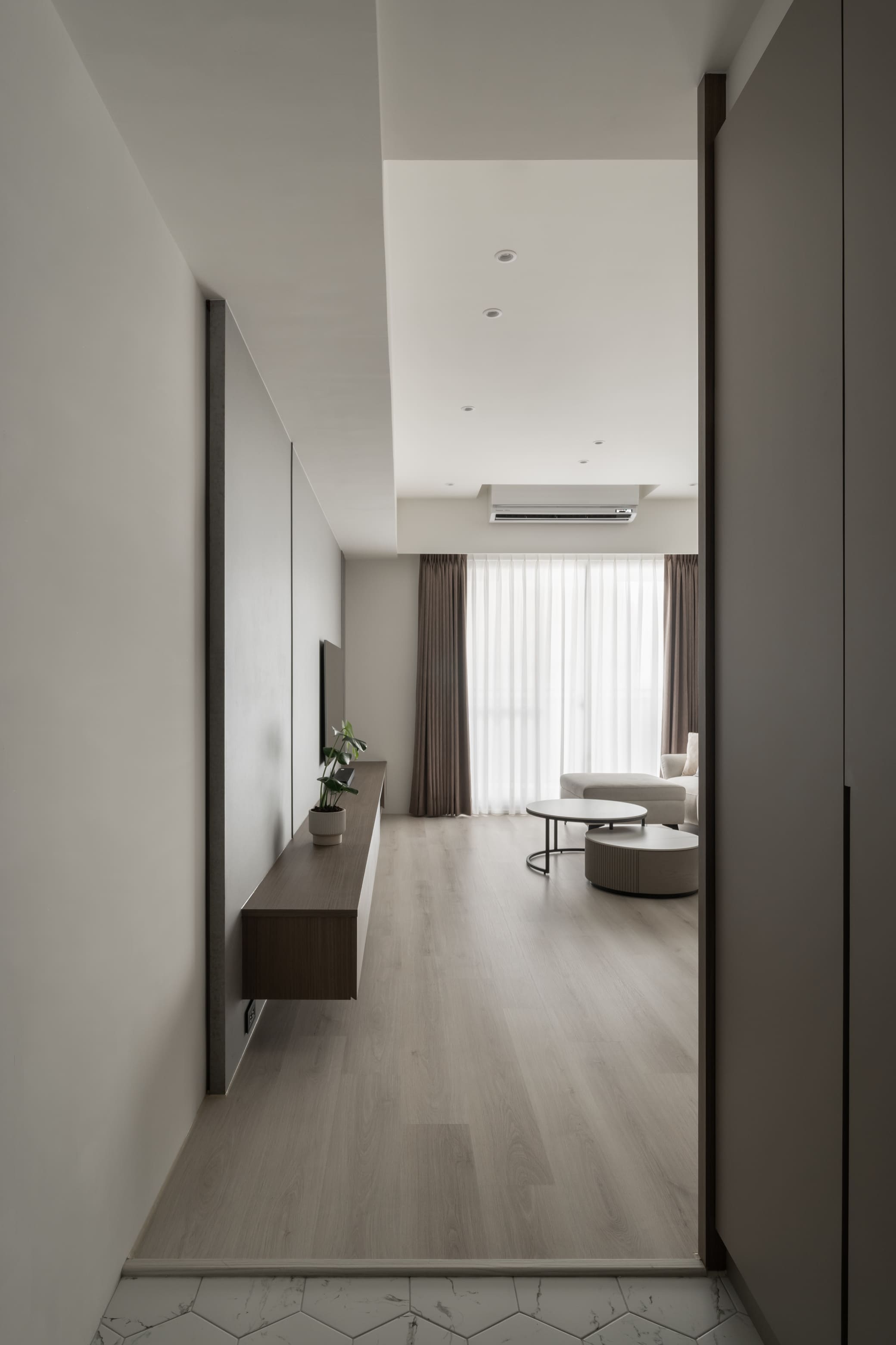長形玄關鋪設銀狐六角磚地坪,輕輕走入,映入眼簾即是開闊的生活空間,或坐或臥在傭懶的沙發上,躺在另一半的腿上,輕撫秀髮和臉頰,仿佛時間在那一刻靜止了,世界上只有我們兩個人,什麼事都很浪漫。