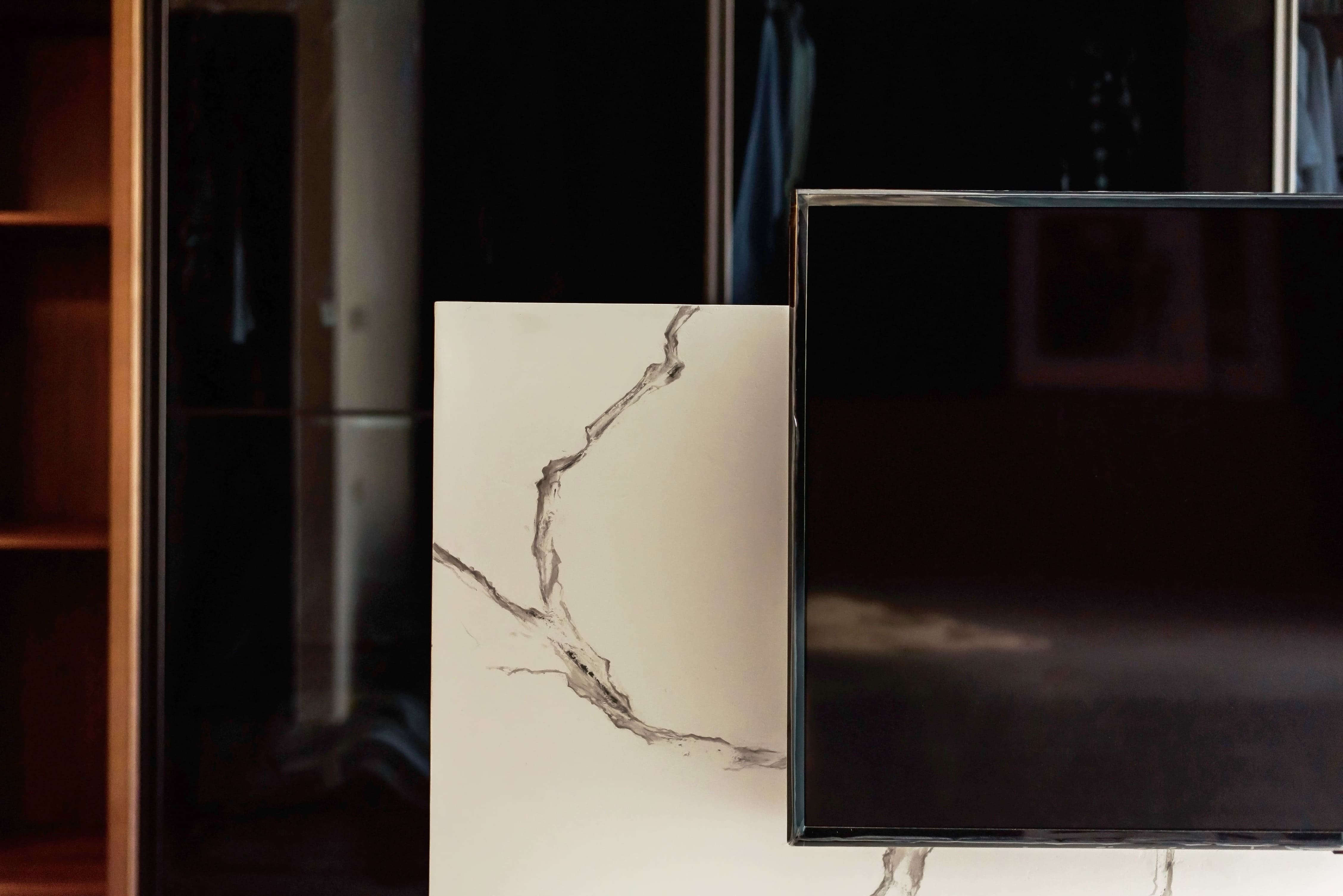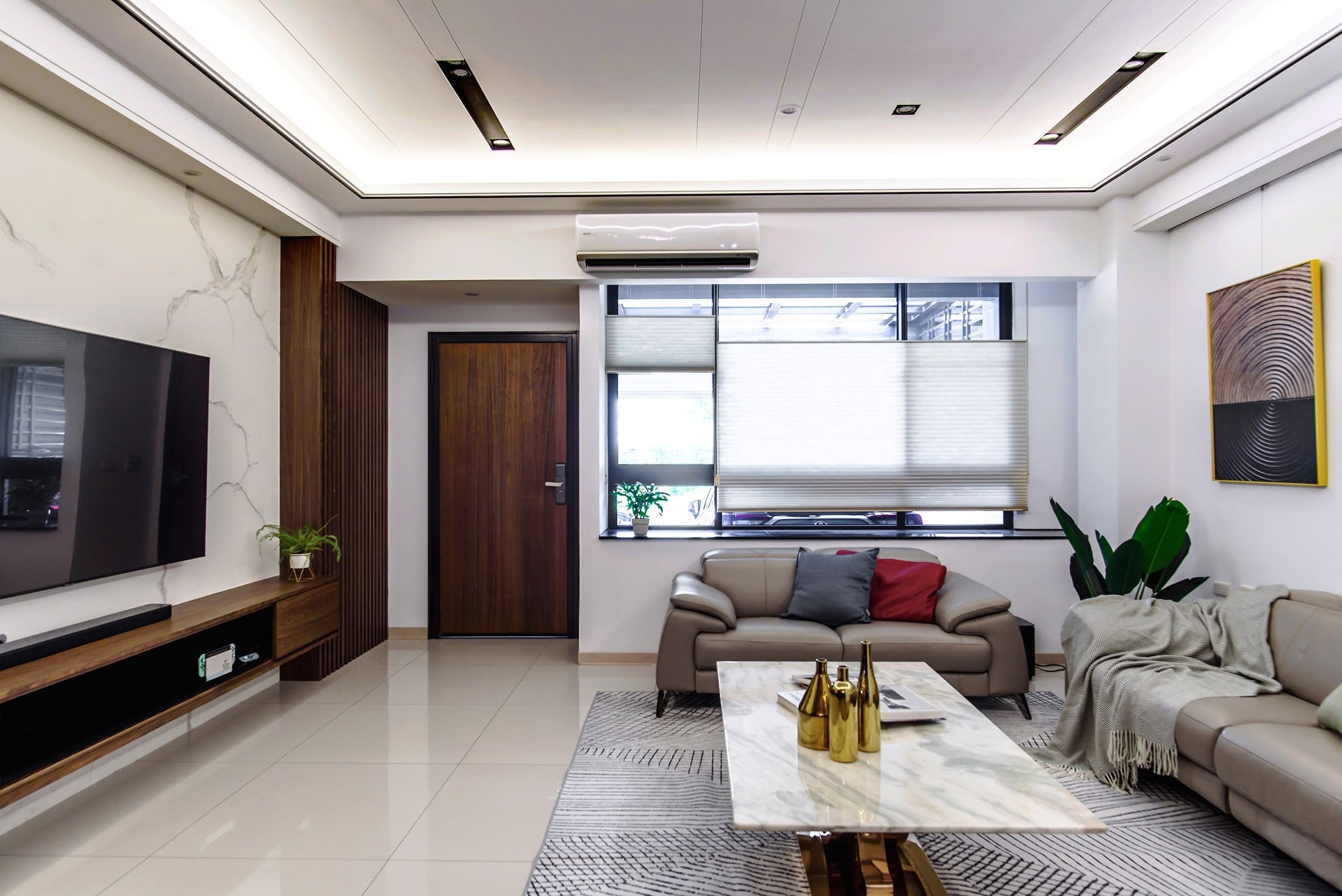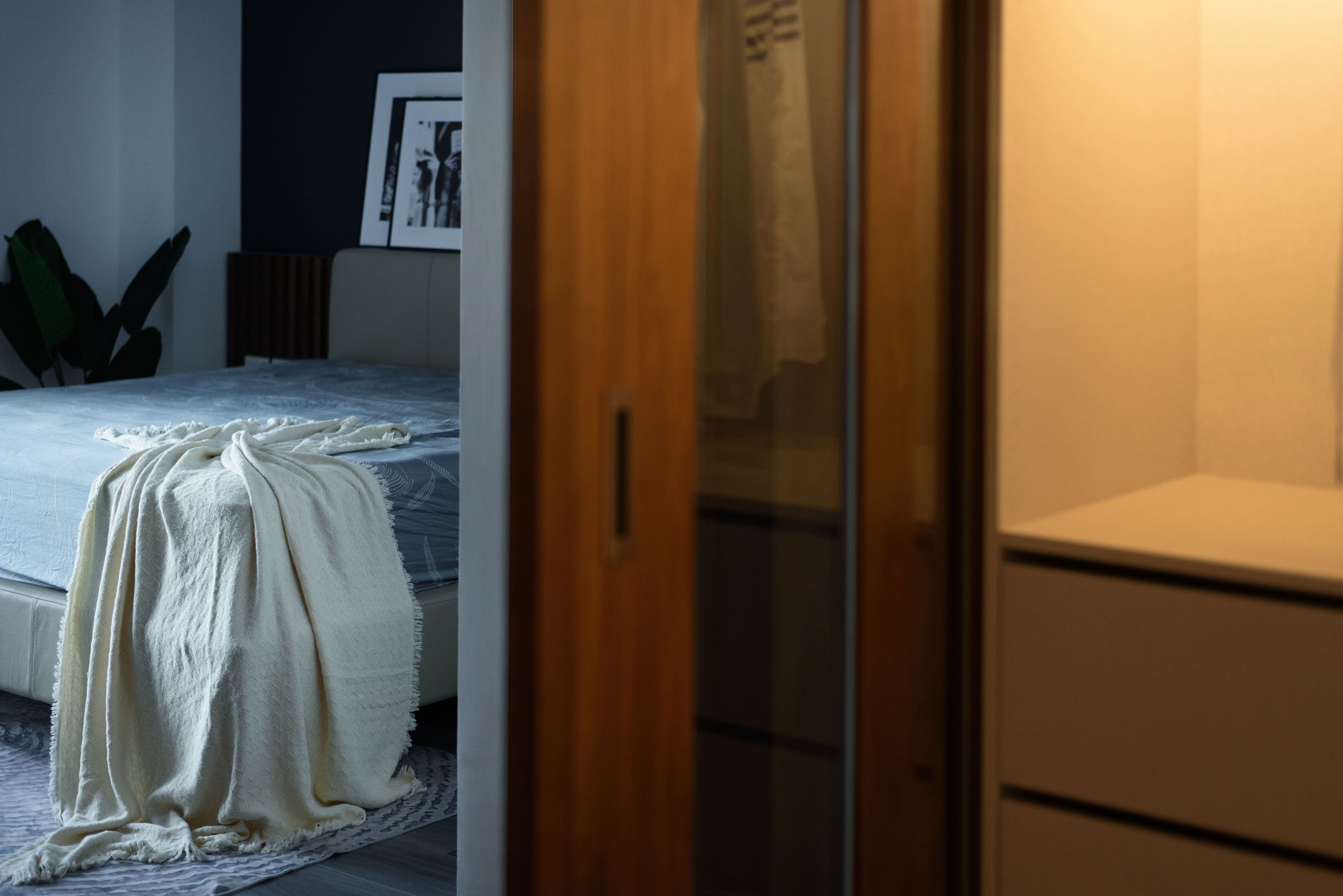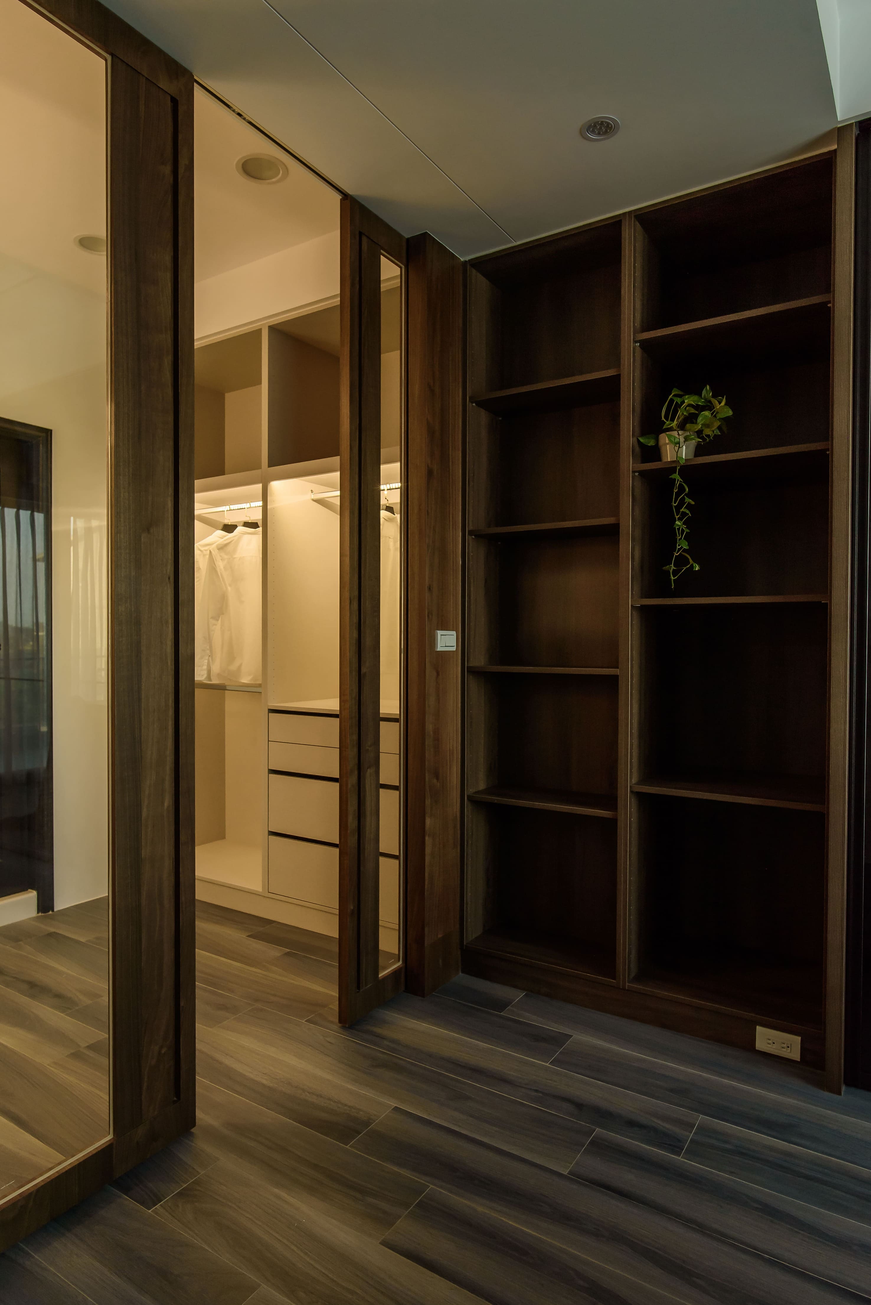 主要材料|珪藻土塗料、鋁框玻璃門、系統櫃體、木皮、木紋磚