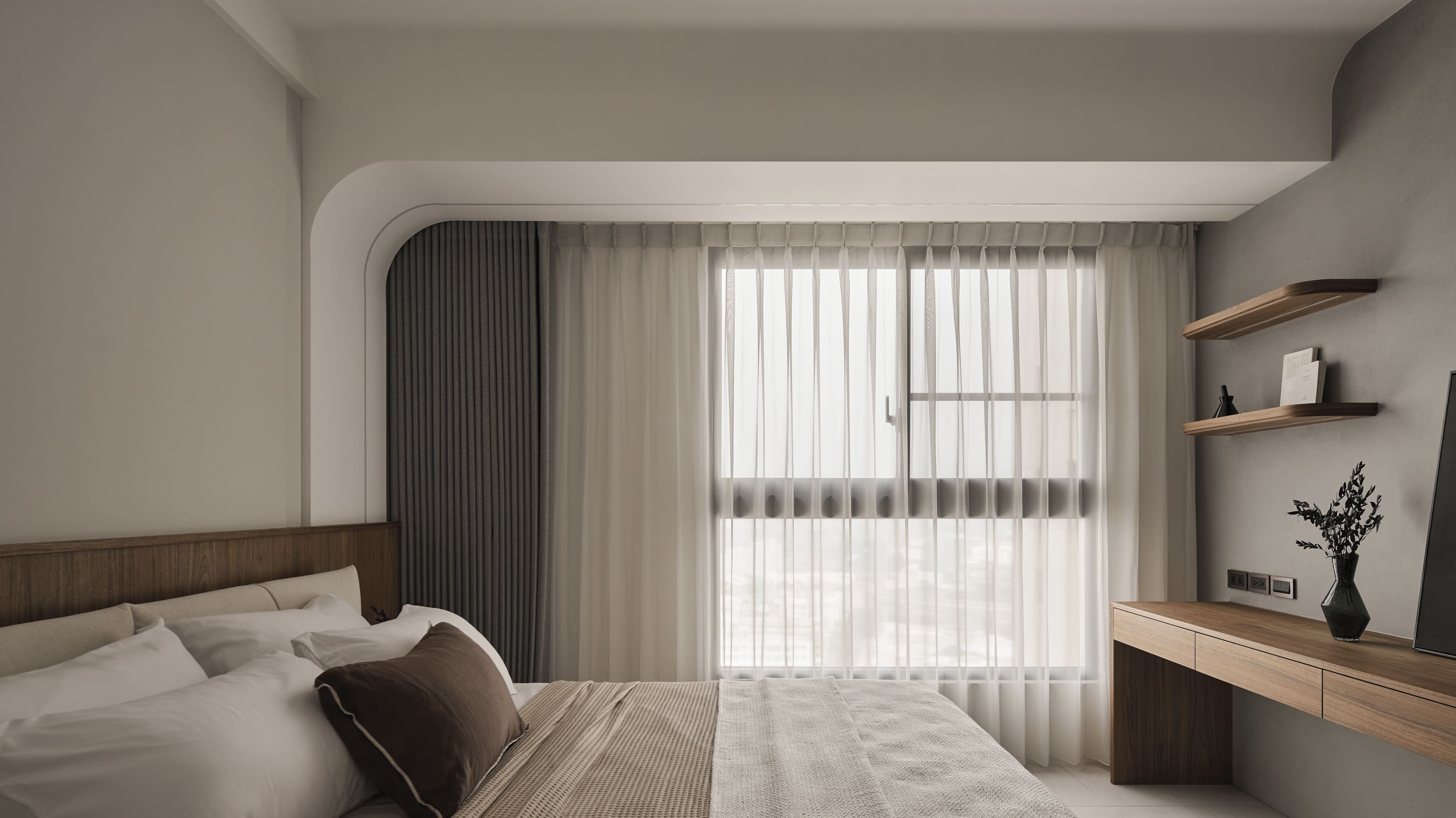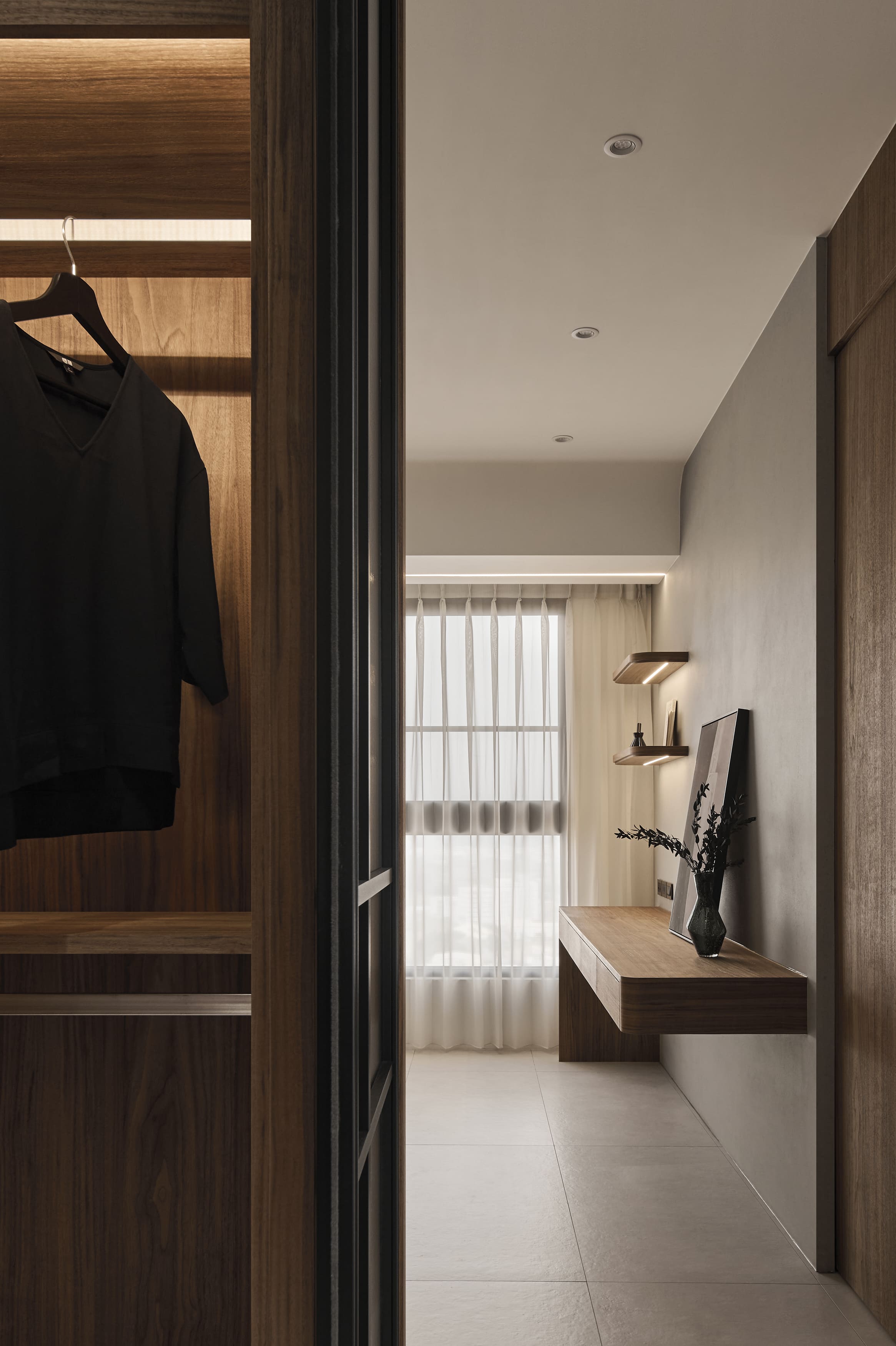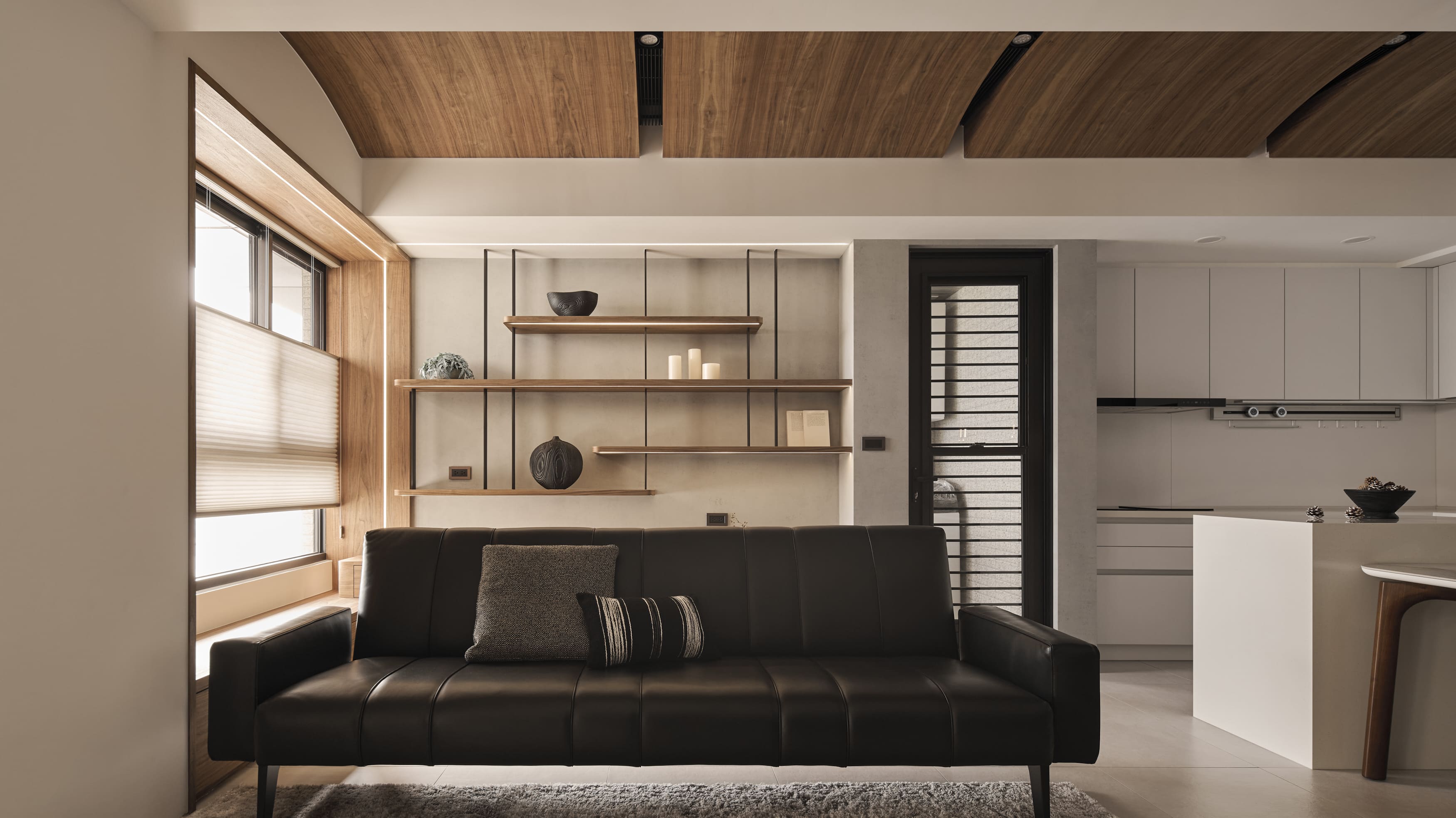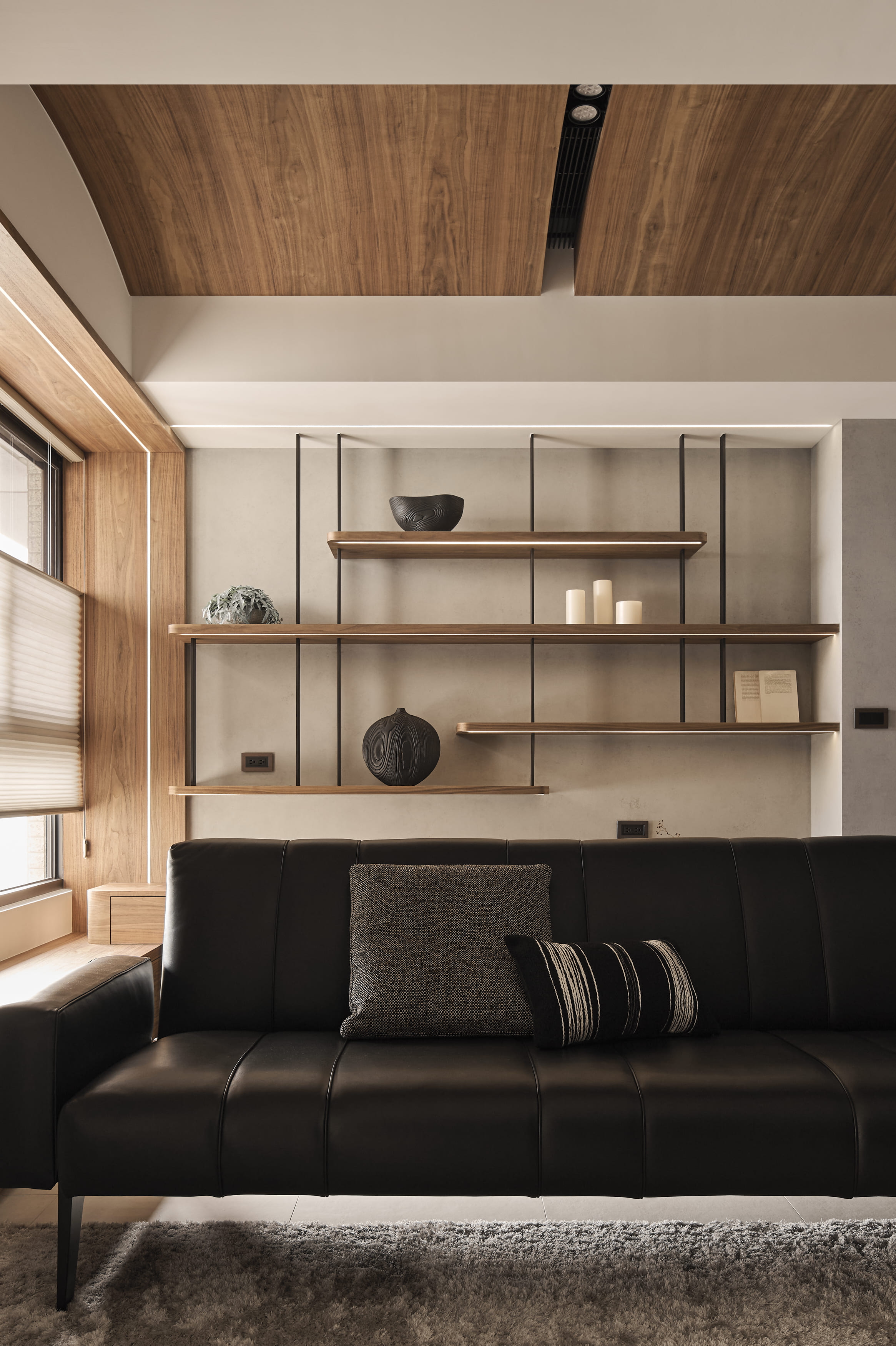 以飯店澄色為出發點,選用黑白、泥灰等山嵐色系與木皮重疊交錯,簡潔有力的線條,營造出高品質生活格調;屋內四面皆為窗戶,保留採光良好大面開窗,讓和煦陽光盡情灑入,居高環顧美景拉遠了視野,在家也有住在飯店的感受。