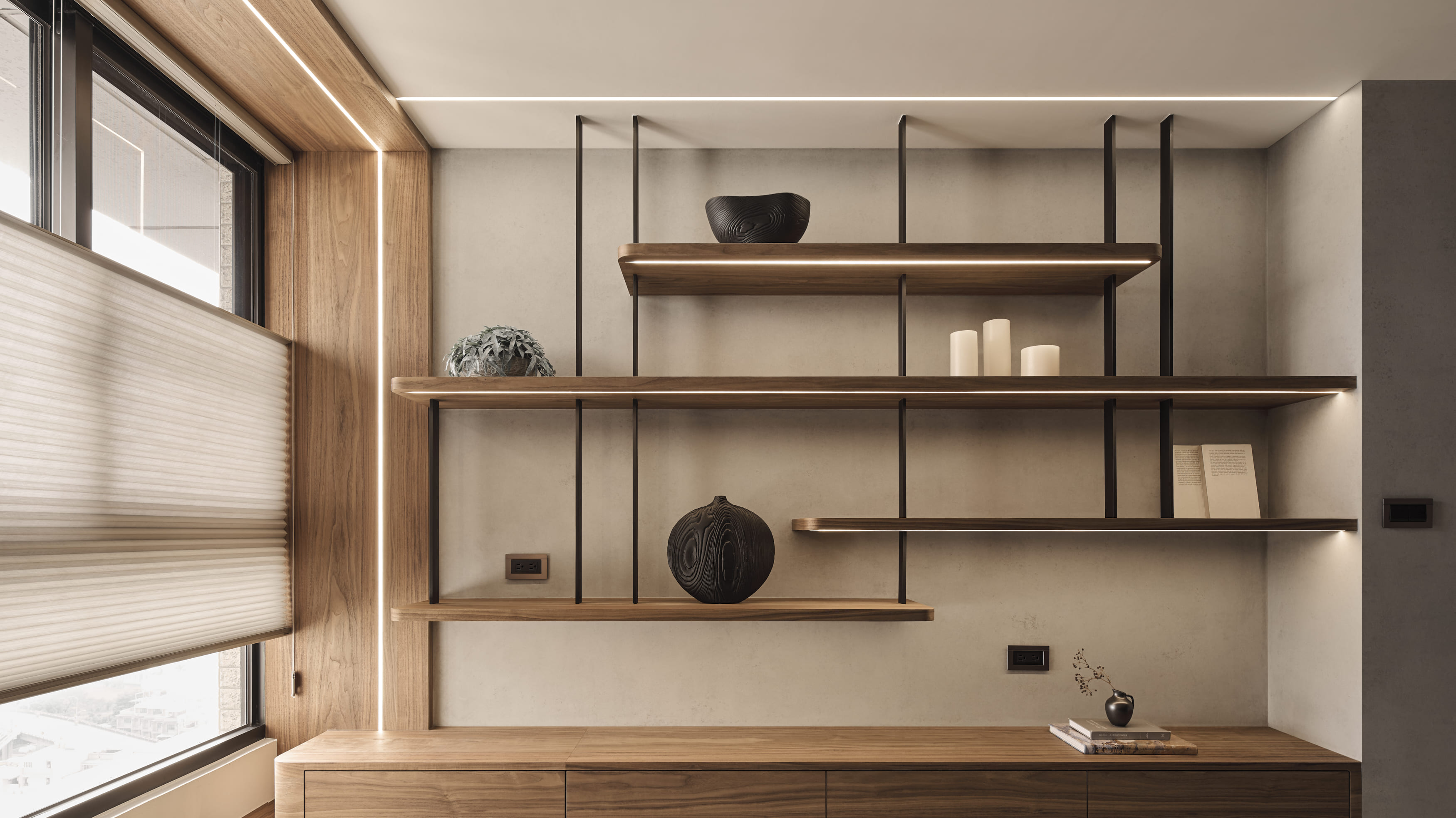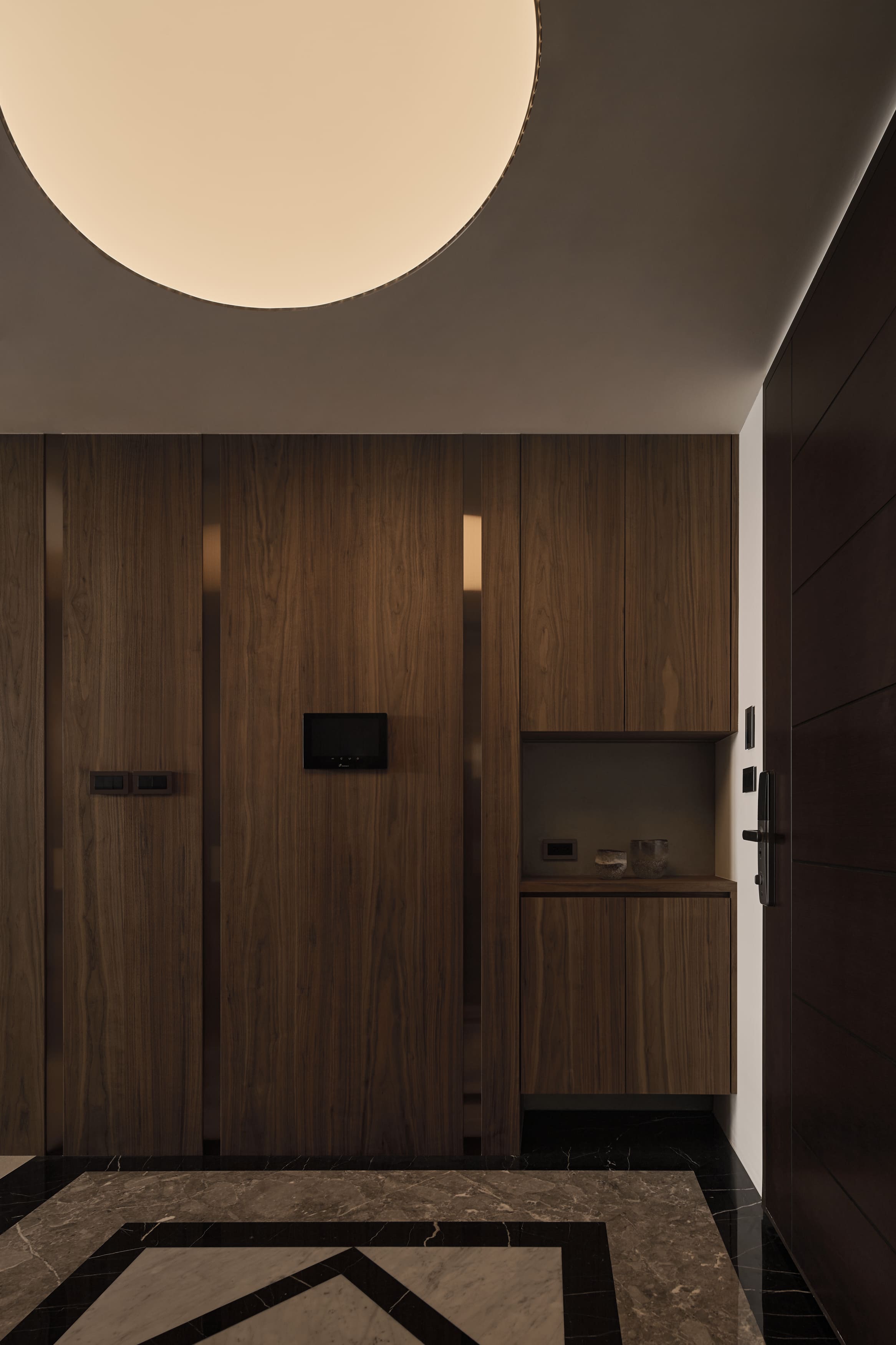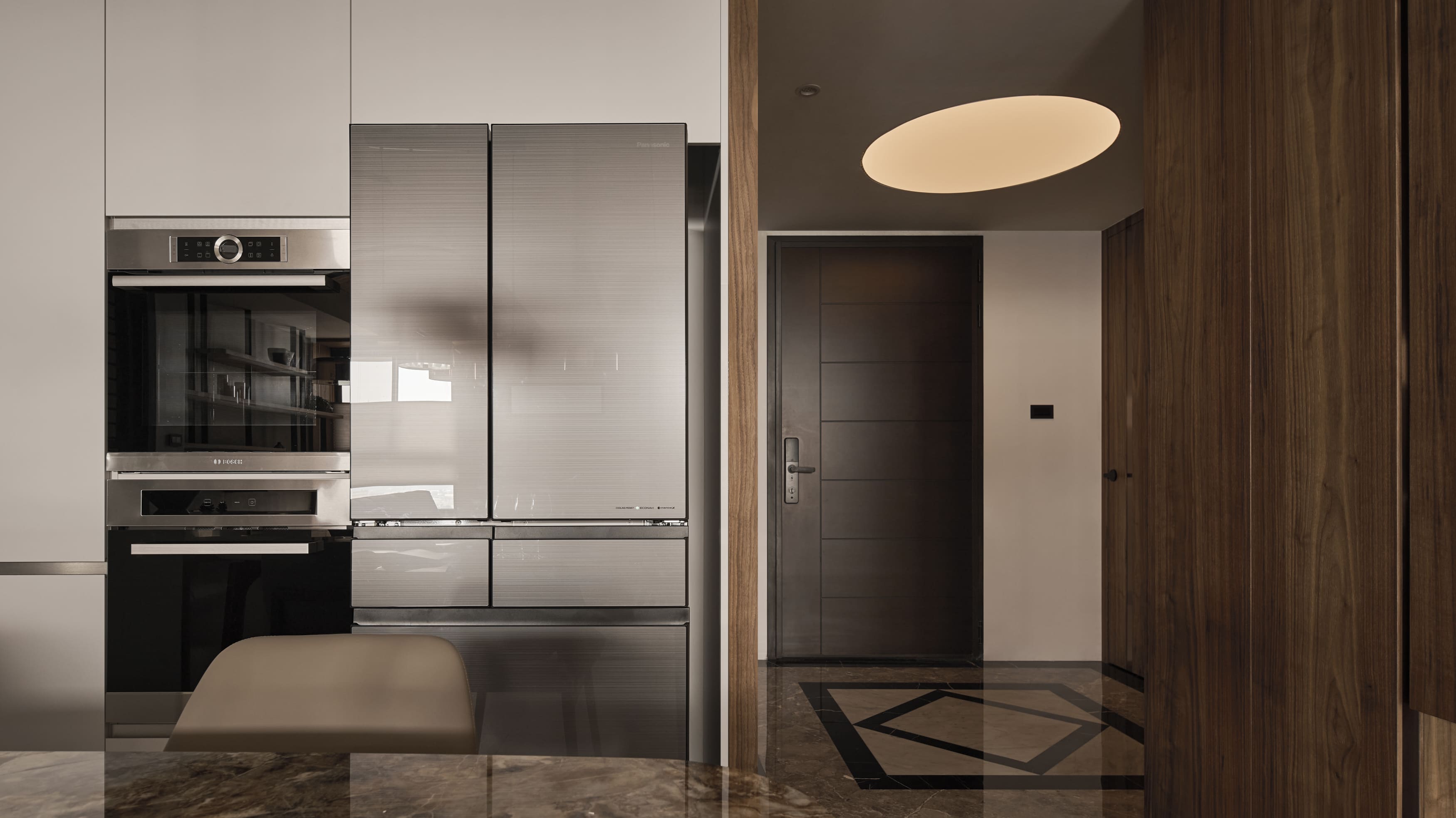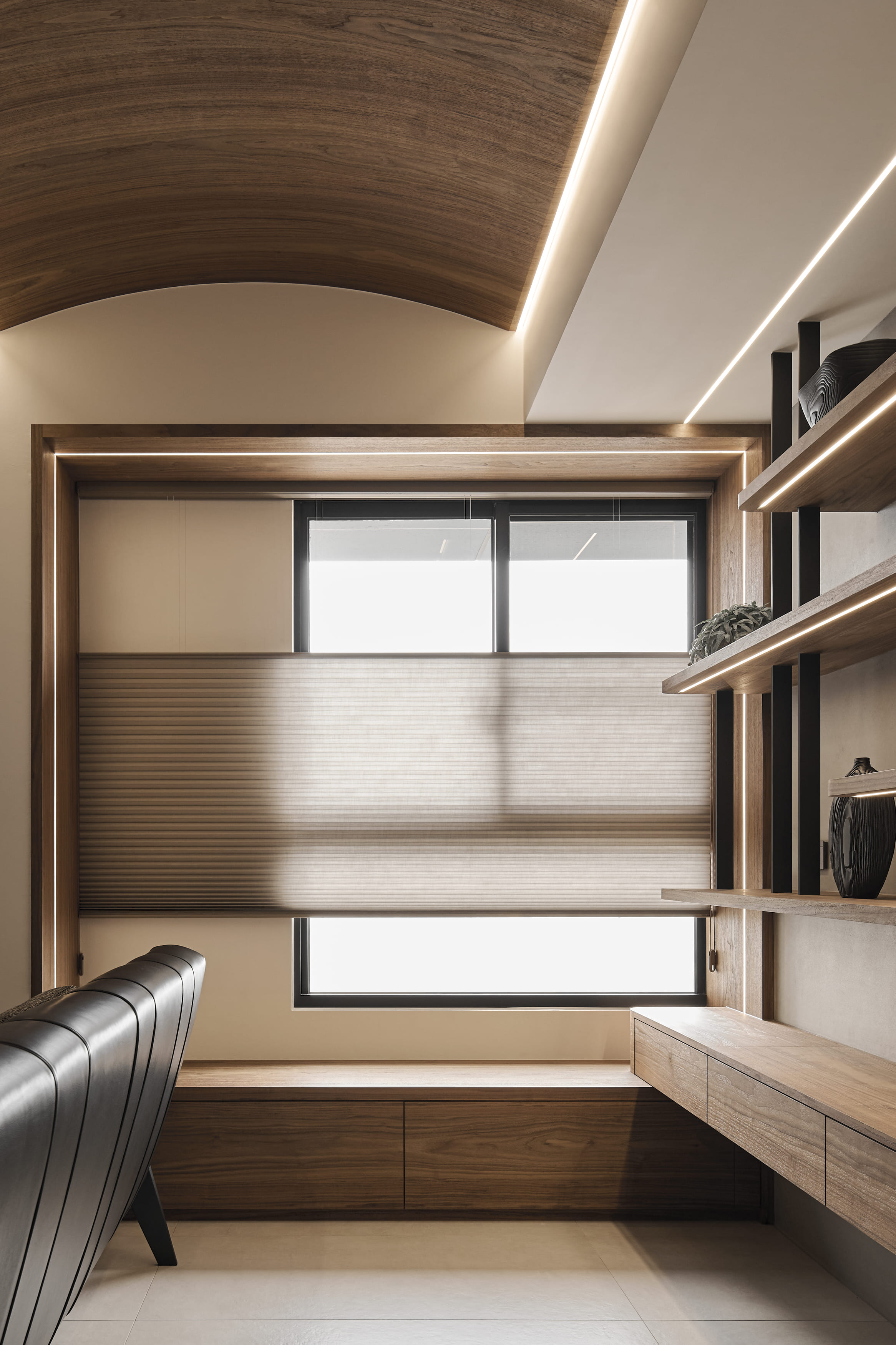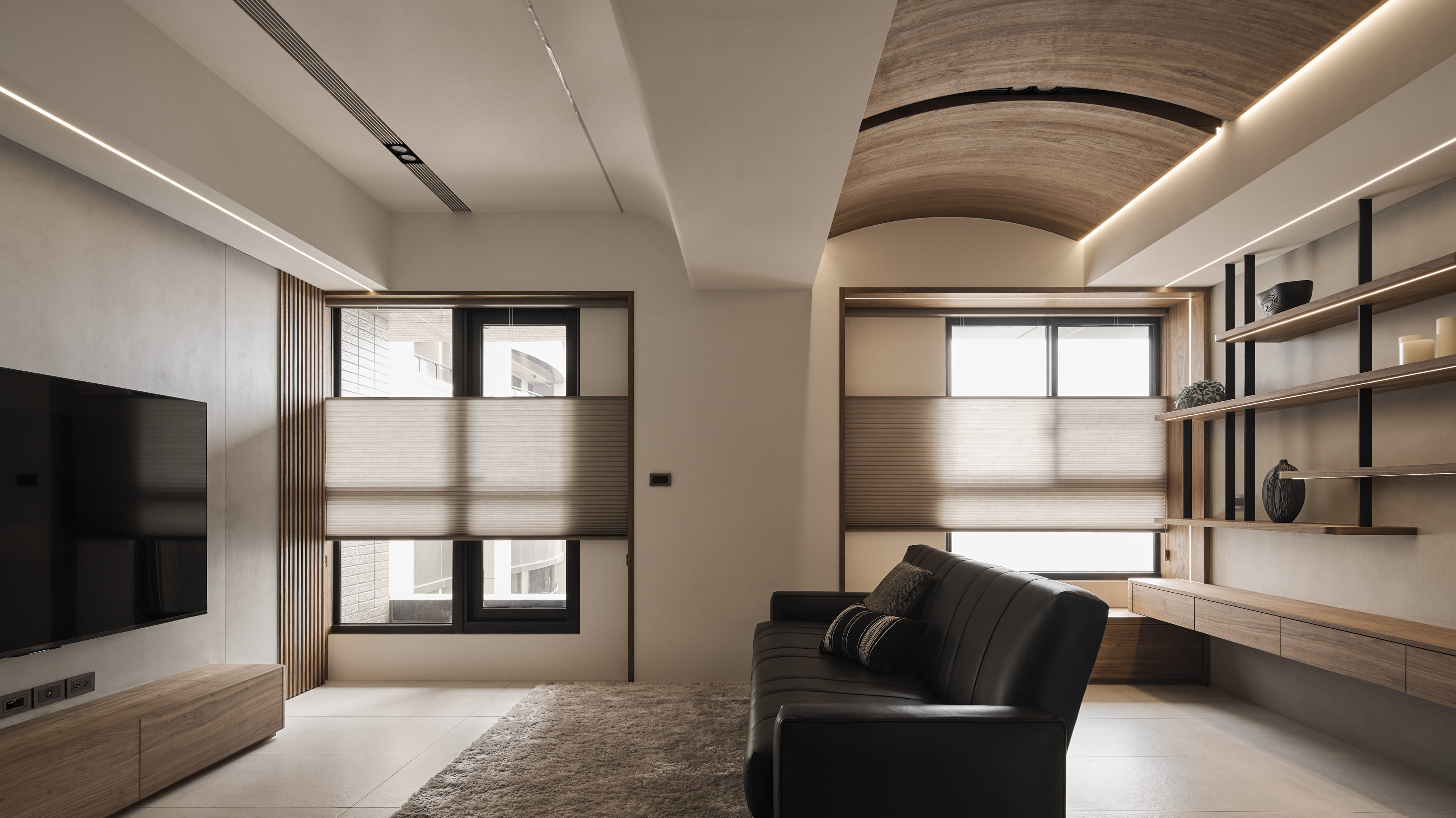 走入玄關,地坪用簡單幾何線條分割,對映天花板圓形燈膜,好比皎潔明月,呈現天圓地方。大樑被圓弧修飾滑順,讓沉重感緩和,弧型彩霞漫射在空中,猶如在漫漫月光灑下,輕鬆坐臥與書香陪伴。