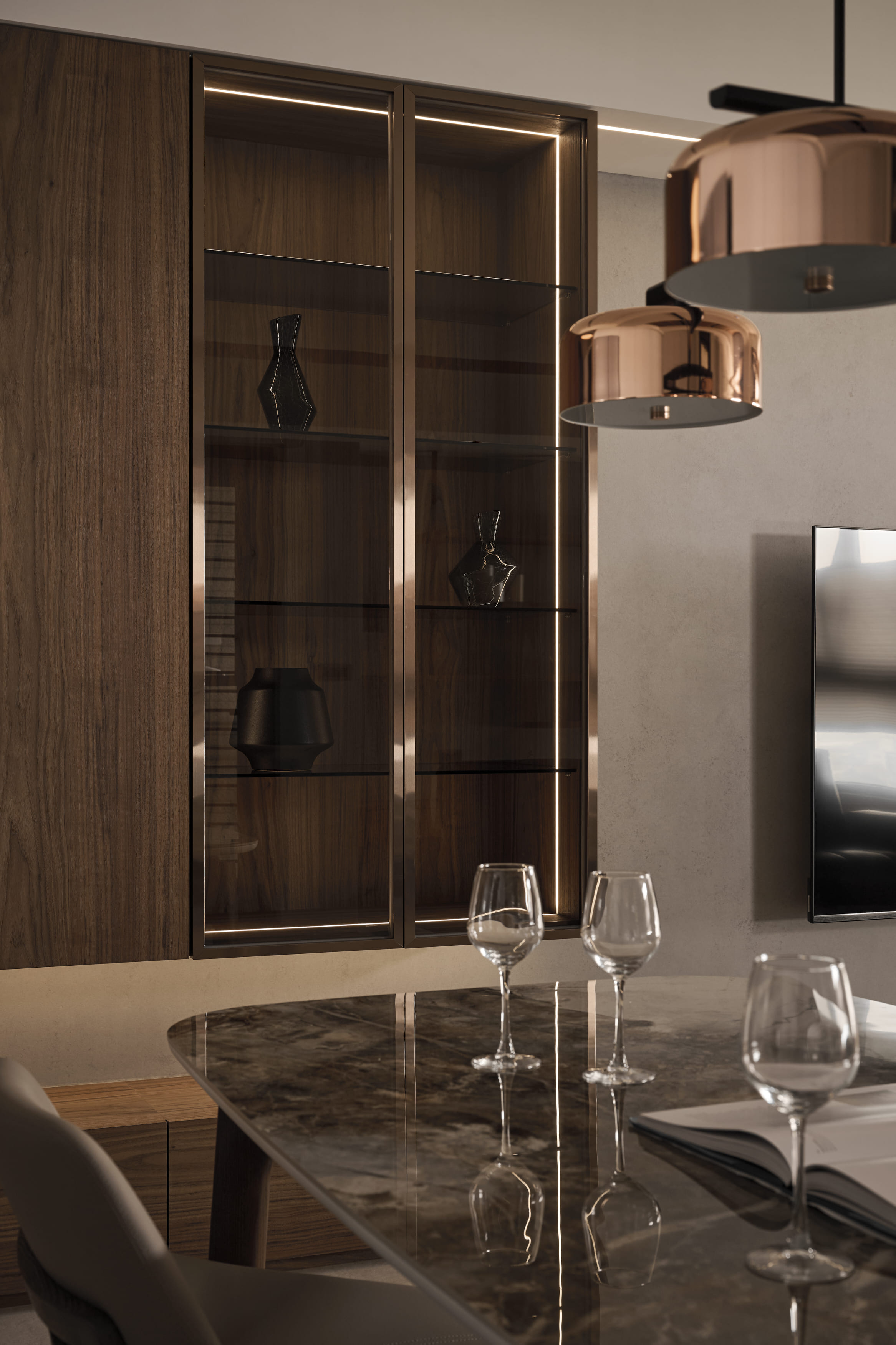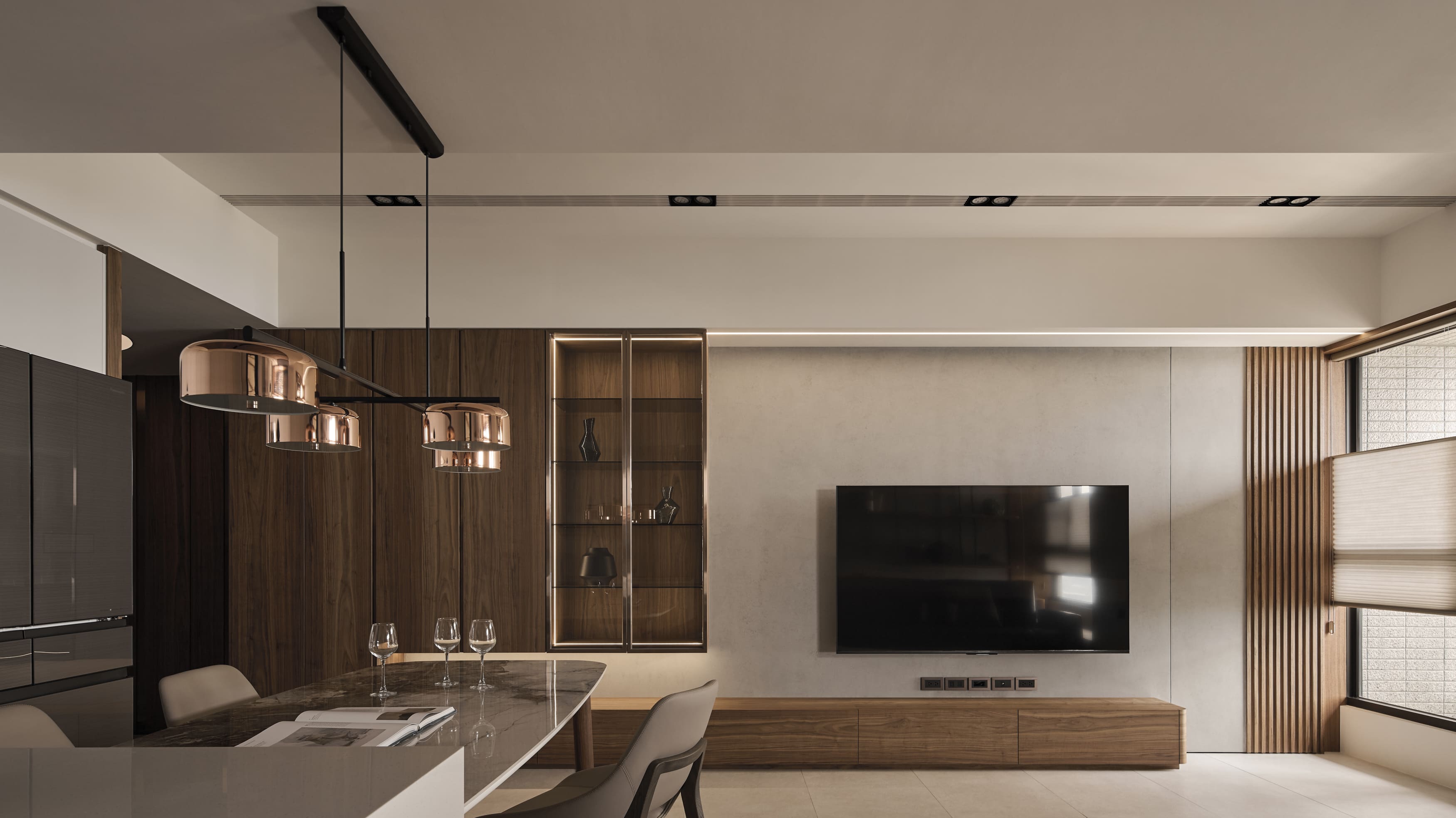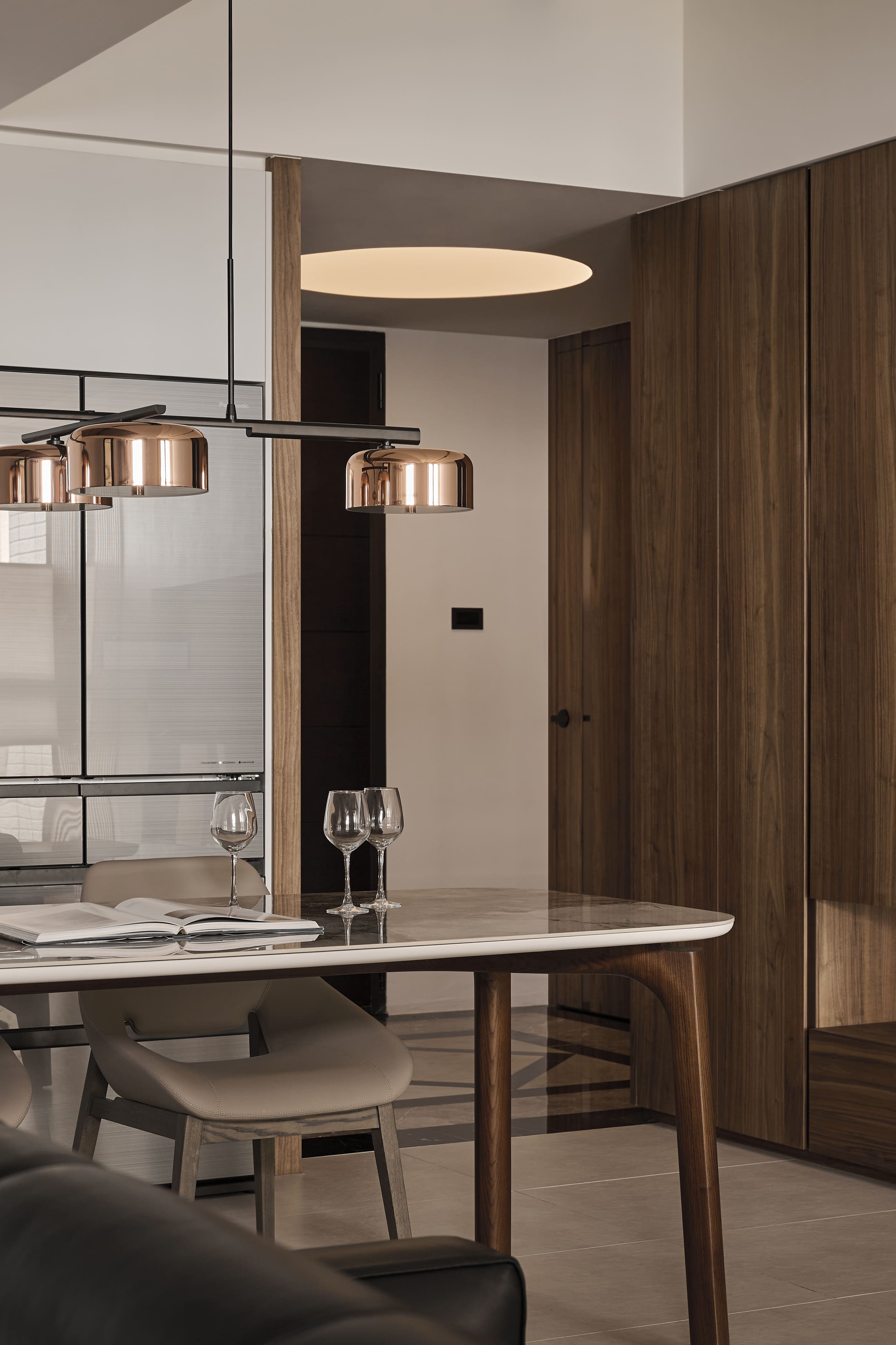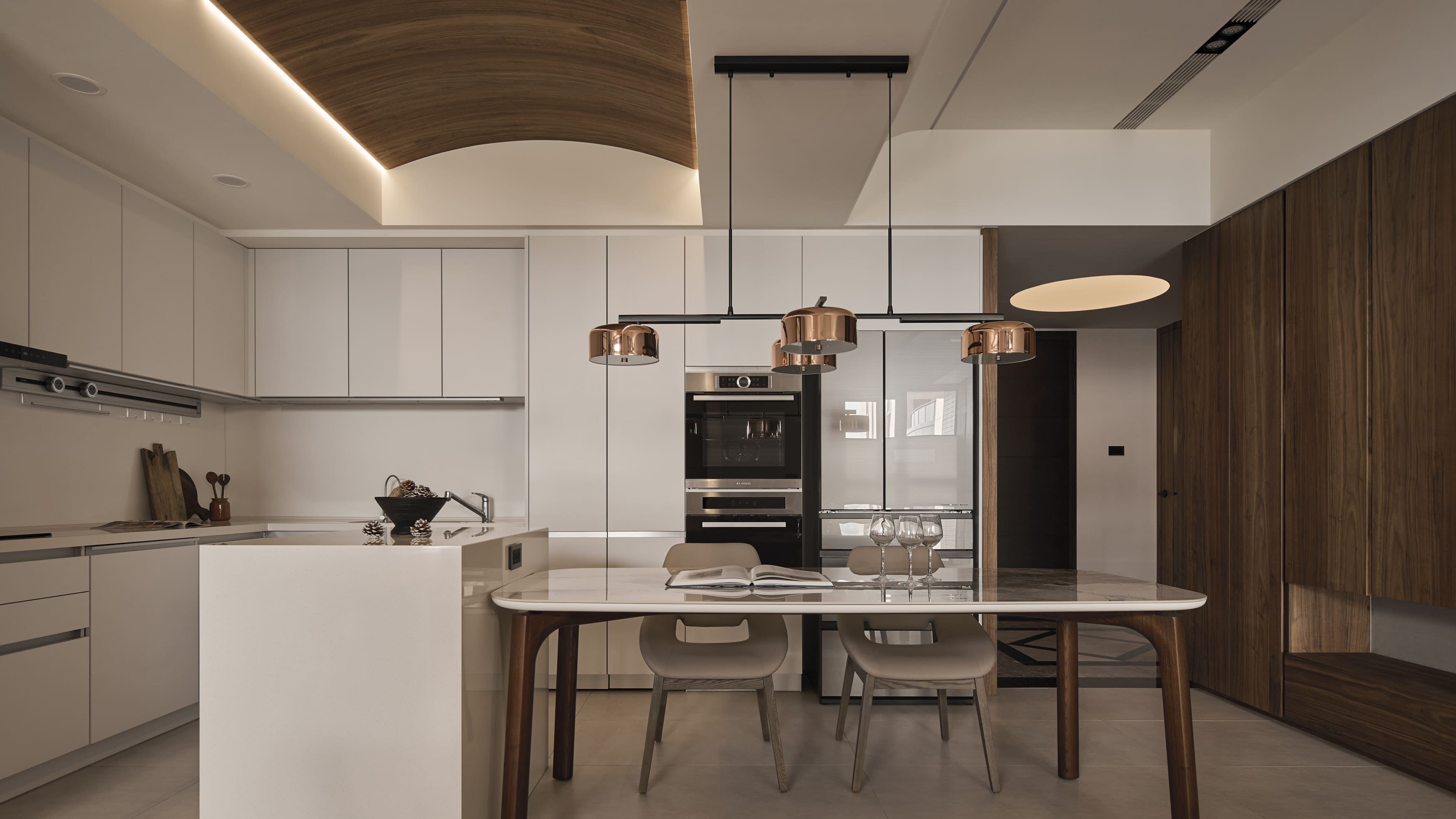 利用櫥櫃同色系的設計,外加金屬質感的吊燈點綴,讓餐桌也能是個充滿溫馨的場所,廚房旁的客浴善用廚櫃作隱藏門的方式,增加空間視覺的和諧感。黑色鐵件層架當背景,加上深色系的家具,更顯沉著穩重,帶來時尚又有個性的效果。