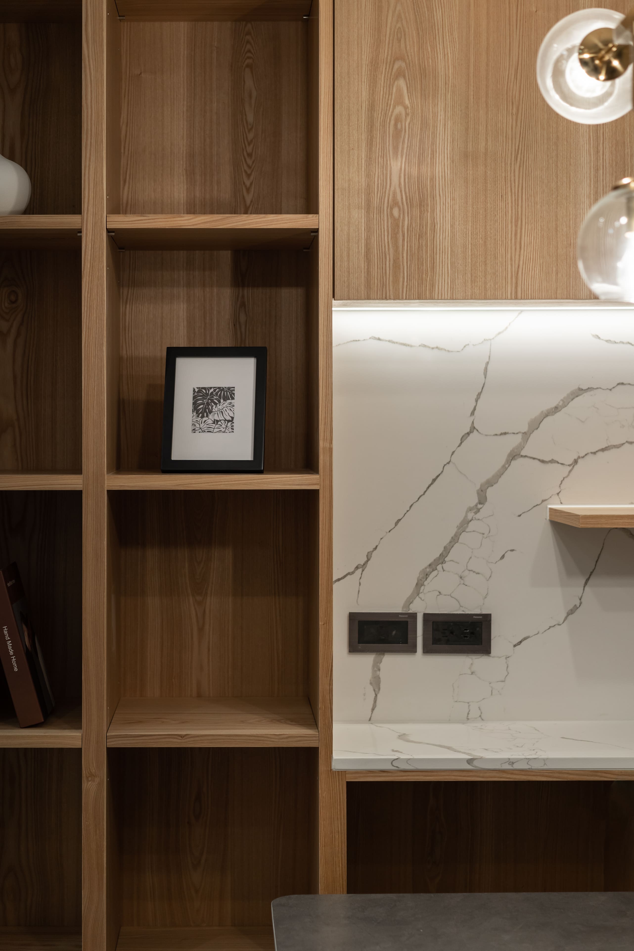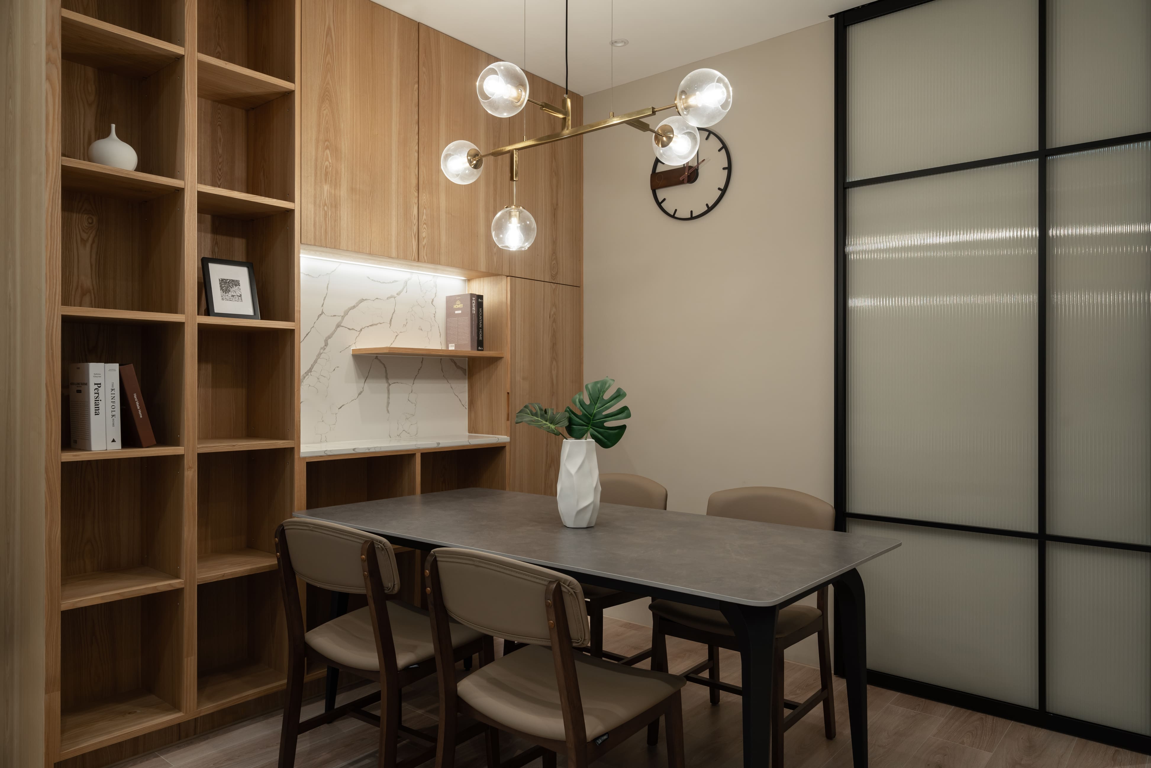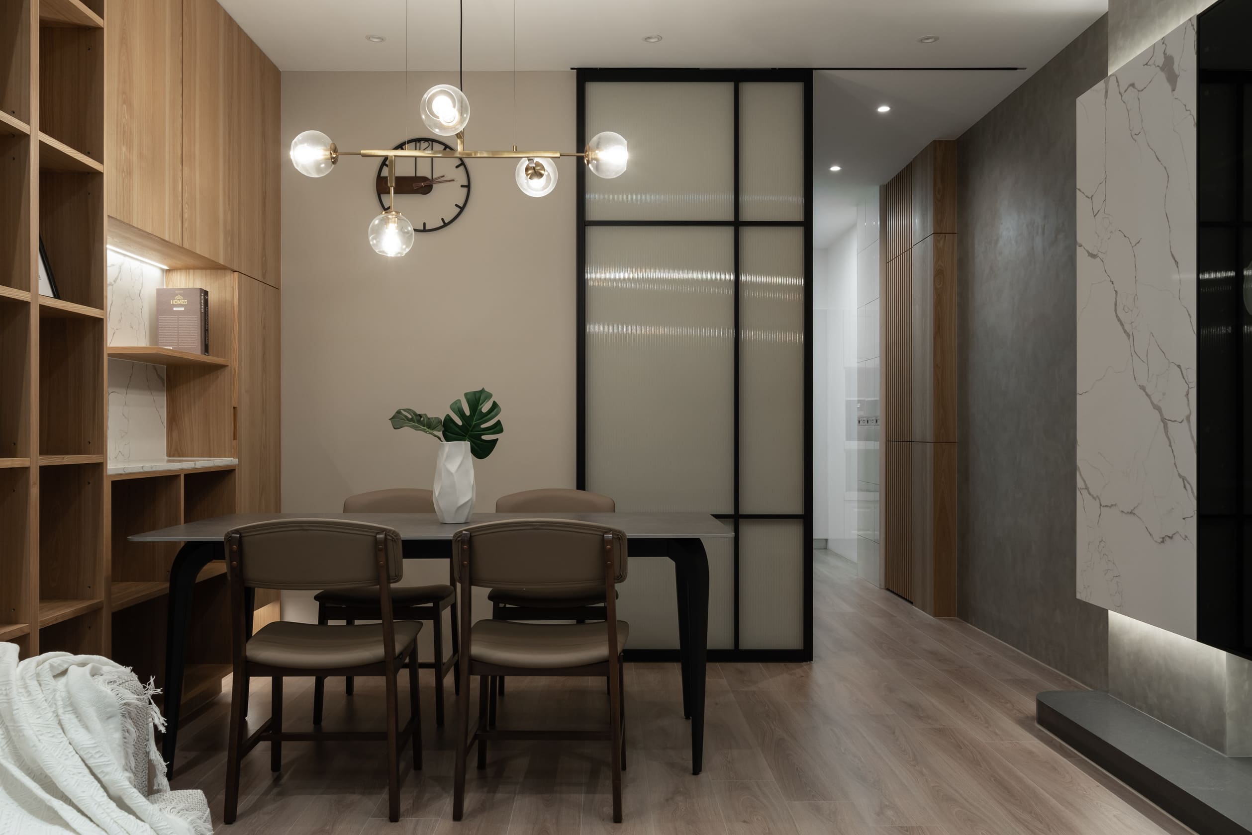 框架線條構建出雅趣呈現,與柔滑灰石組成給予發揮料理的想像力;墨黑線畫邊對付輕淡木紋支撐,佇立周遭物件與布料的自然垂釣,迎著光線感受相互輝映的唱和;一筆溫暖劃圓弧的色彩遍及空間,滑順沉著的木質地與白花紋灰石依附,暗自影響空間的力度,隨著透入光線垂落灑下,各自的美麗又顯而易見。