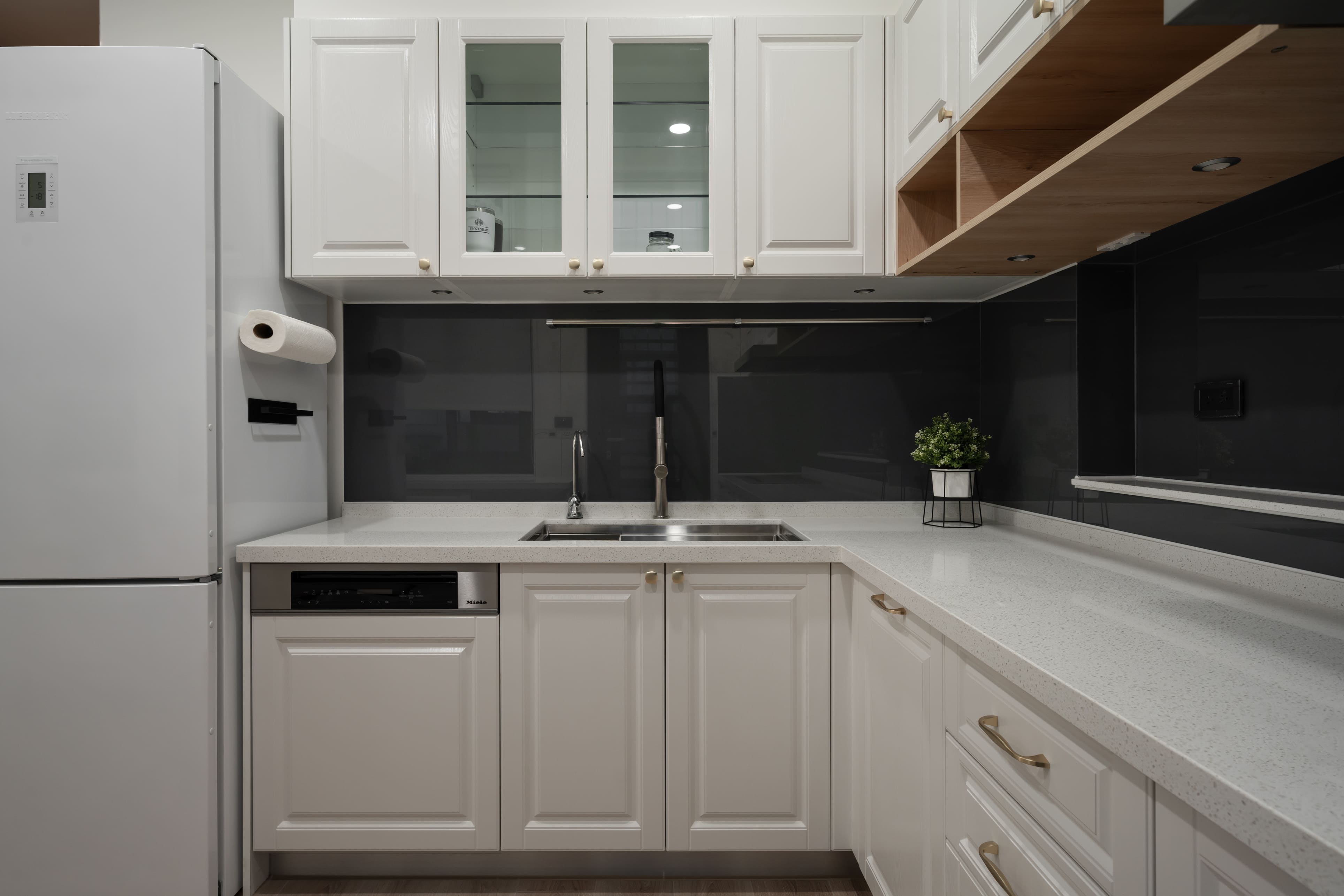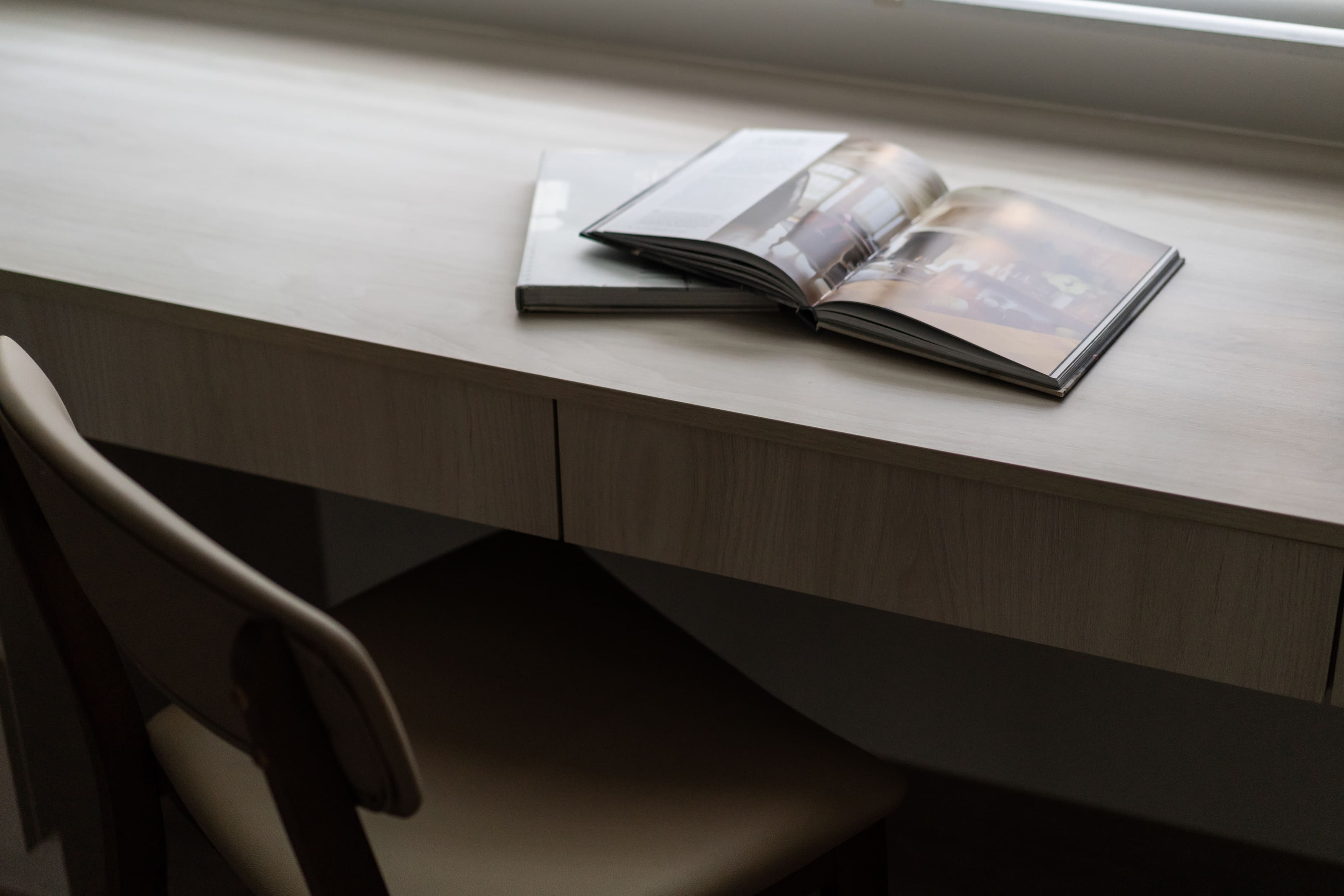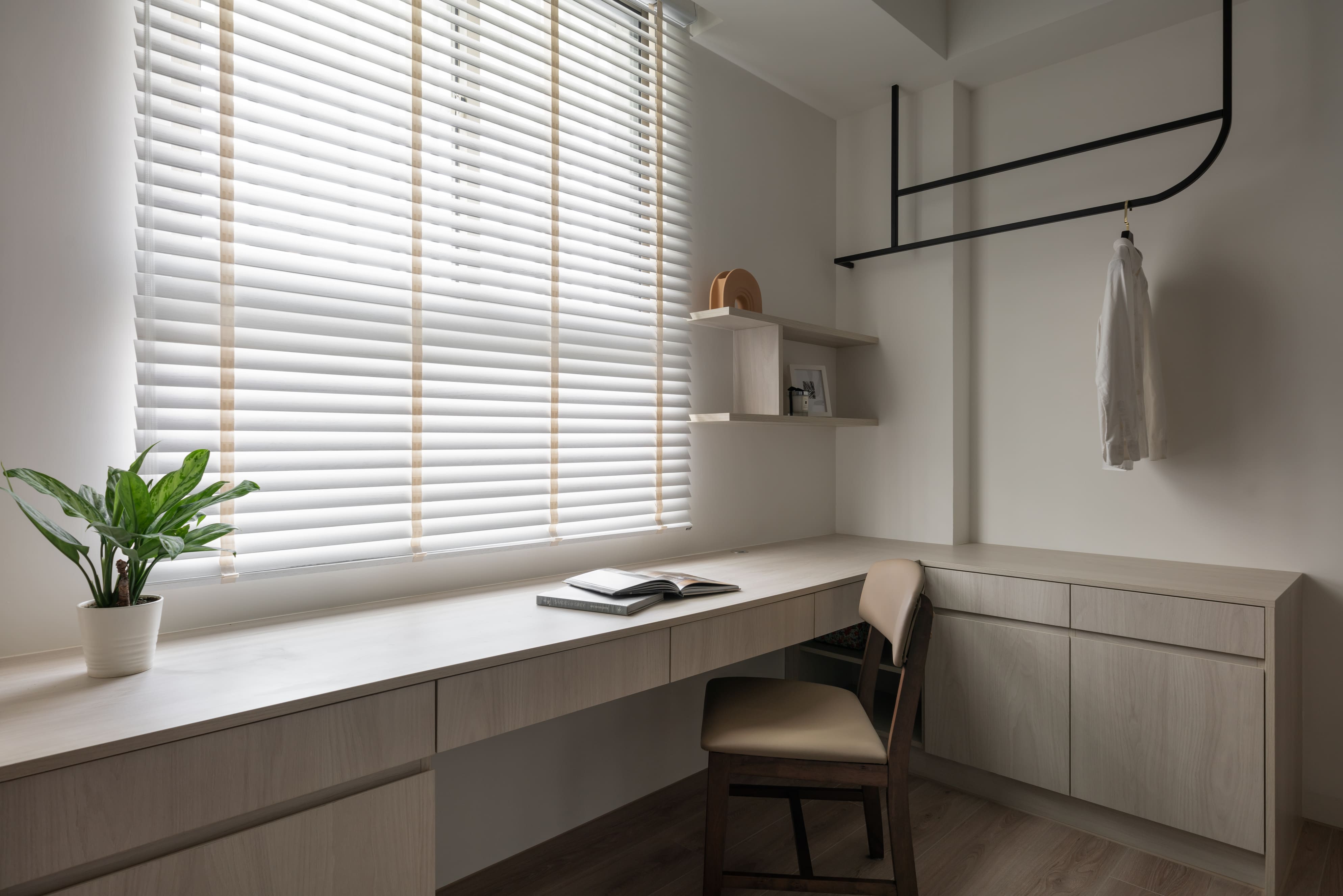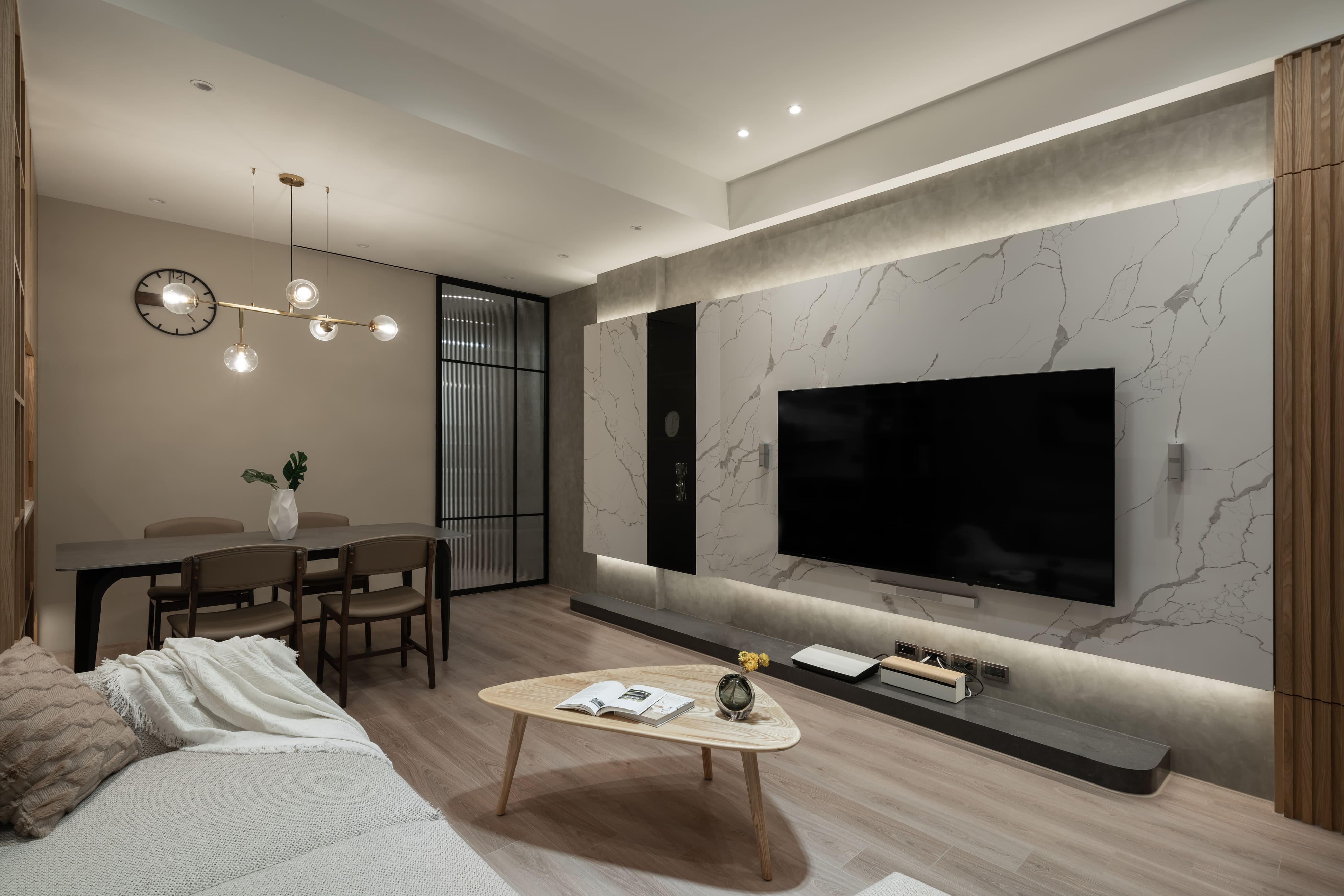 框架線條構建出雅趣呈現,與柔滑灰石組成給予發揮料理的想像力;墨黑線畫邊對付輕淡木紋支撐,佇立周遭物件與布料的自然垂釣,迎著光線感受相互輝映的唱和;一筆溫暖劃圓弧的色彩遍及空間,滑順沉著的木質地與白花紋灰石依附,暗自影響空間的力度,隨著透入光線垂落灑下,各自的美麗又顯而易見。