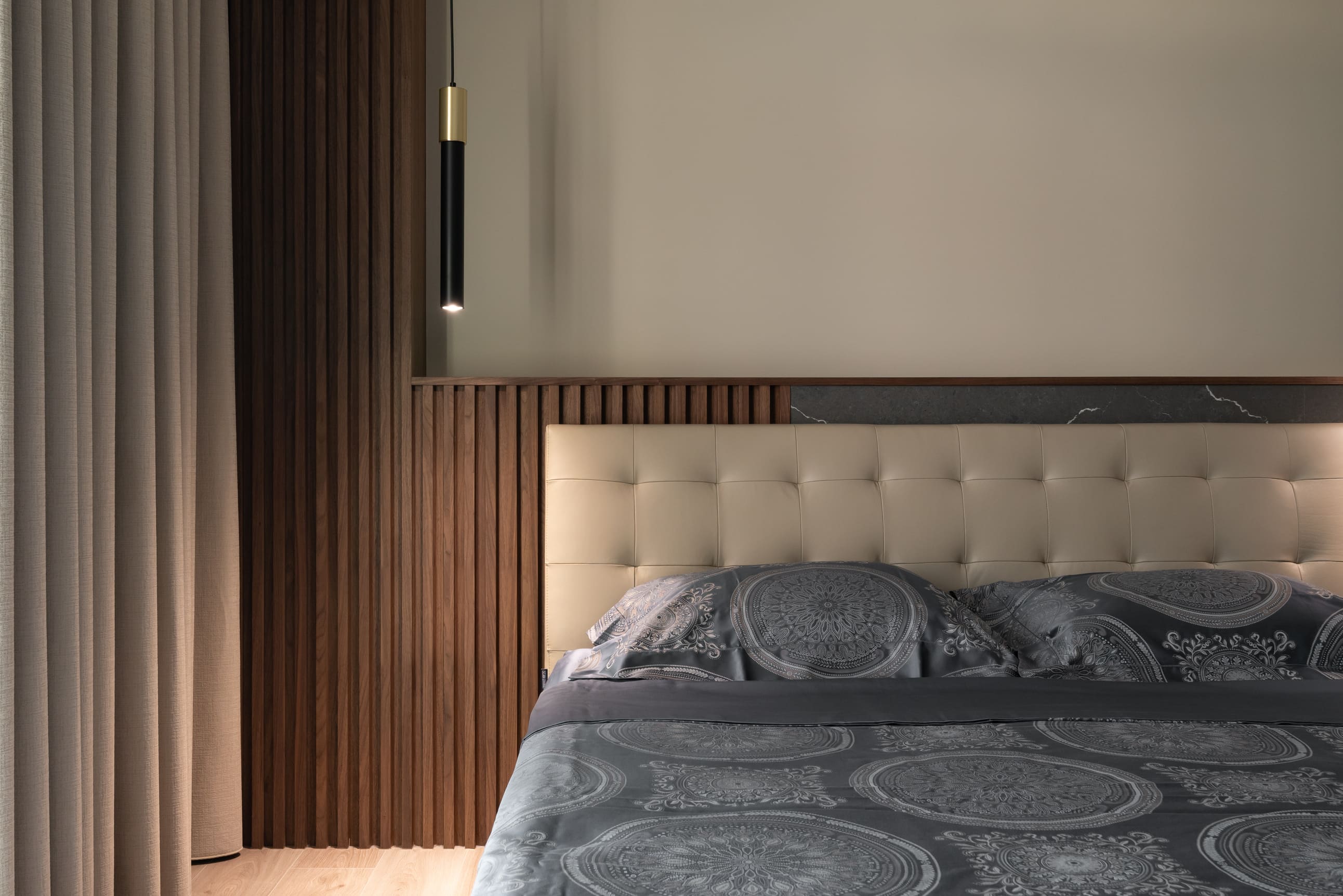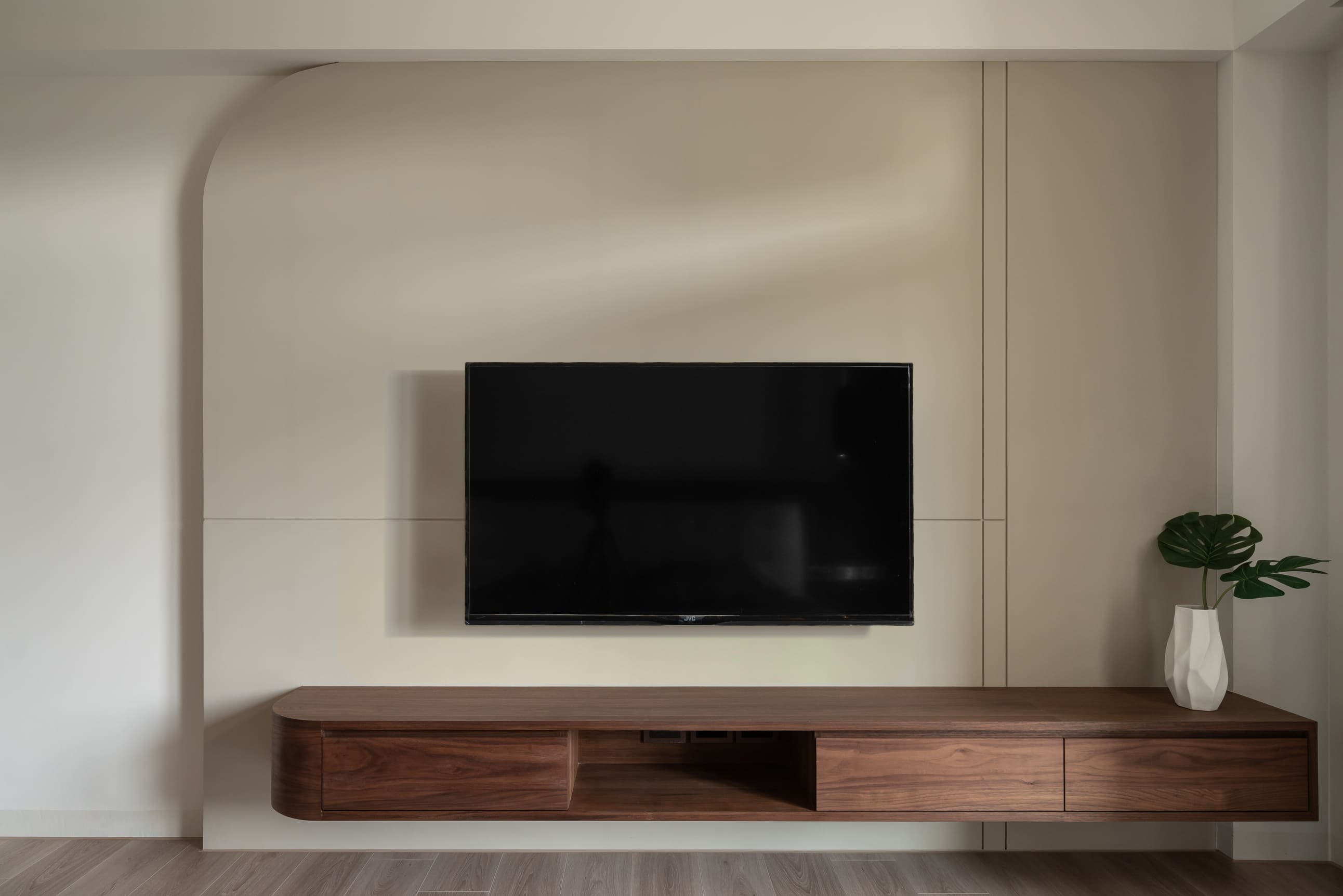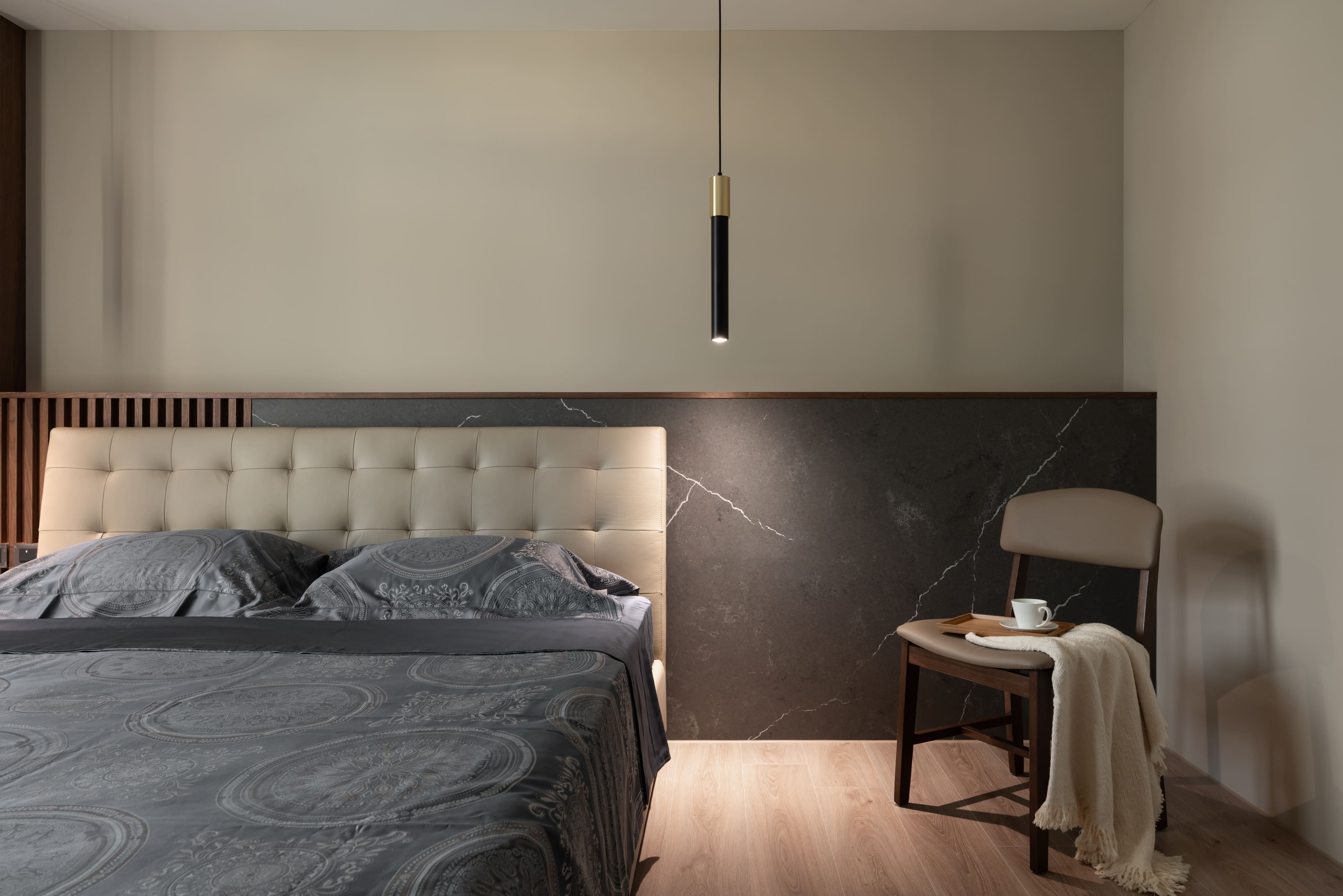 踩進平滑木質紋路中,見面貌似不對稱卻又包容的牆面,灰黑圓弧延伸至牆面的表現如自然山石漸進,退一步看似白石面渲染墨花的風貌,空間中木質線條如樹木般溫暖,周圍柔和溫煦的光照環繞著,穿插中和的暖色調與麻織紋布料,呈現出心靜中的平和。