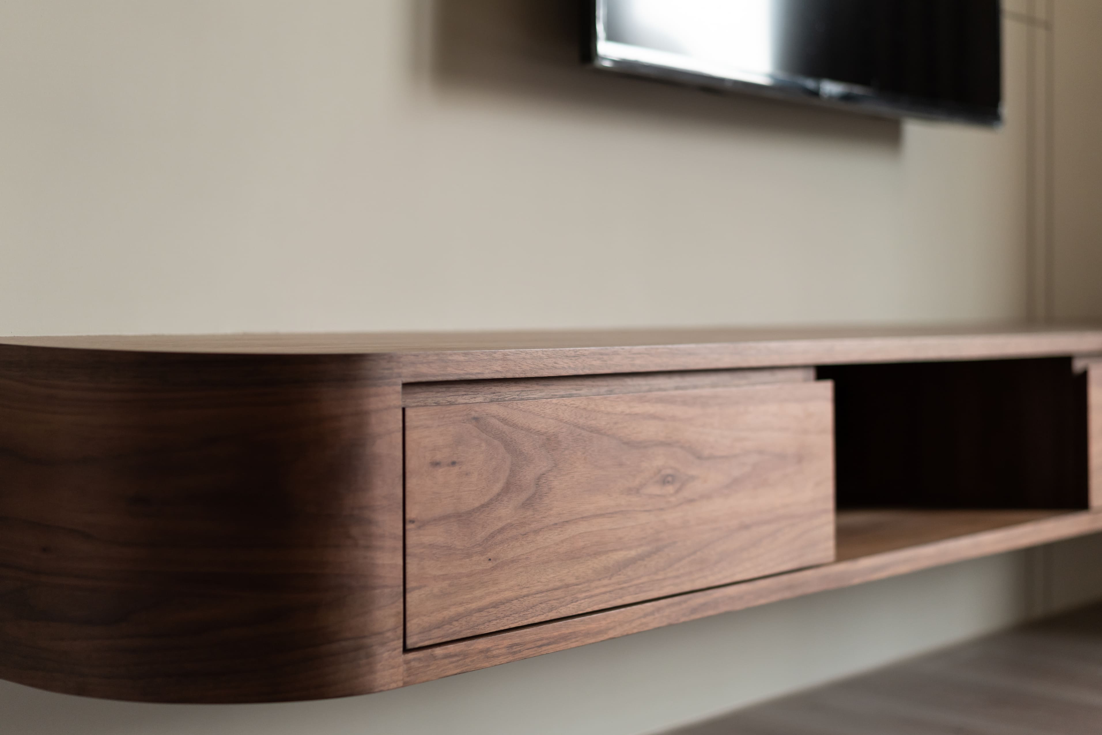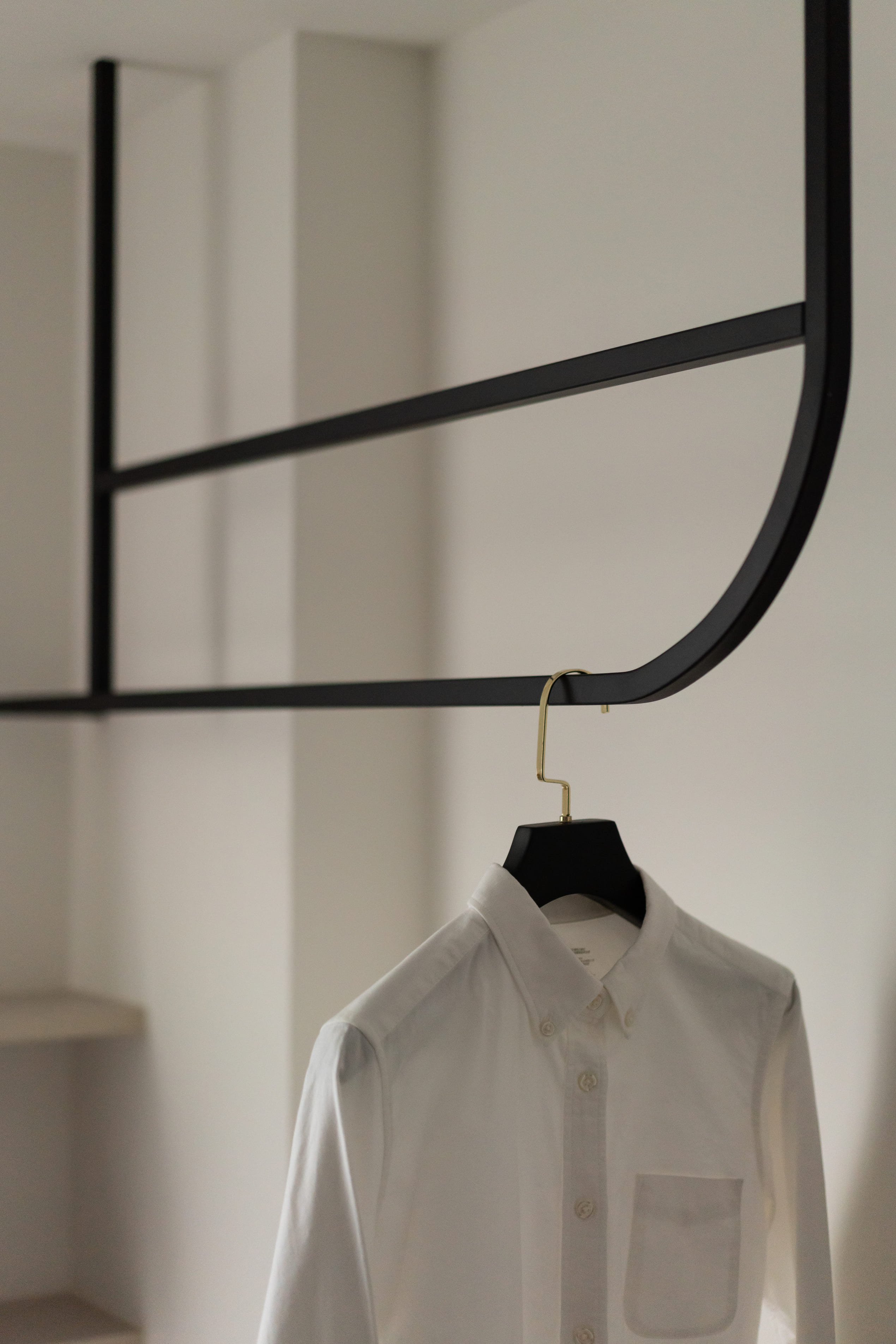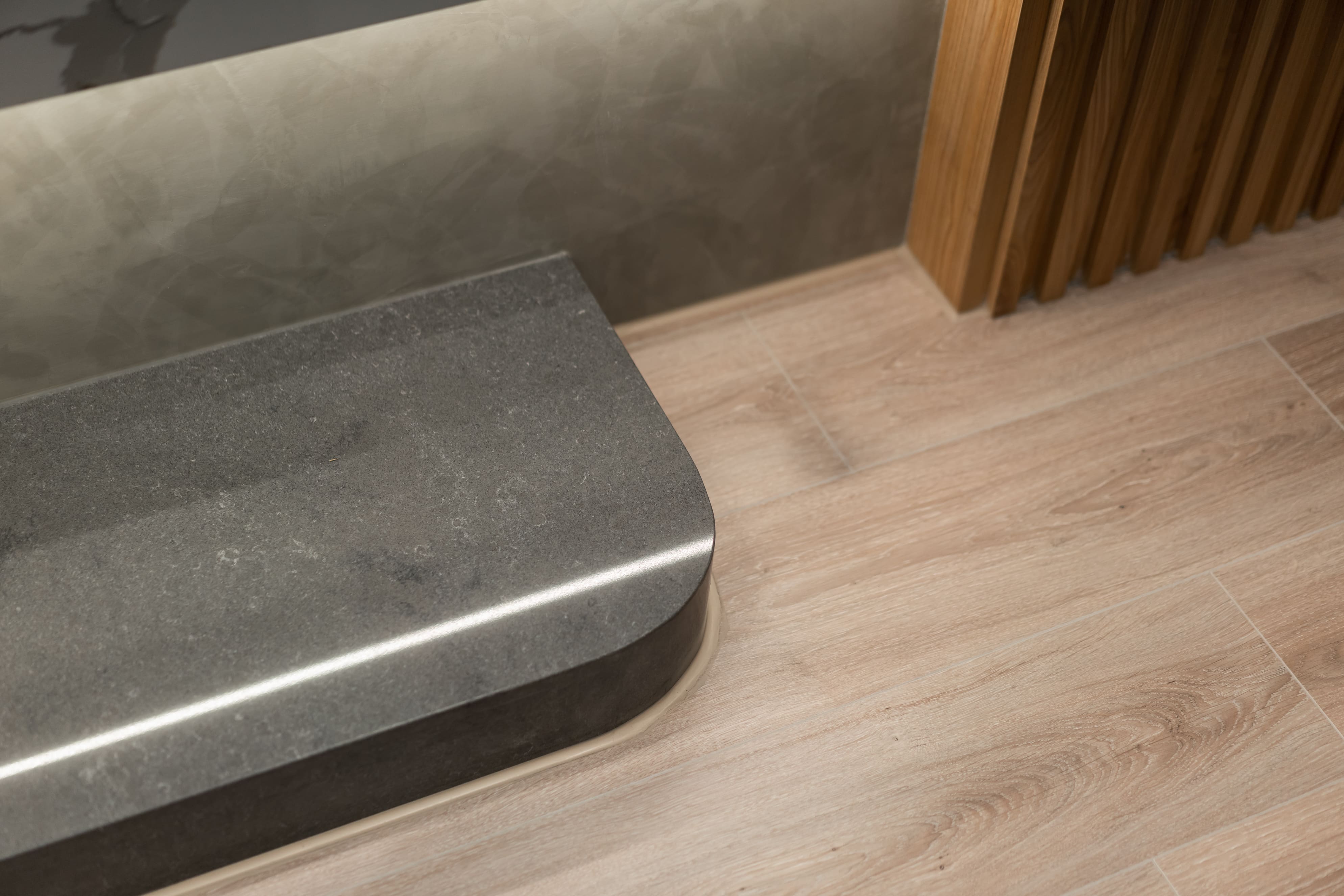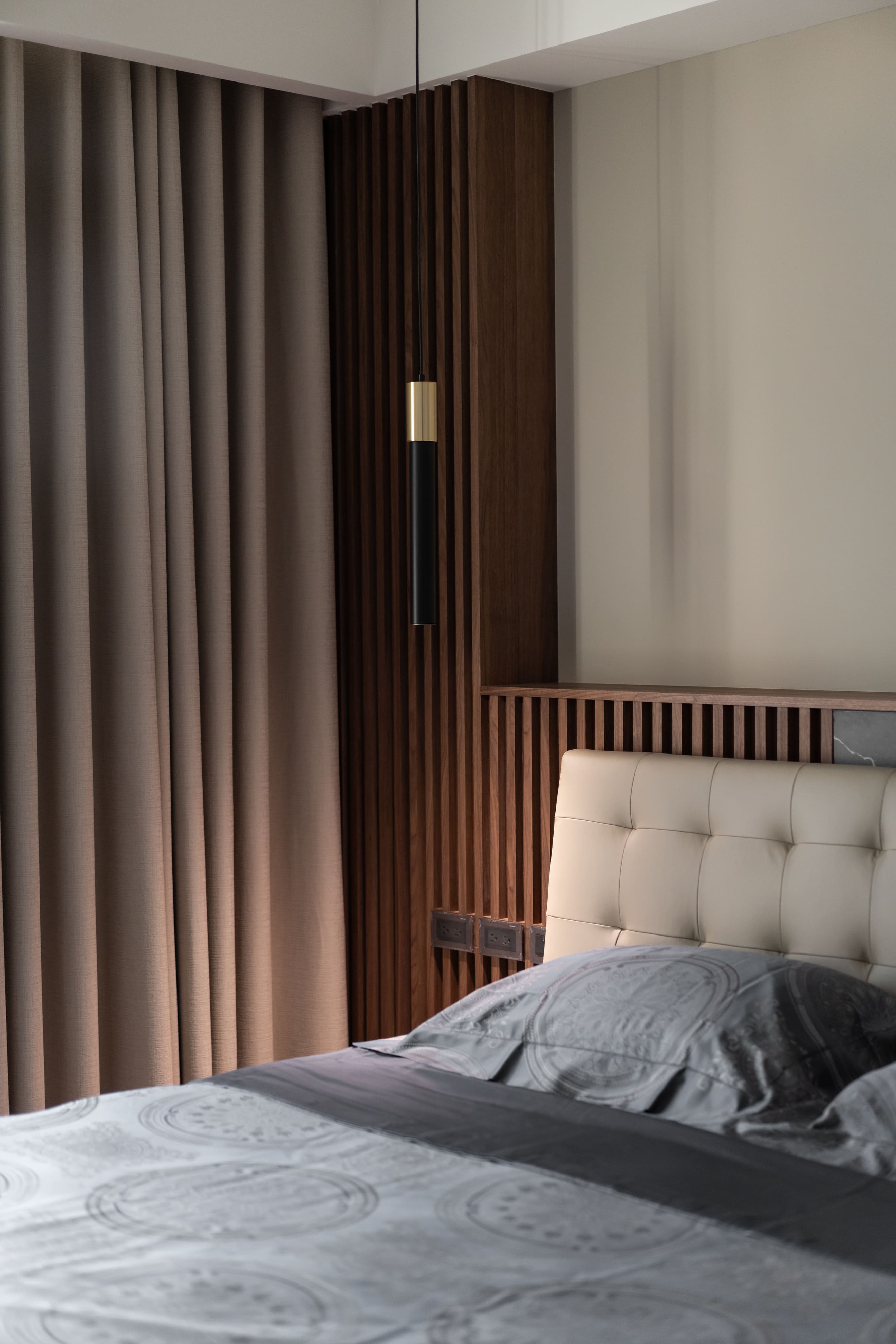 踩進平滑木質紋路中,見面貌似不對稱卻又包容的牆面,灰黑圓弧延伸至牆面的表現如自然山石漸進,退一步看似白石面渲染墨花的風貌,空間中木質線條如樹木般溫暖,周圍柔和溫煦的光照環繞著,穿插中和的暖色調與麻織紋布料,呈現出心靜中的平和。