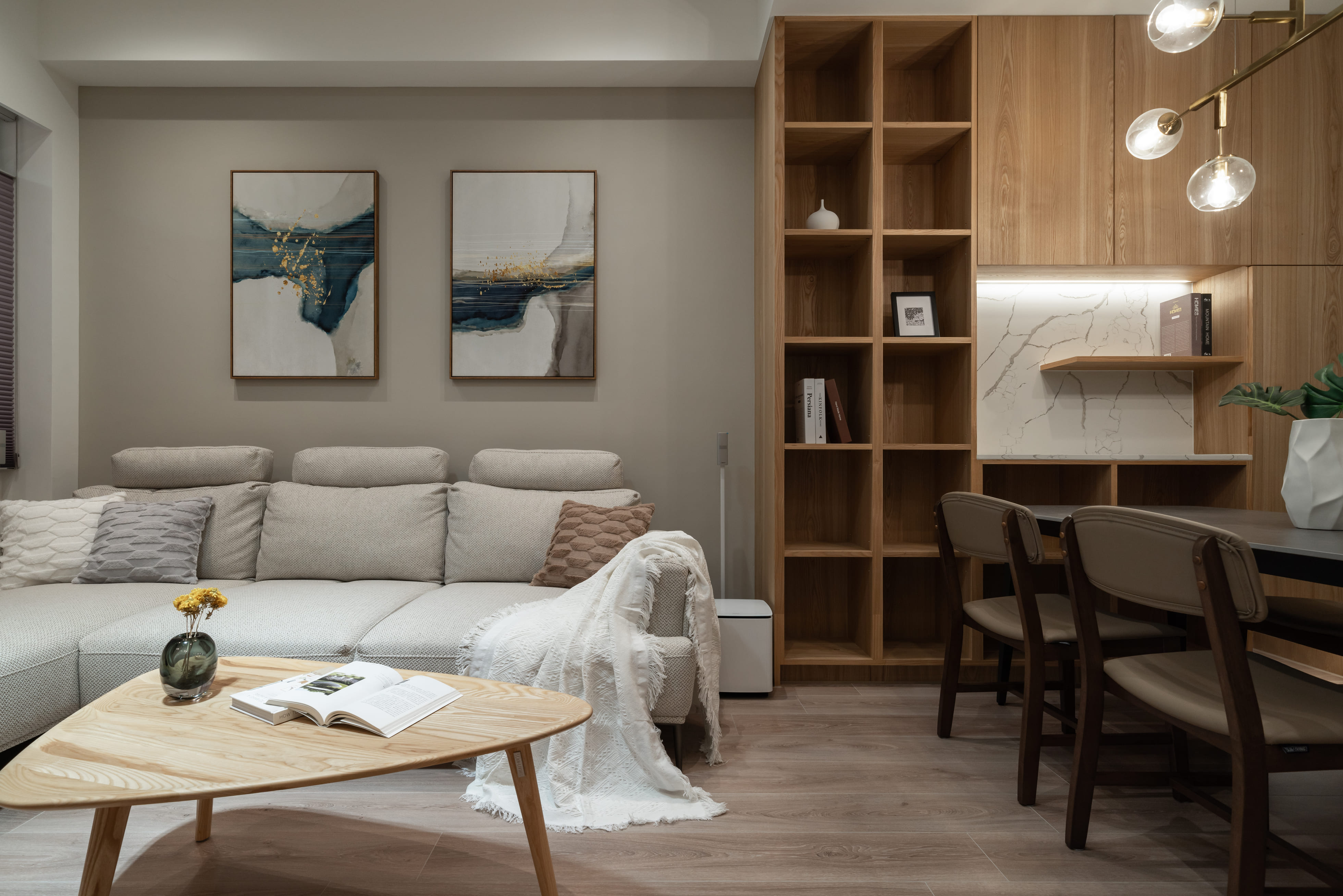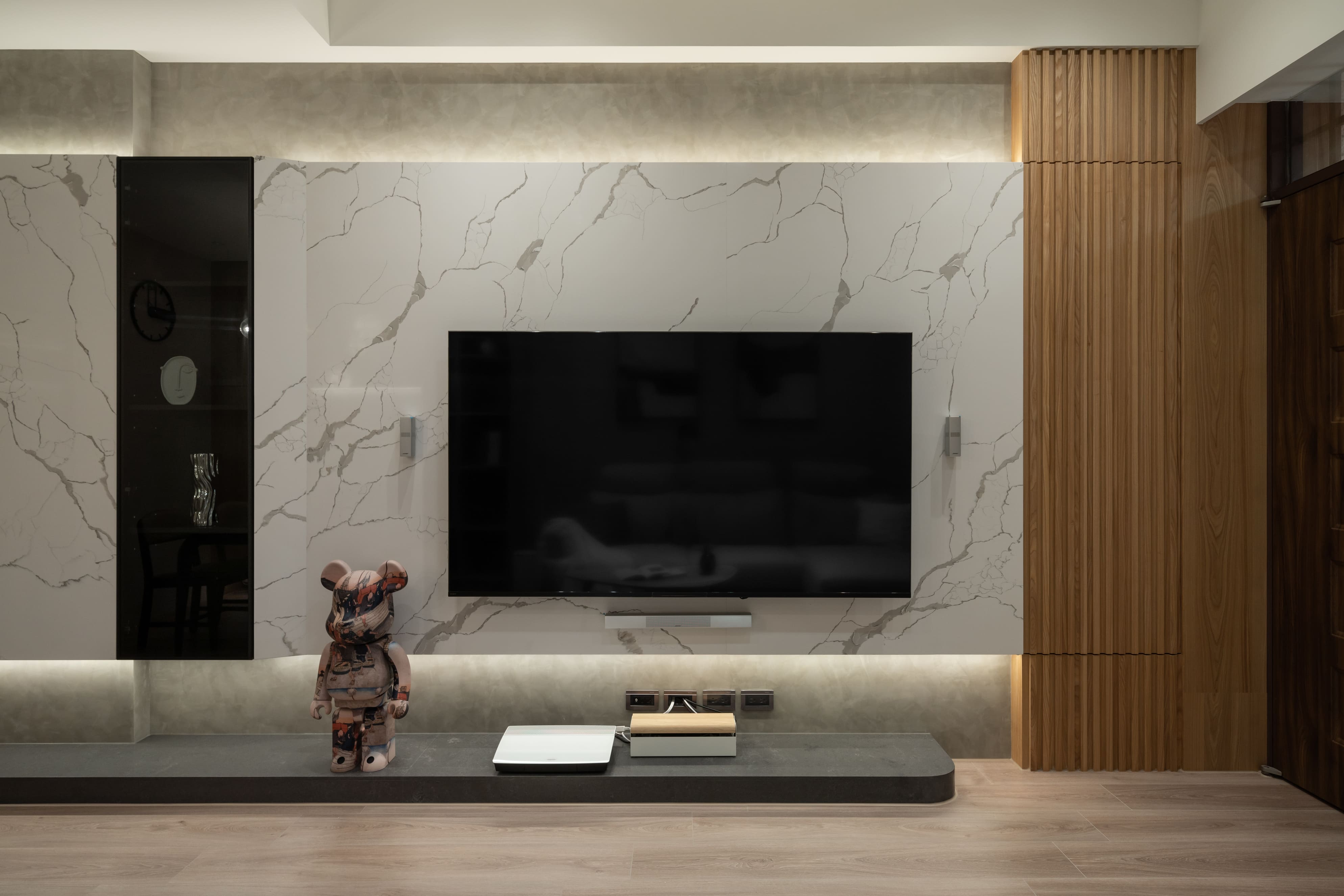 主要材料|帝雉石、灰泥塗料、系統櫃體、木皮、超耐磨木地板